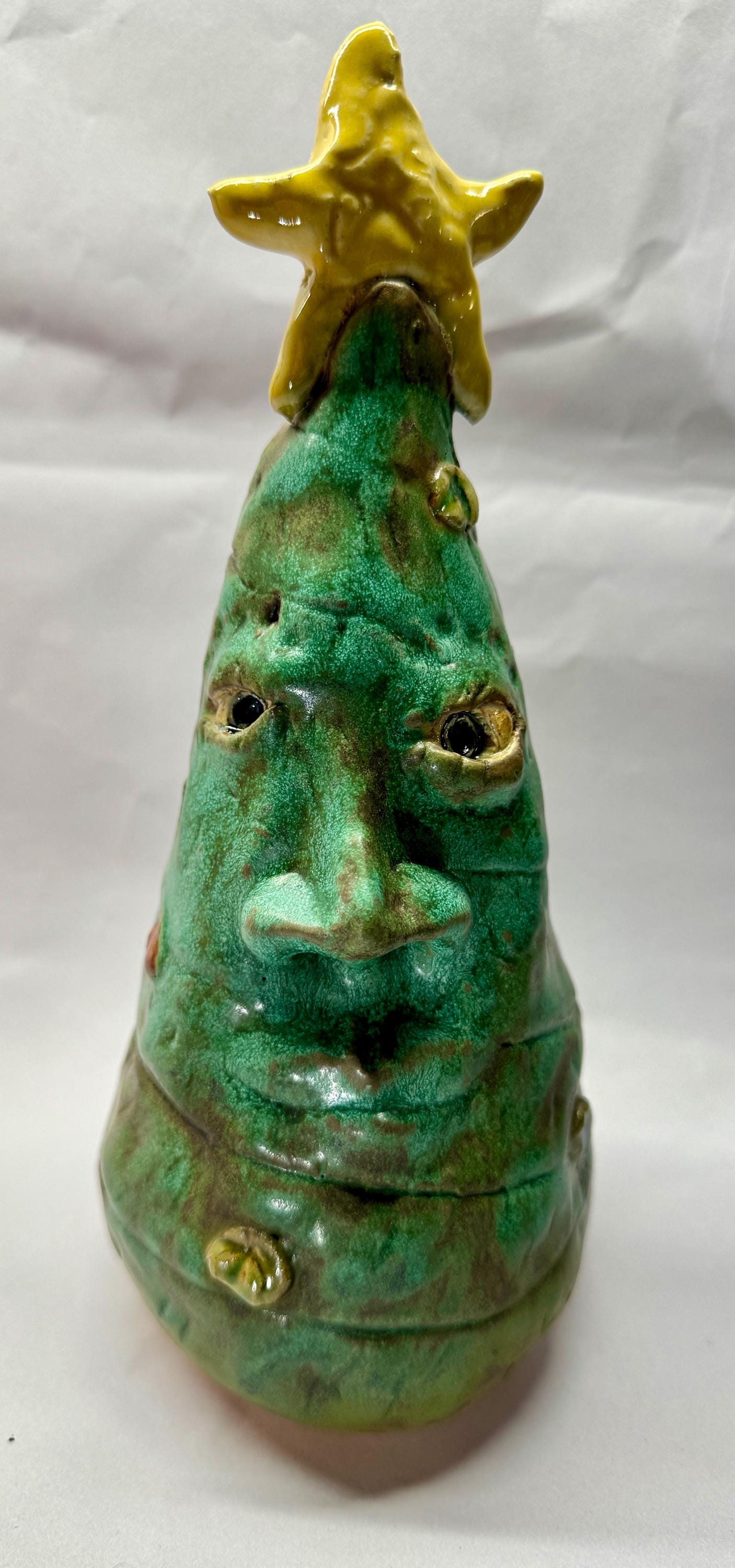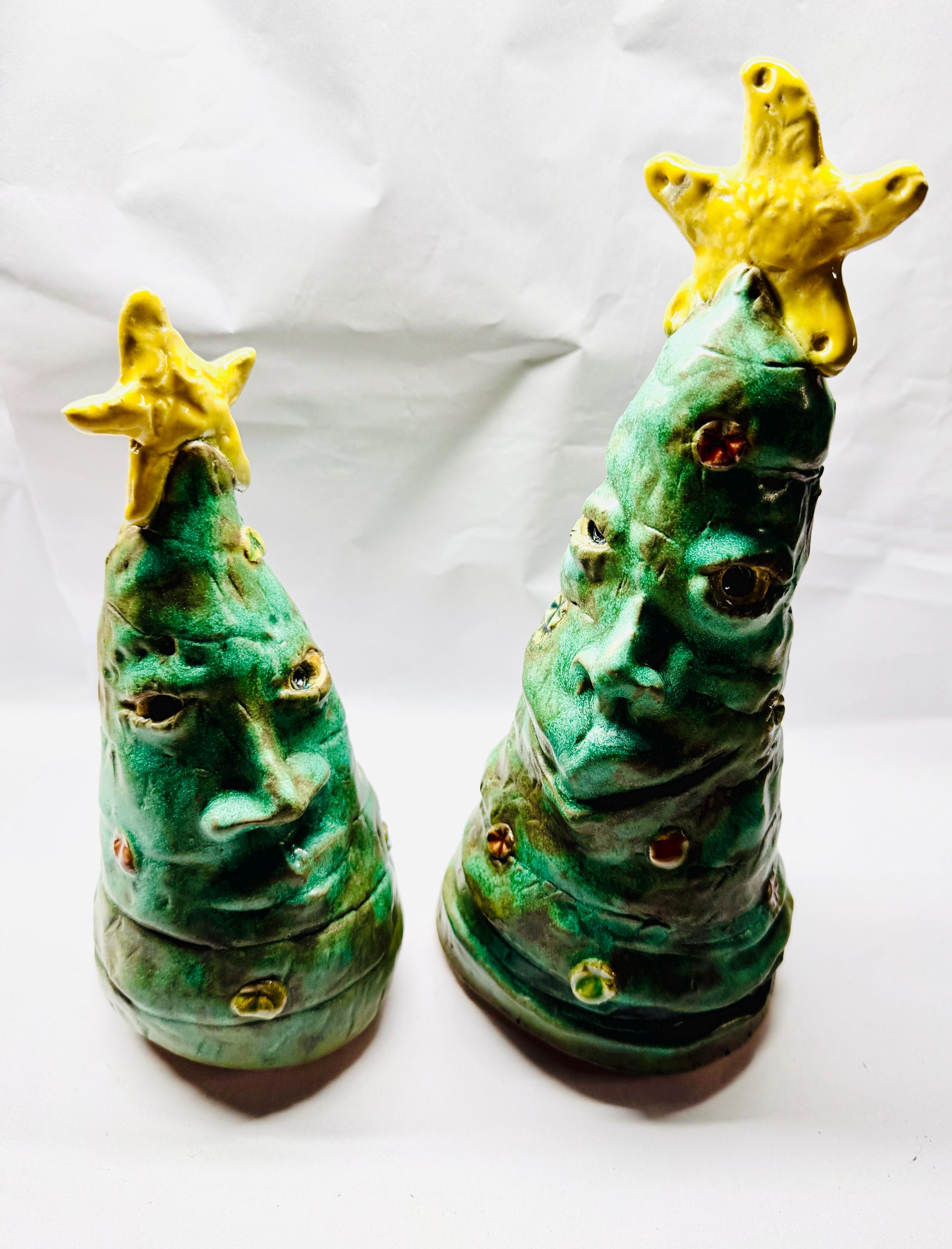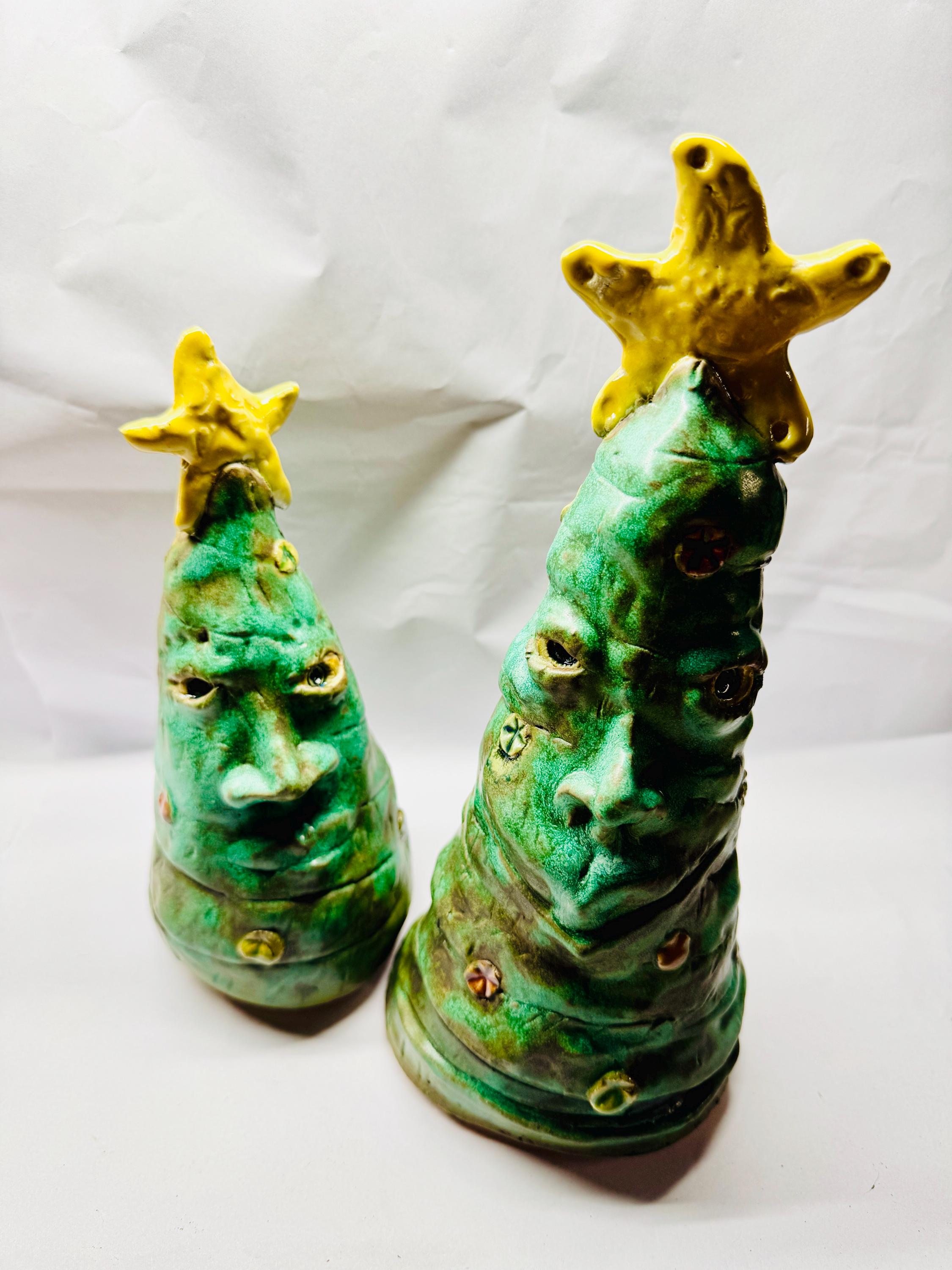 This listing is for 2 whimsical Christmas trees with happy faces to brighten your holiday. Each piece is adorned with colourful ornaments and a yellow tree topper.This handmade piece measures approximately 9” tall and 4”wide and 11” by 4”.