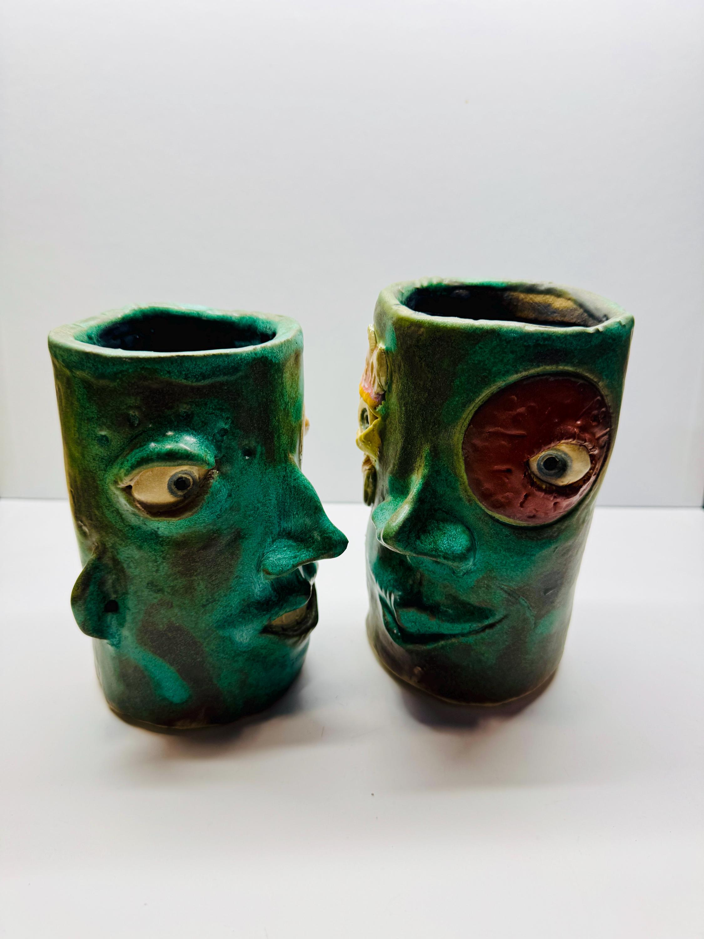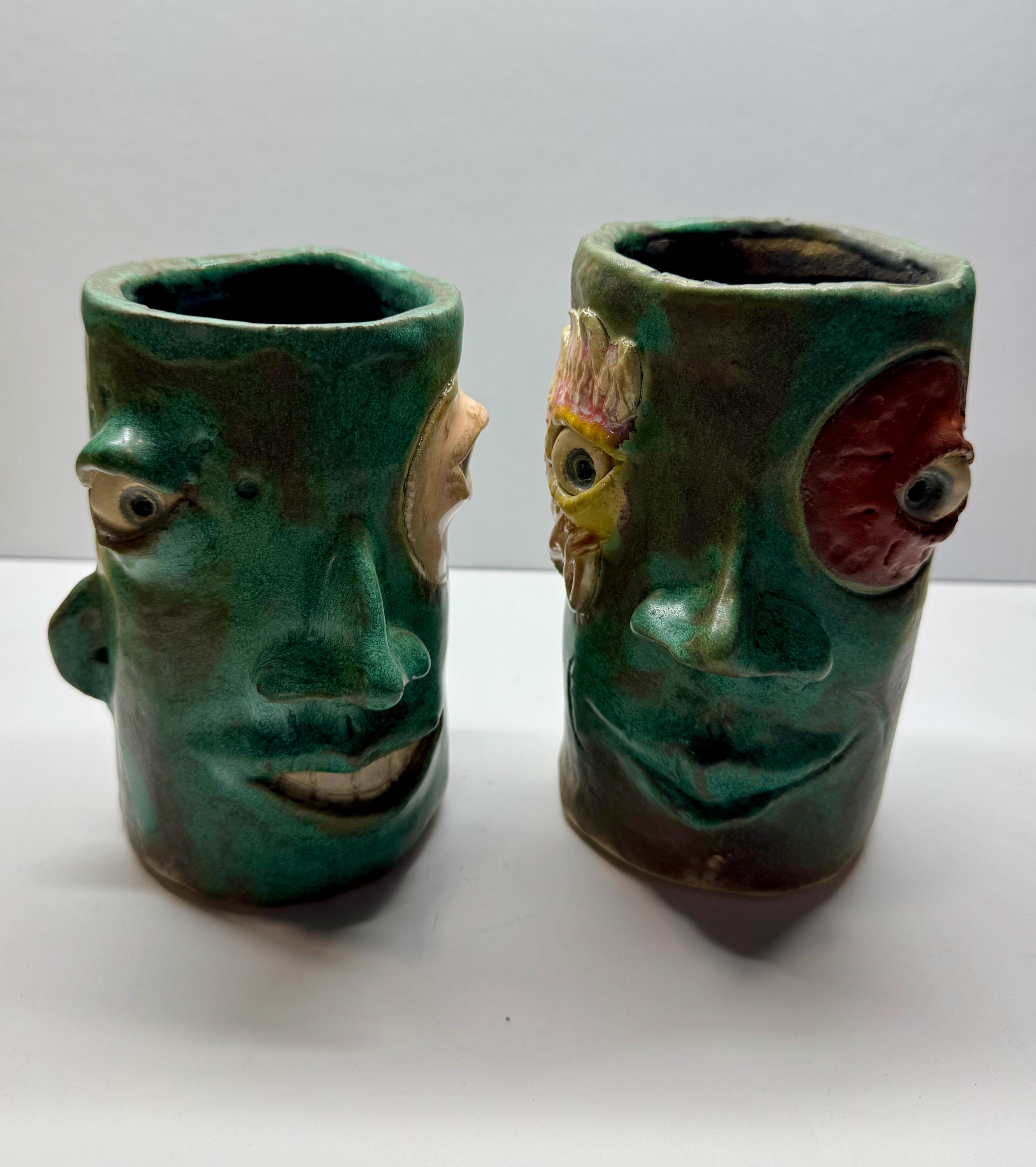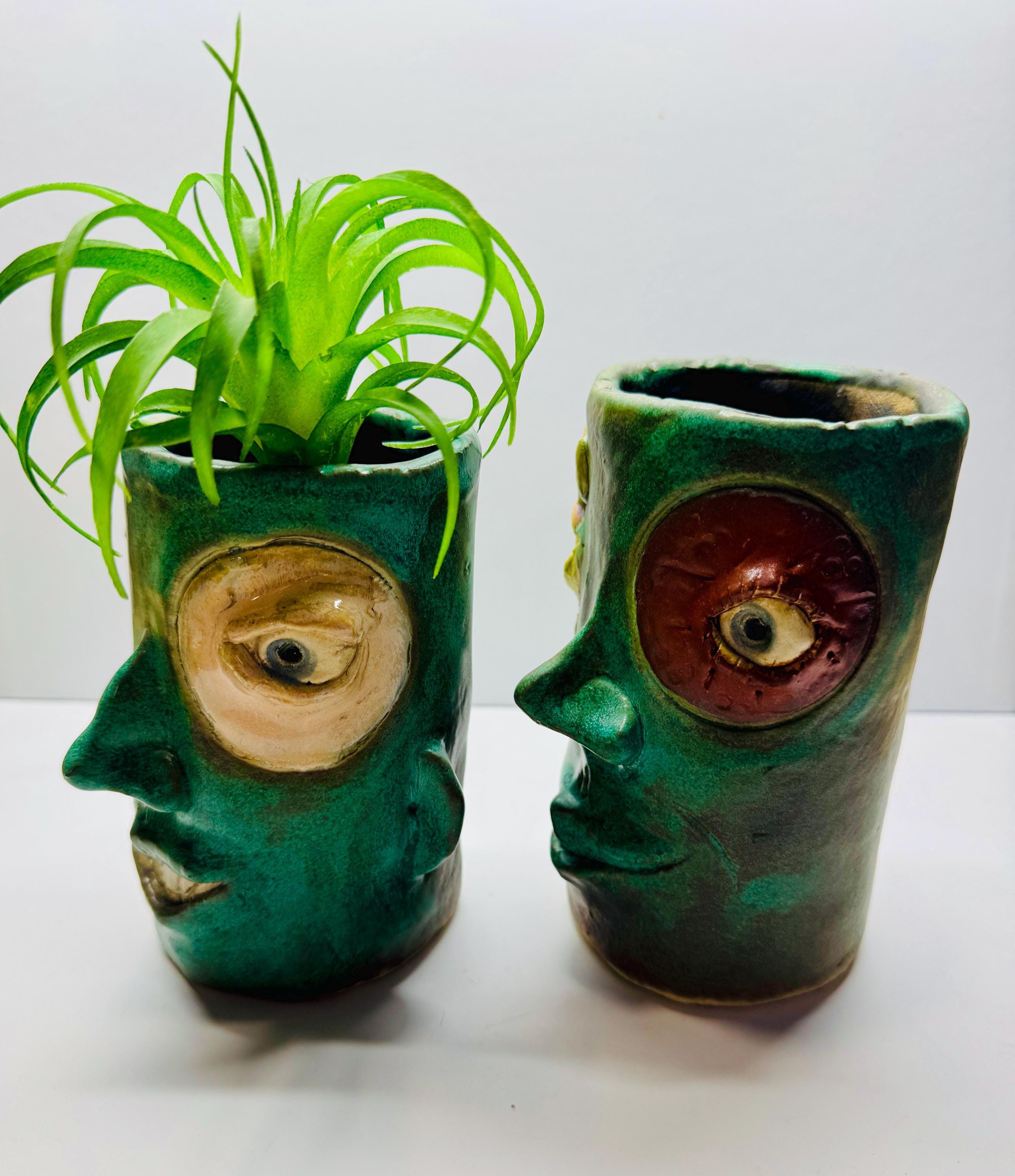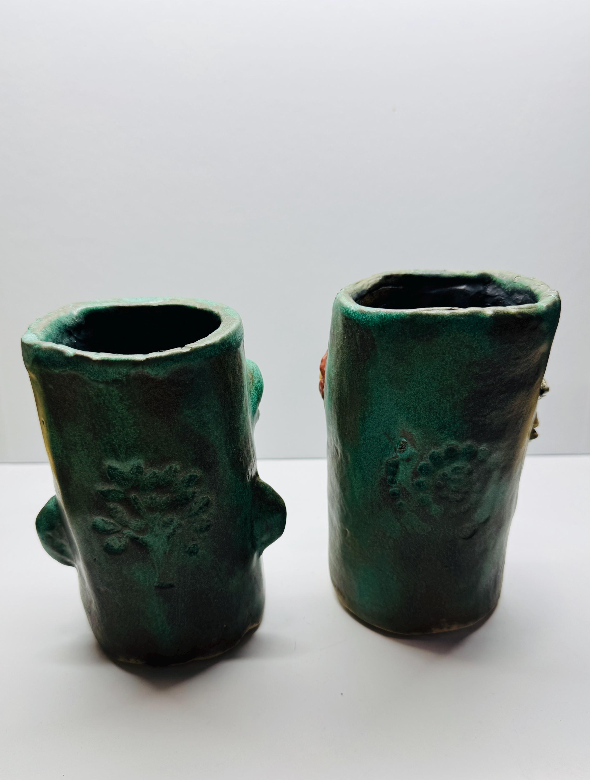 This listing is for 2 small pieces, The vases measures approximately 6” tall and 3” wide. Each is glazed in a mix of matte green glazes.Each piece has a whimsical face and is high fired to over 2200 degrees.