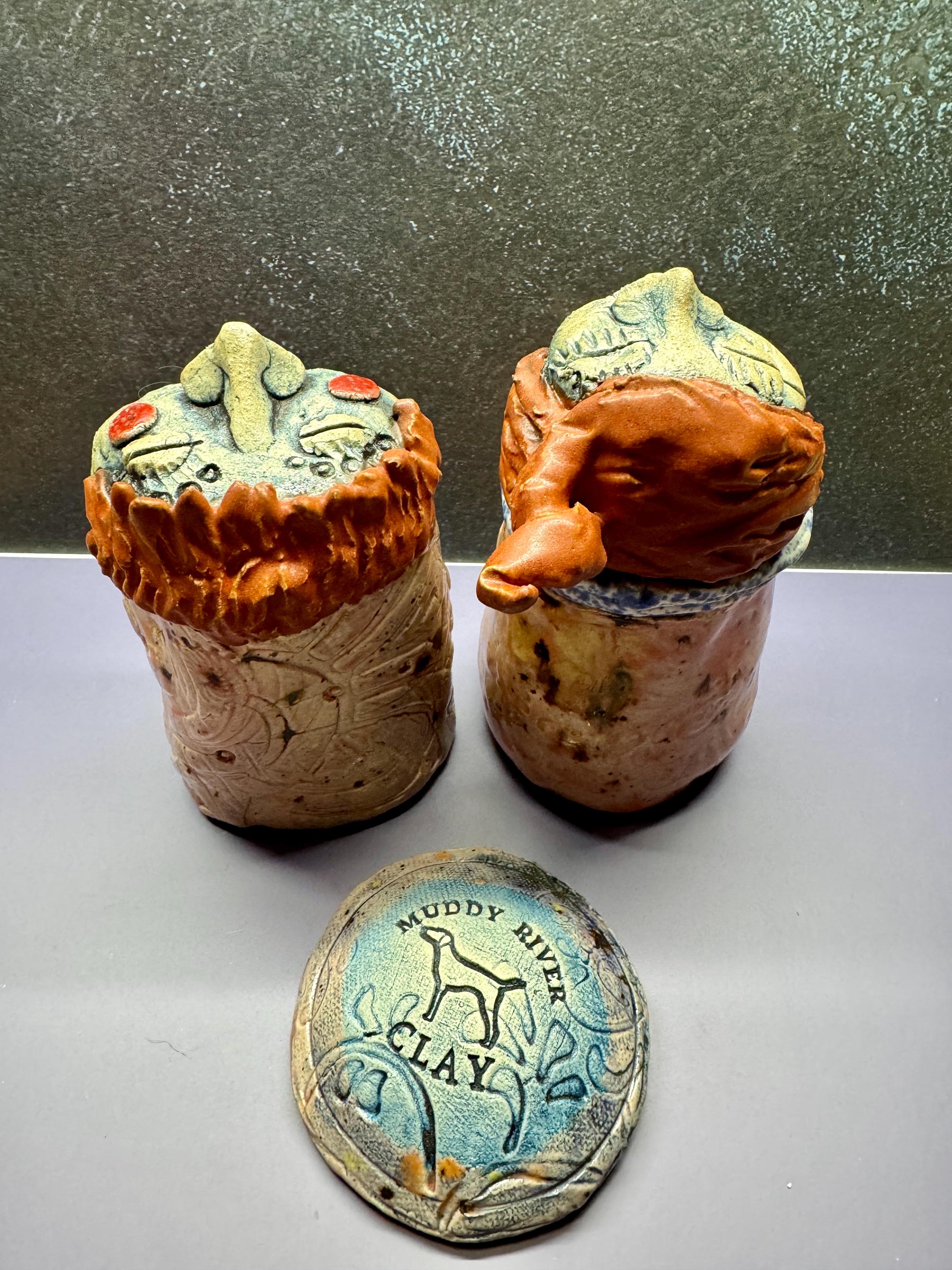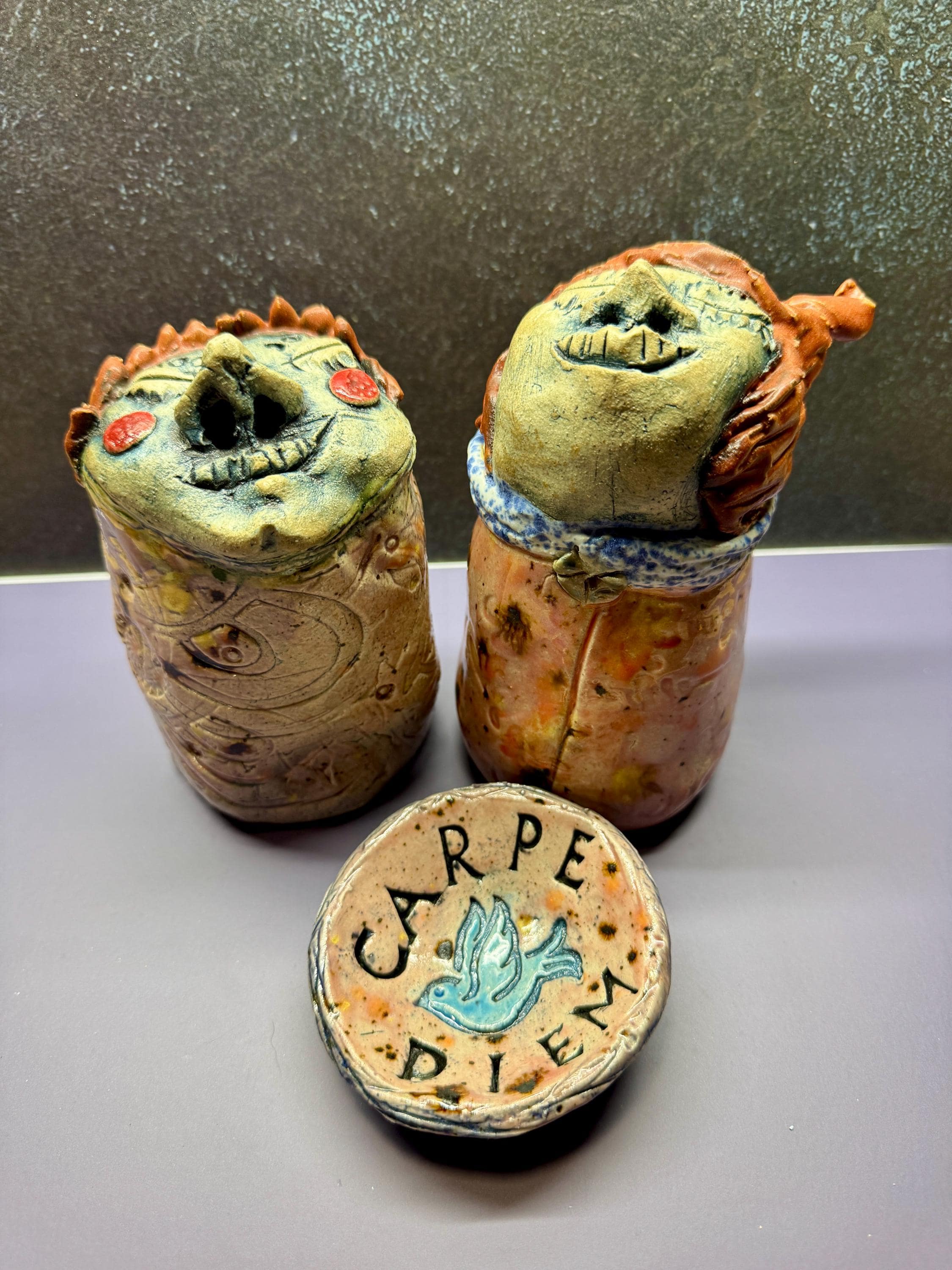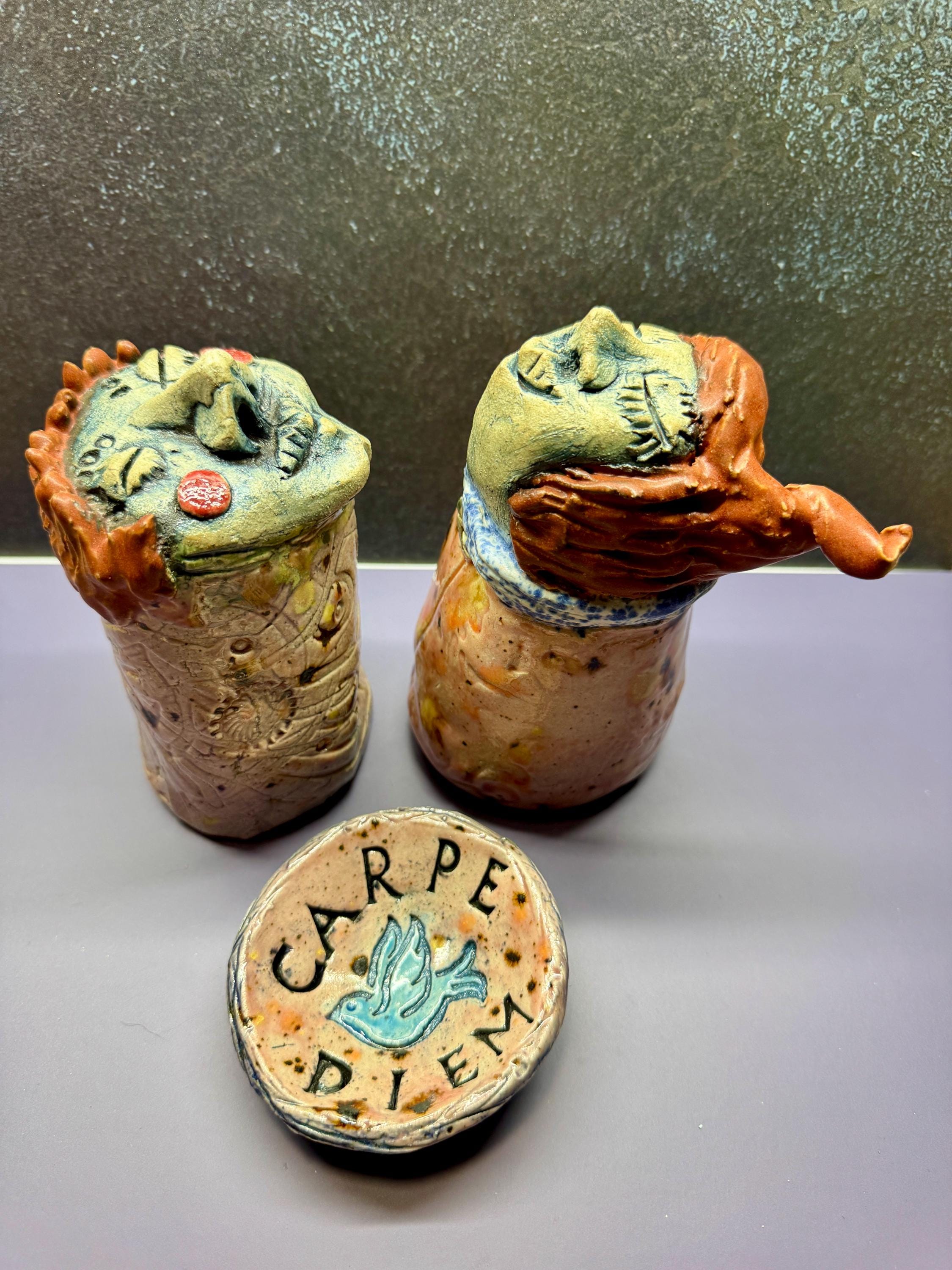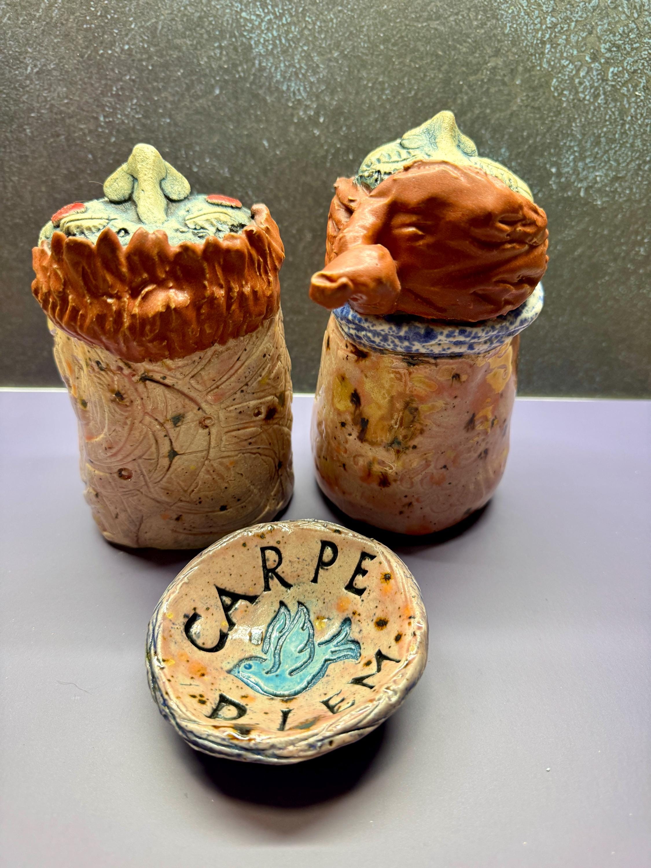 The Clay Souls measure approximately 6” x 3”. They are glazed in a wonderful glaze called amaryllis. They make a fun noise when you shake them. The Trinket Dish has the phrase Carpe Diem and measures approx. 3”.