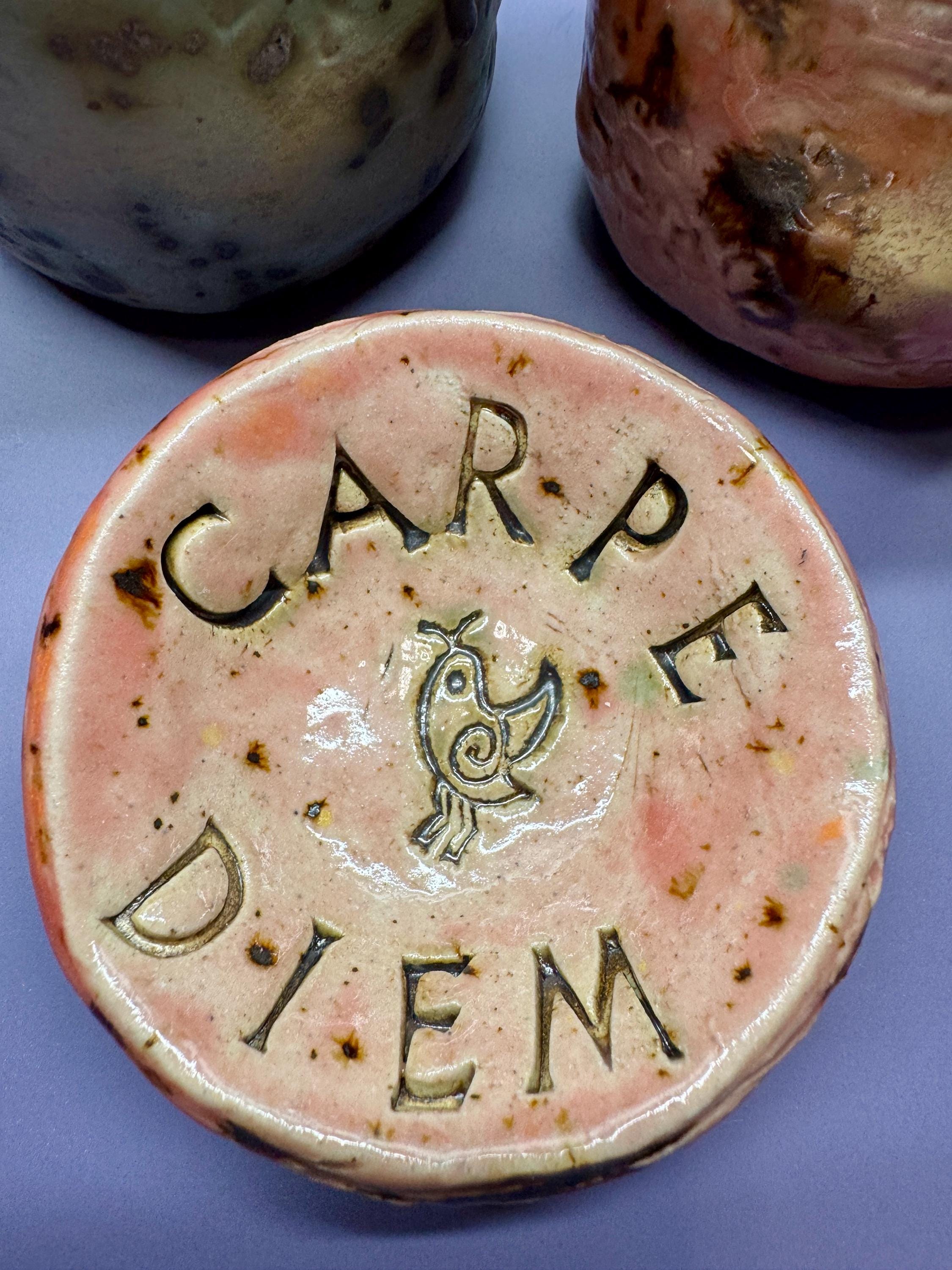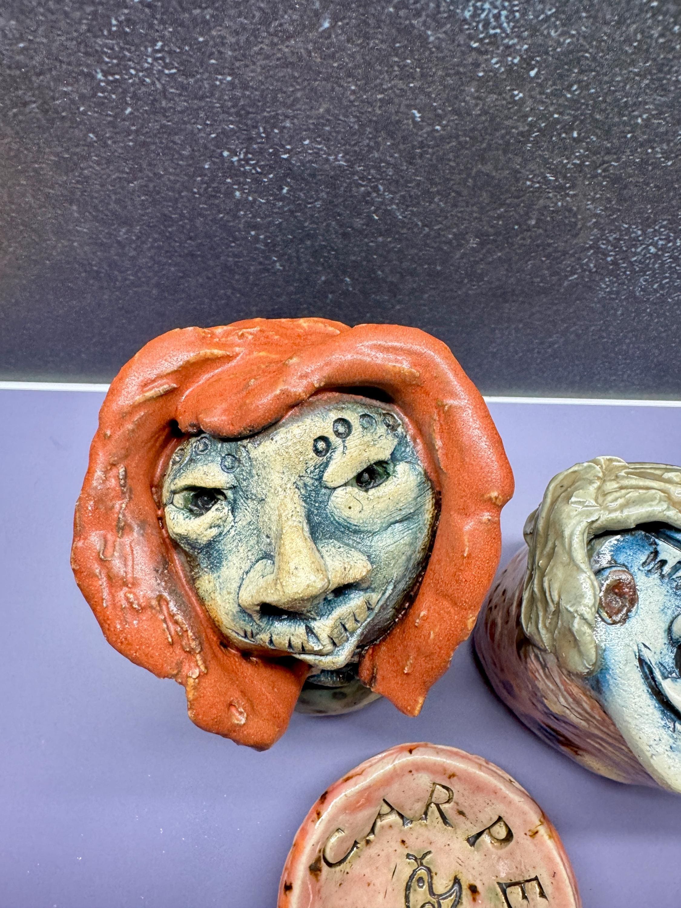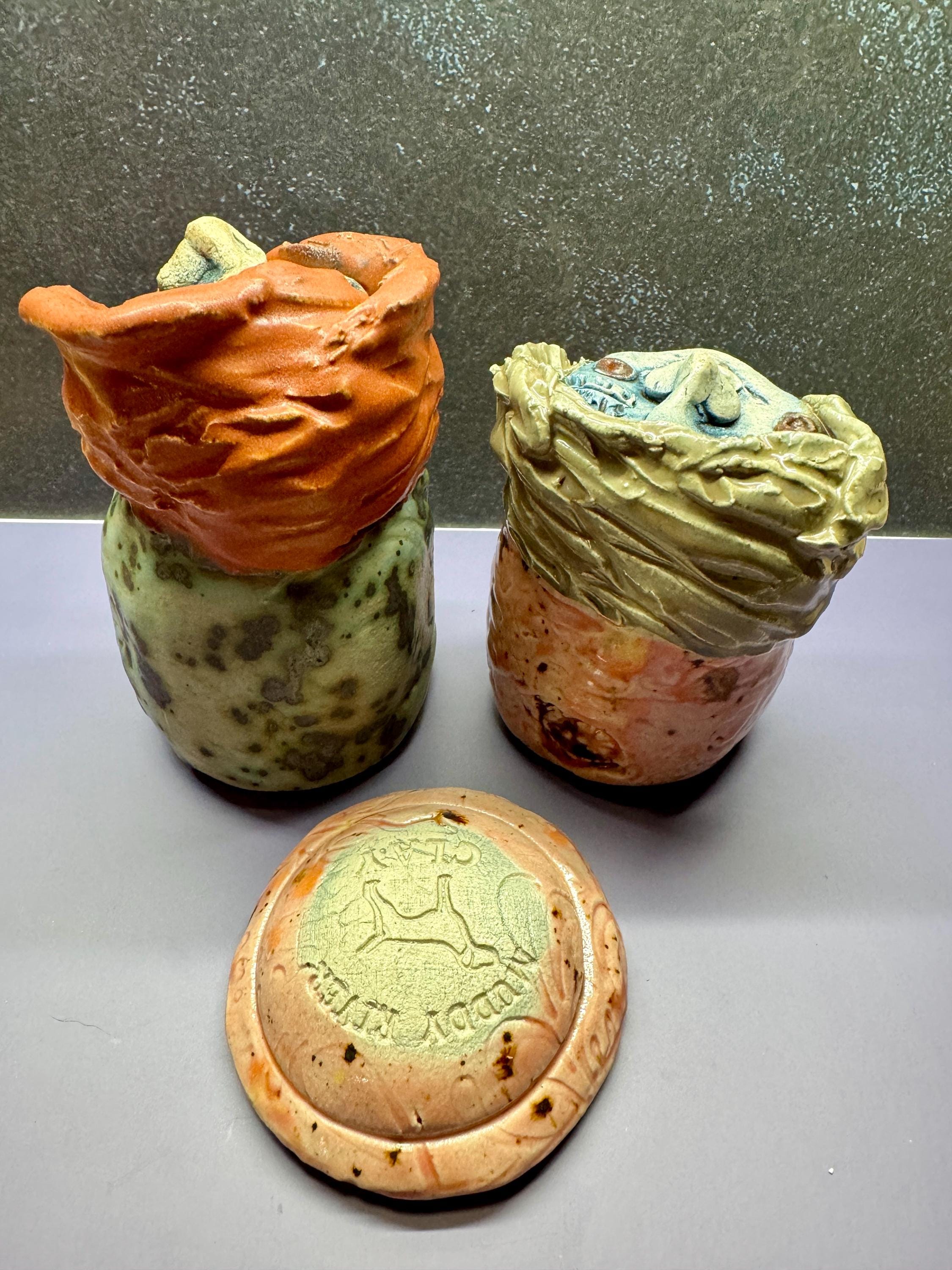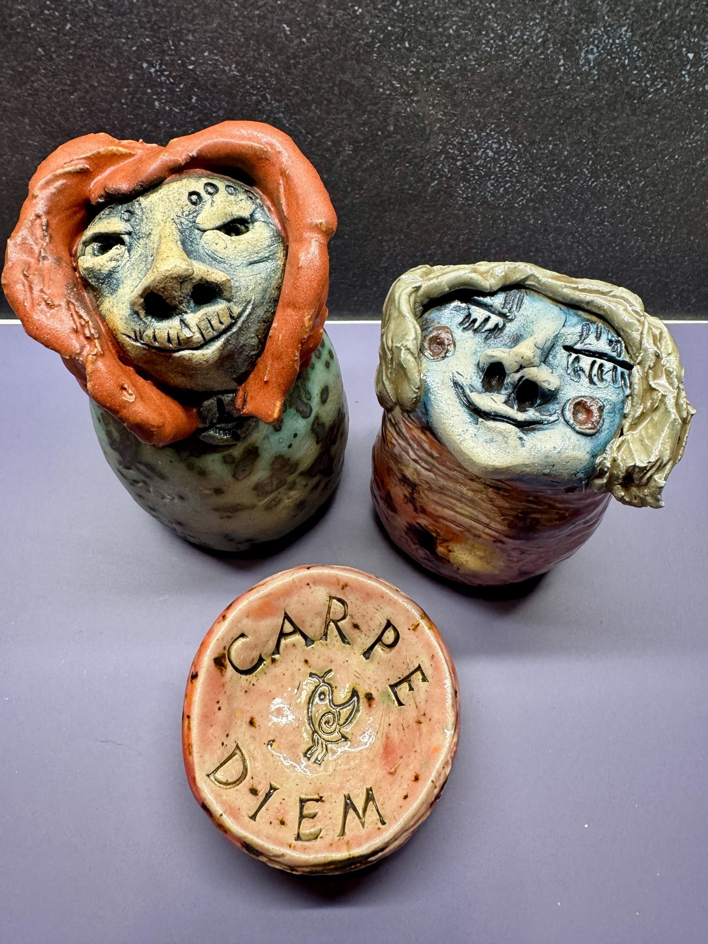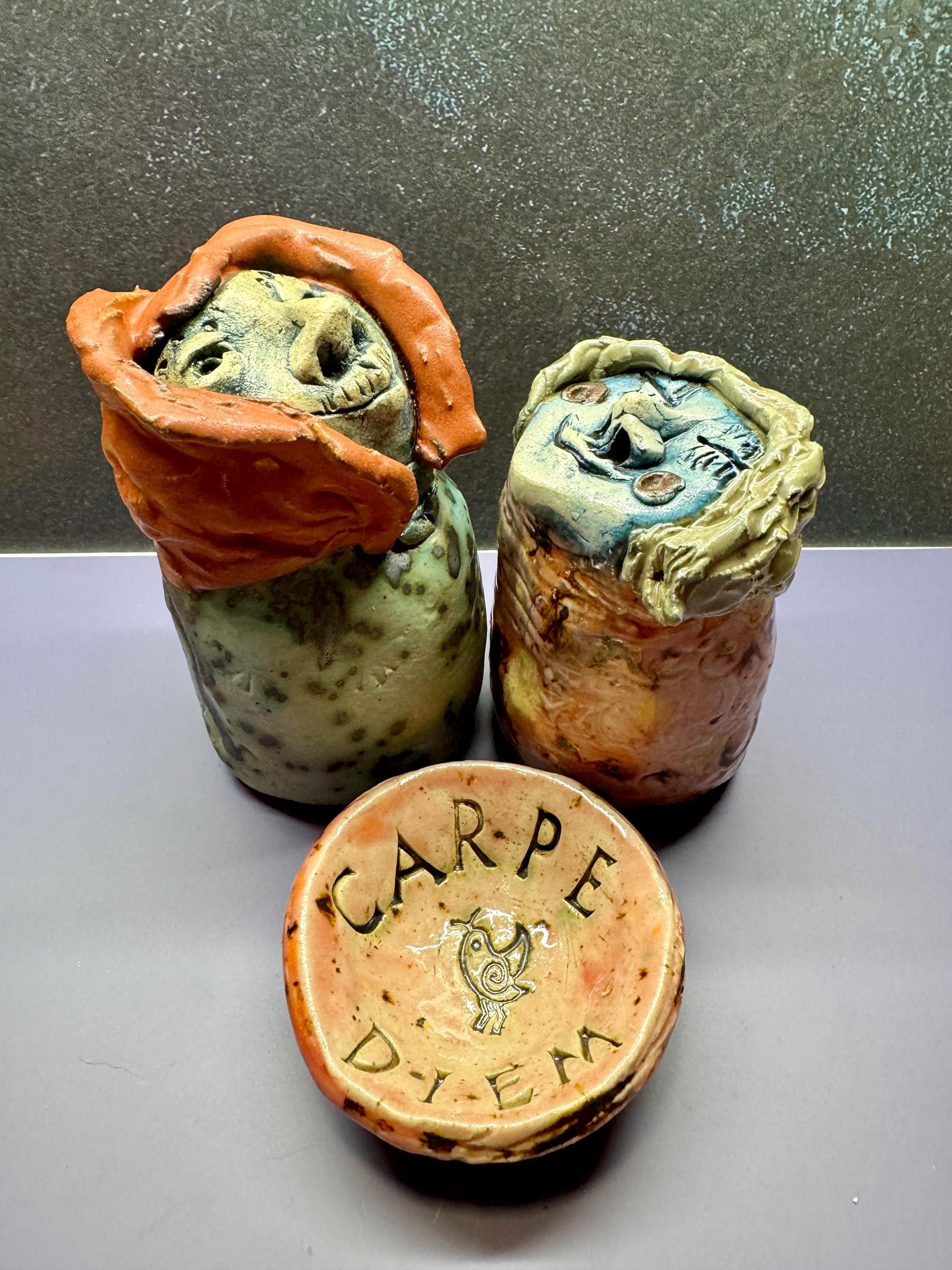The taller Clay Soul measure approximately 6” x 3” and the smaller one measures approximately 5” x 3”. They are glazed in a wonderful glazes. They make a fun noise when you shake them. The Trinket Dish has the phrase Carpe Diem and measures approx. 3”.
