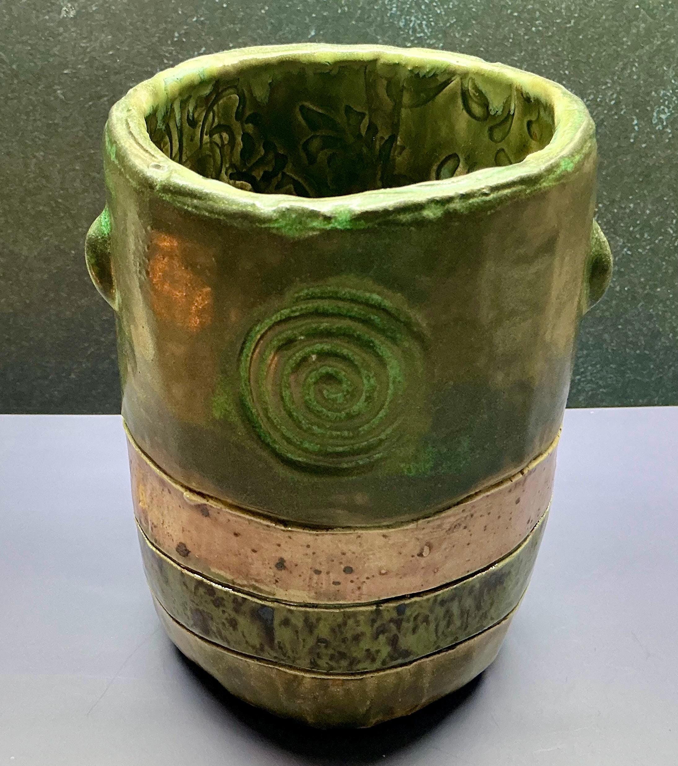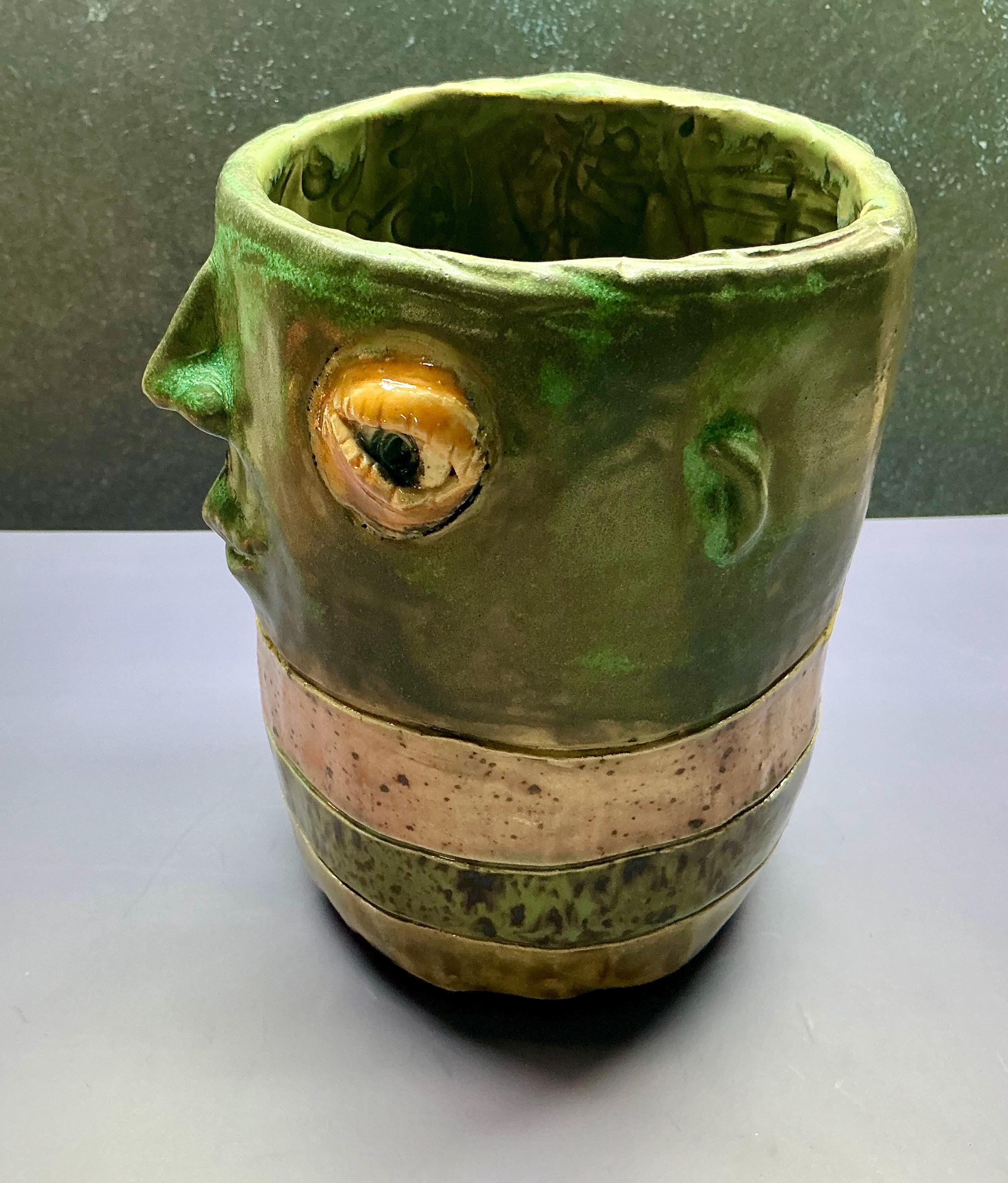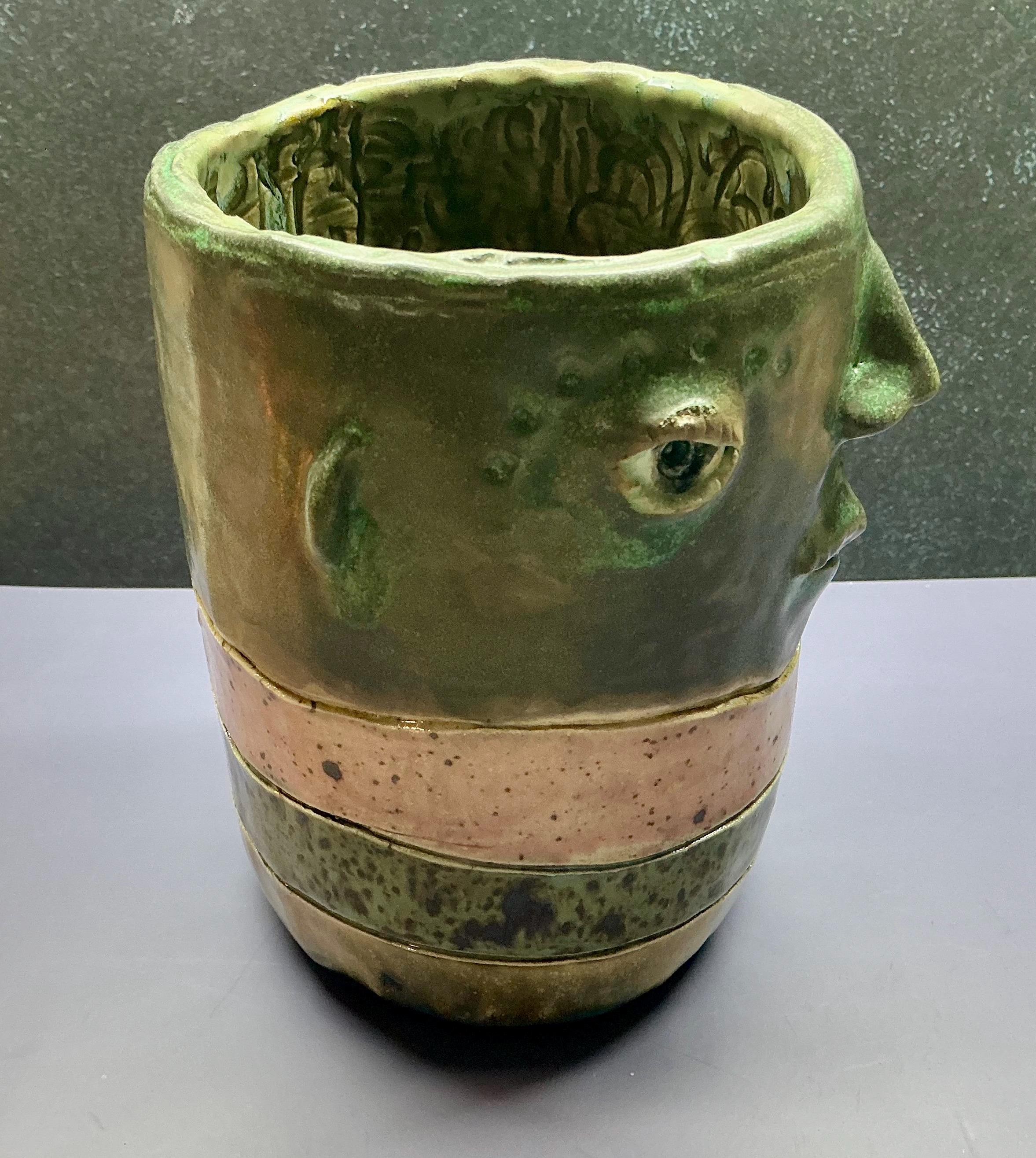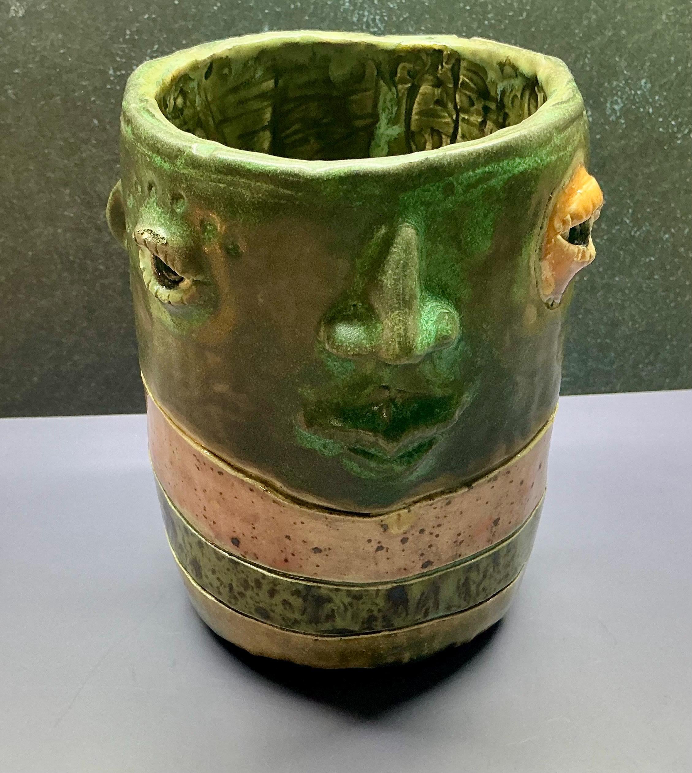This piece measures approximately 7” tall and 5” wide. It is glazed in a mix of glazes. This piece has several striped glazes and a happy face.
