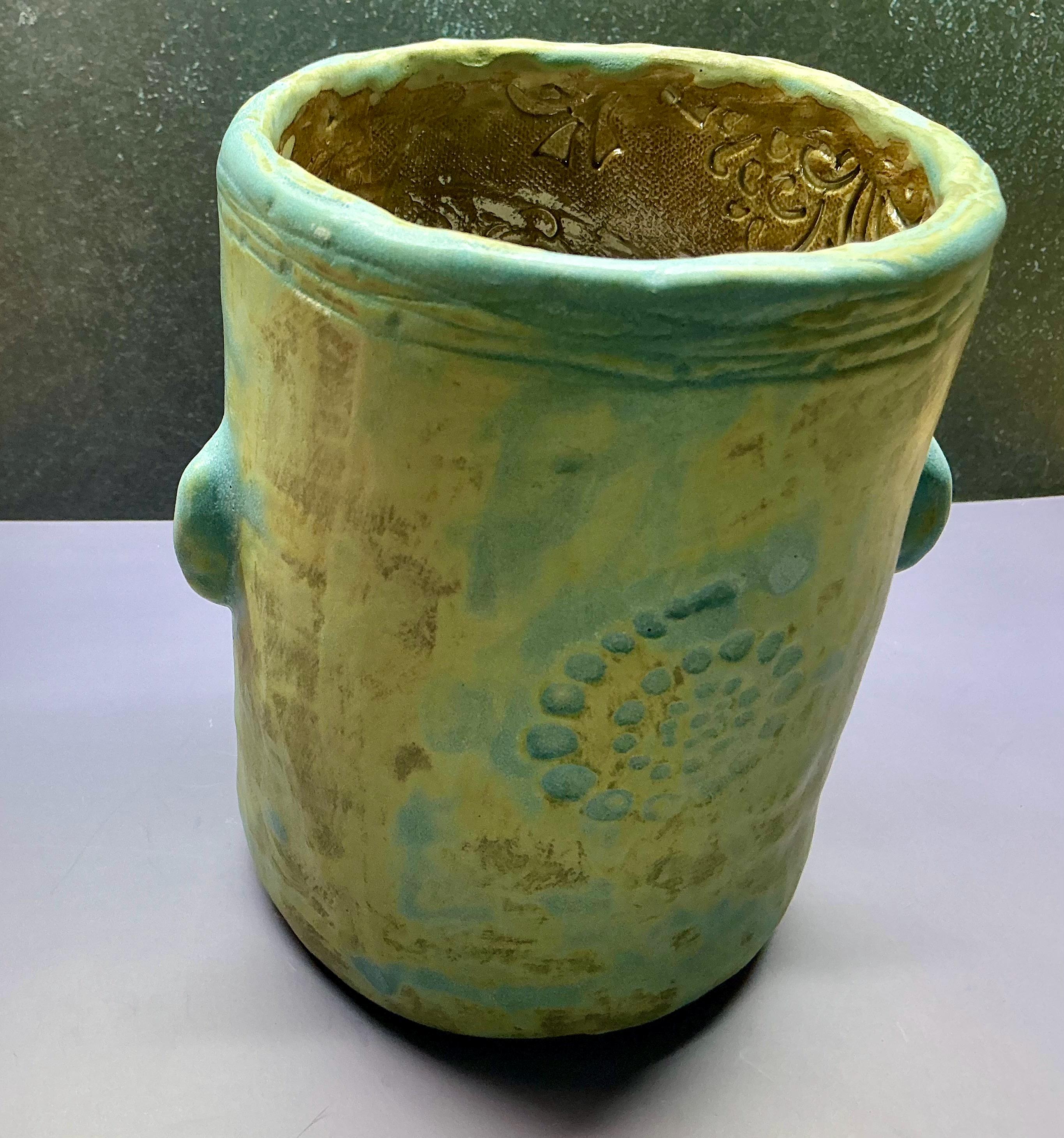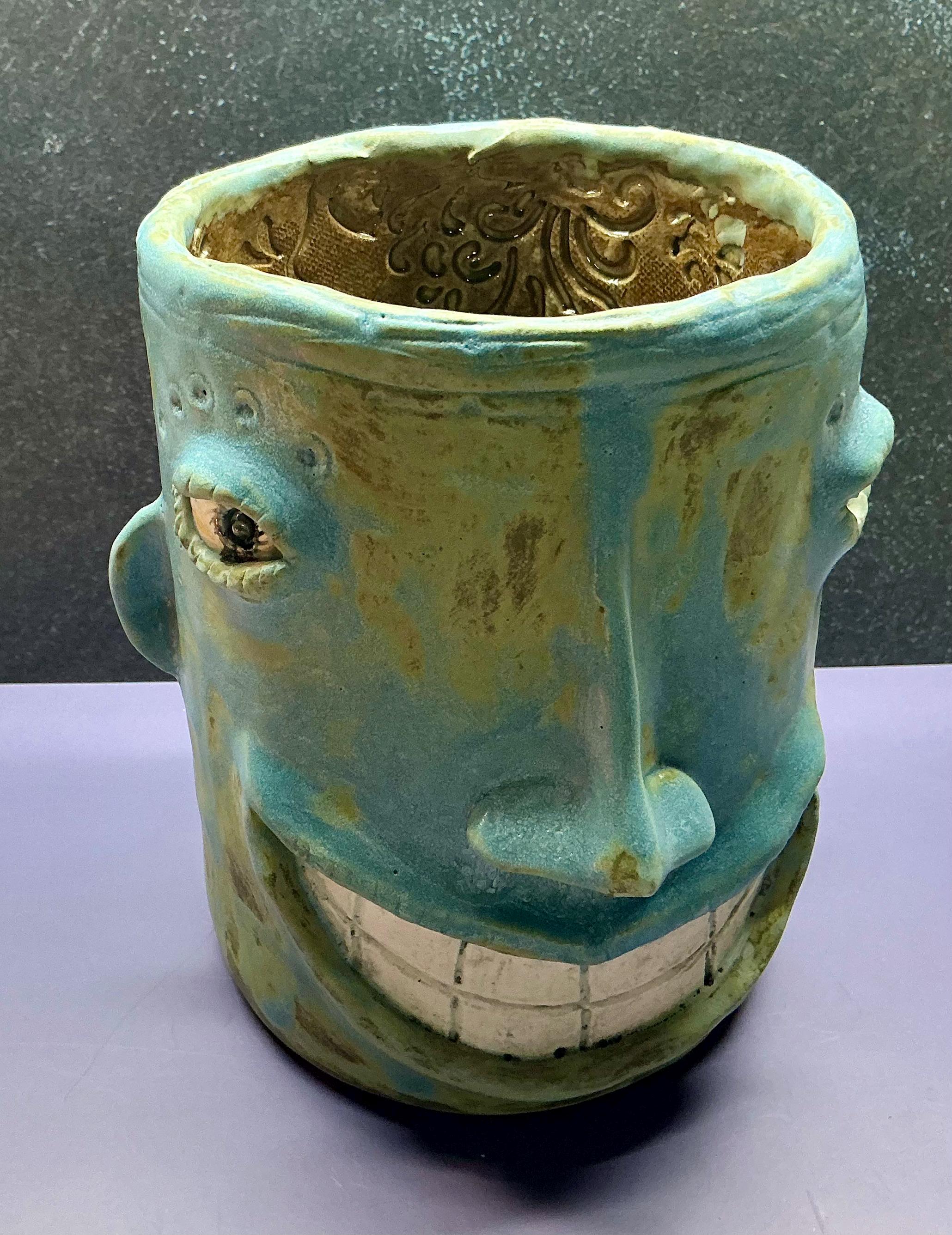 This piece measures approximately 7” tall and 5” wide. It is glazed in an antique blue matte glaze with a white smiley face.