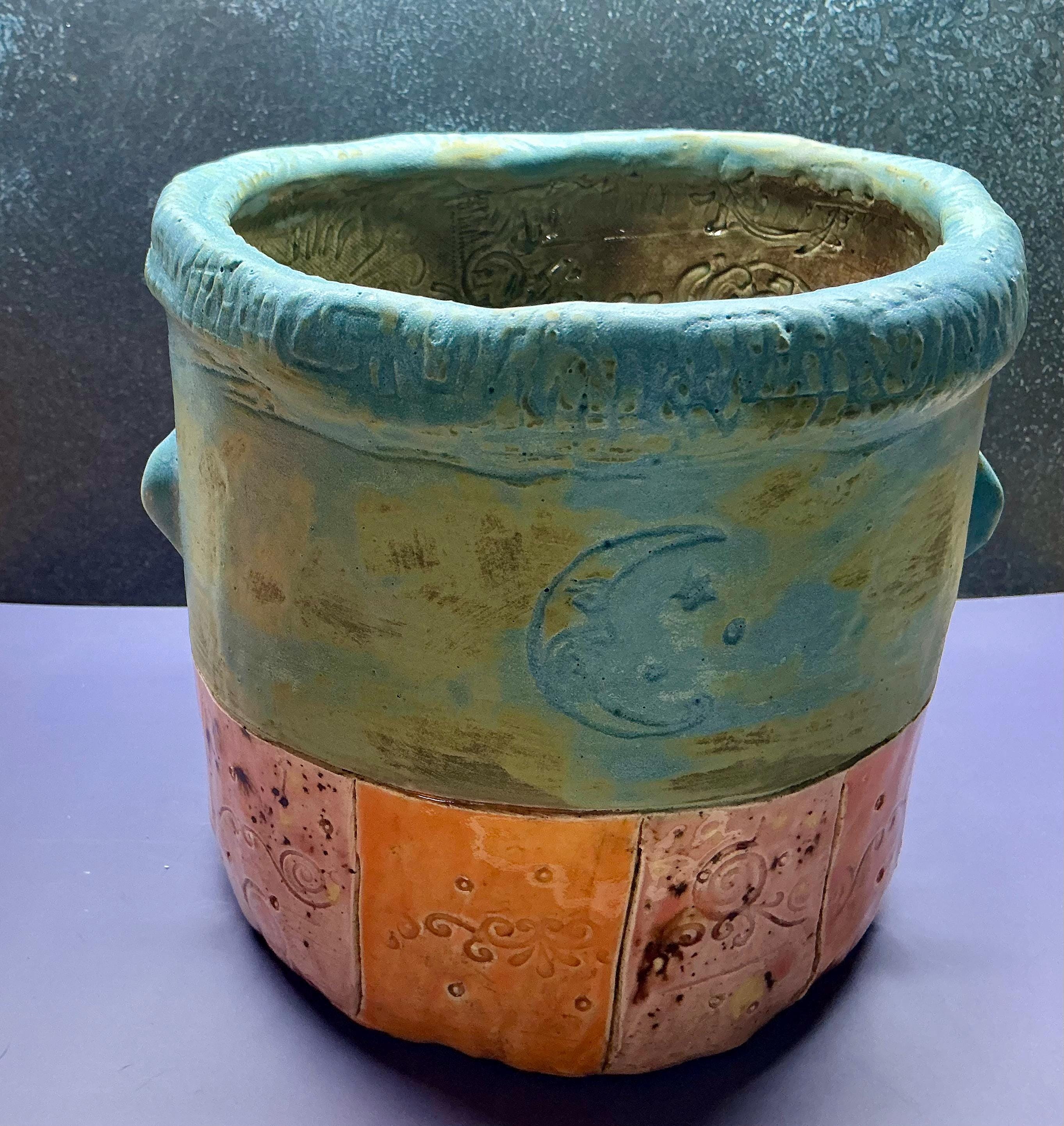 This piece measures approximately 7” tall and 8” wide. It is glazed in an antique blue matte glaze with various orange glazes.
