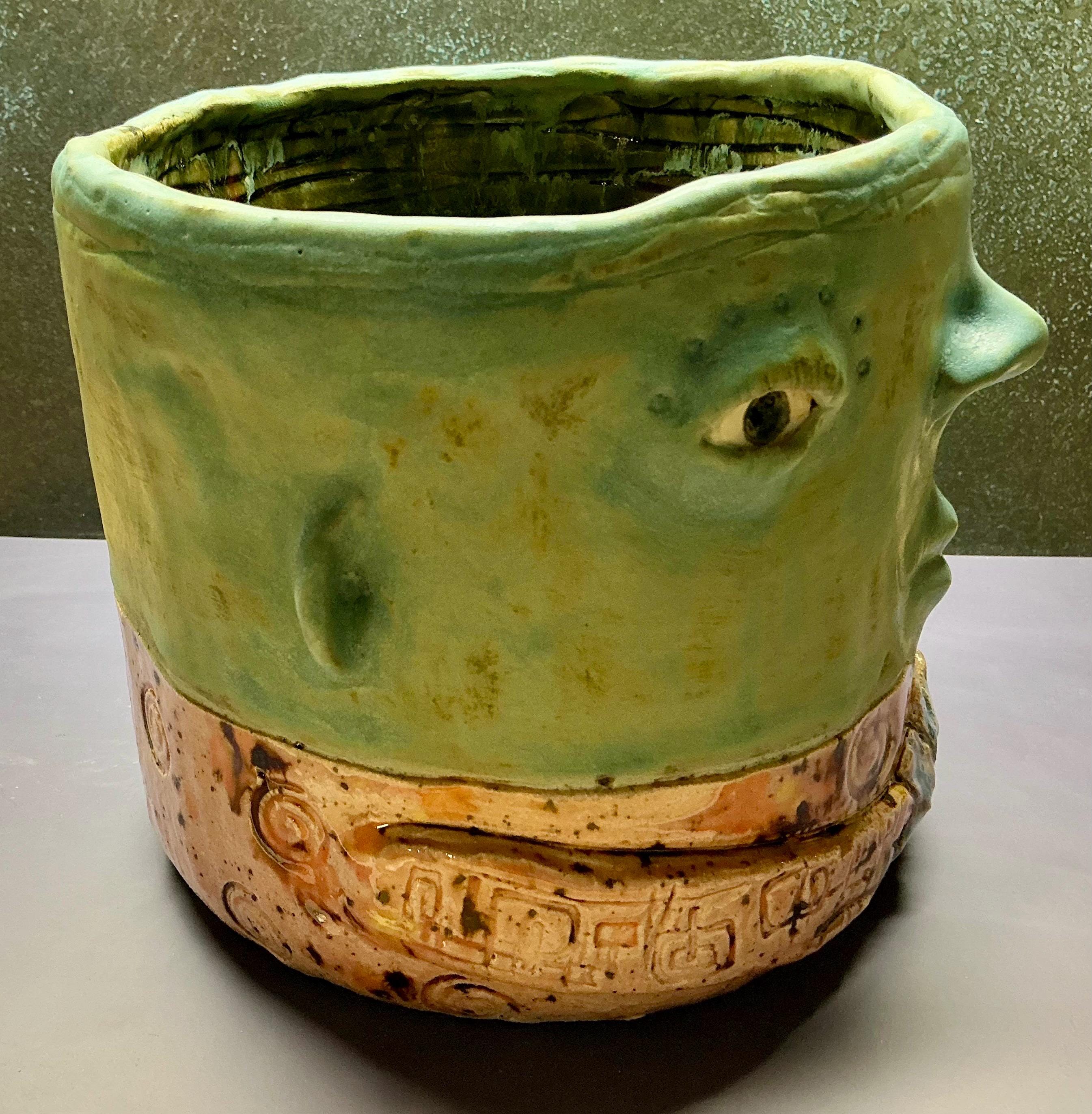 This piece measures approximately 7” tall and 9” wide. It features a large face planter holding a flower and glazed in a speckled orange/pink/yellow glaze.