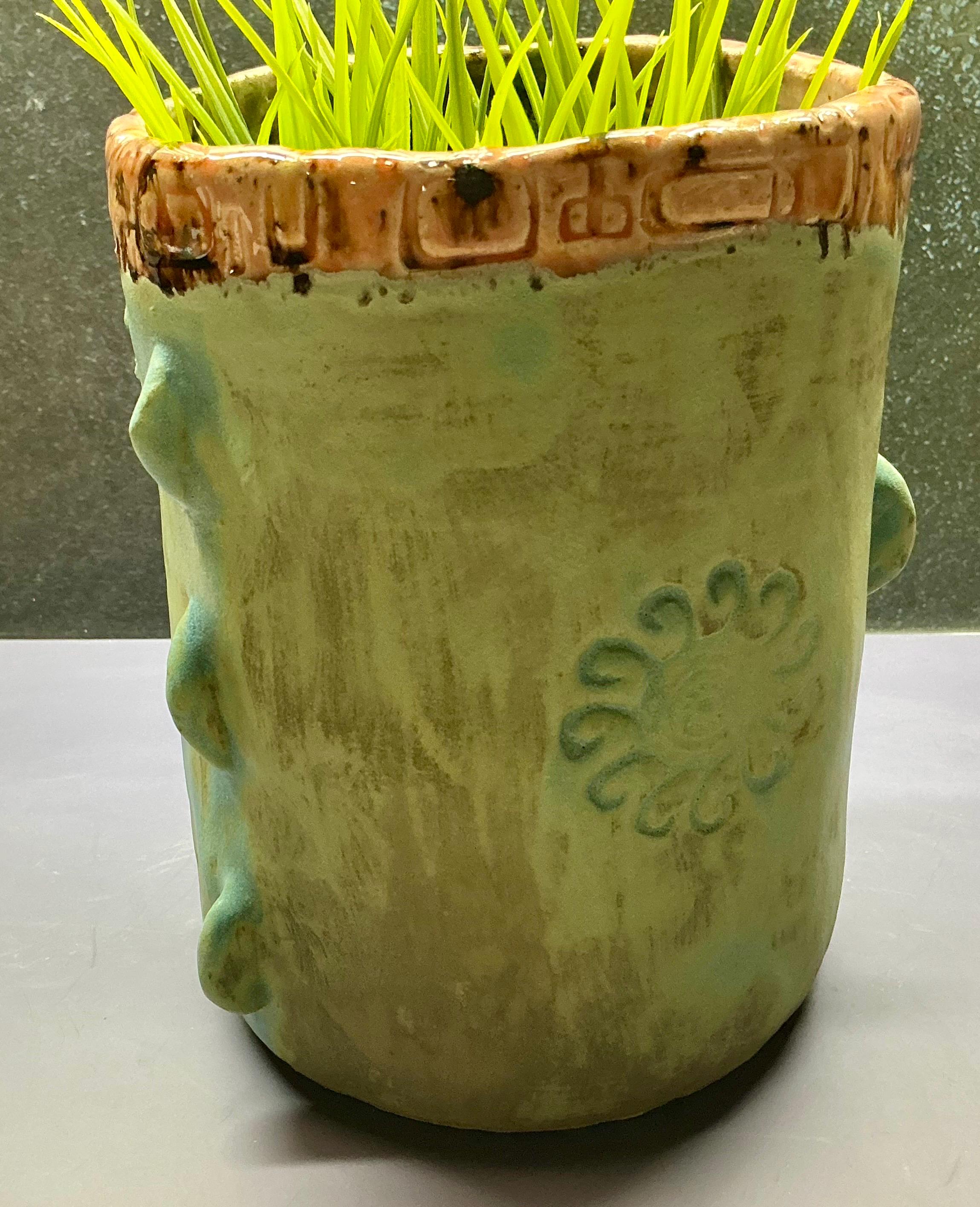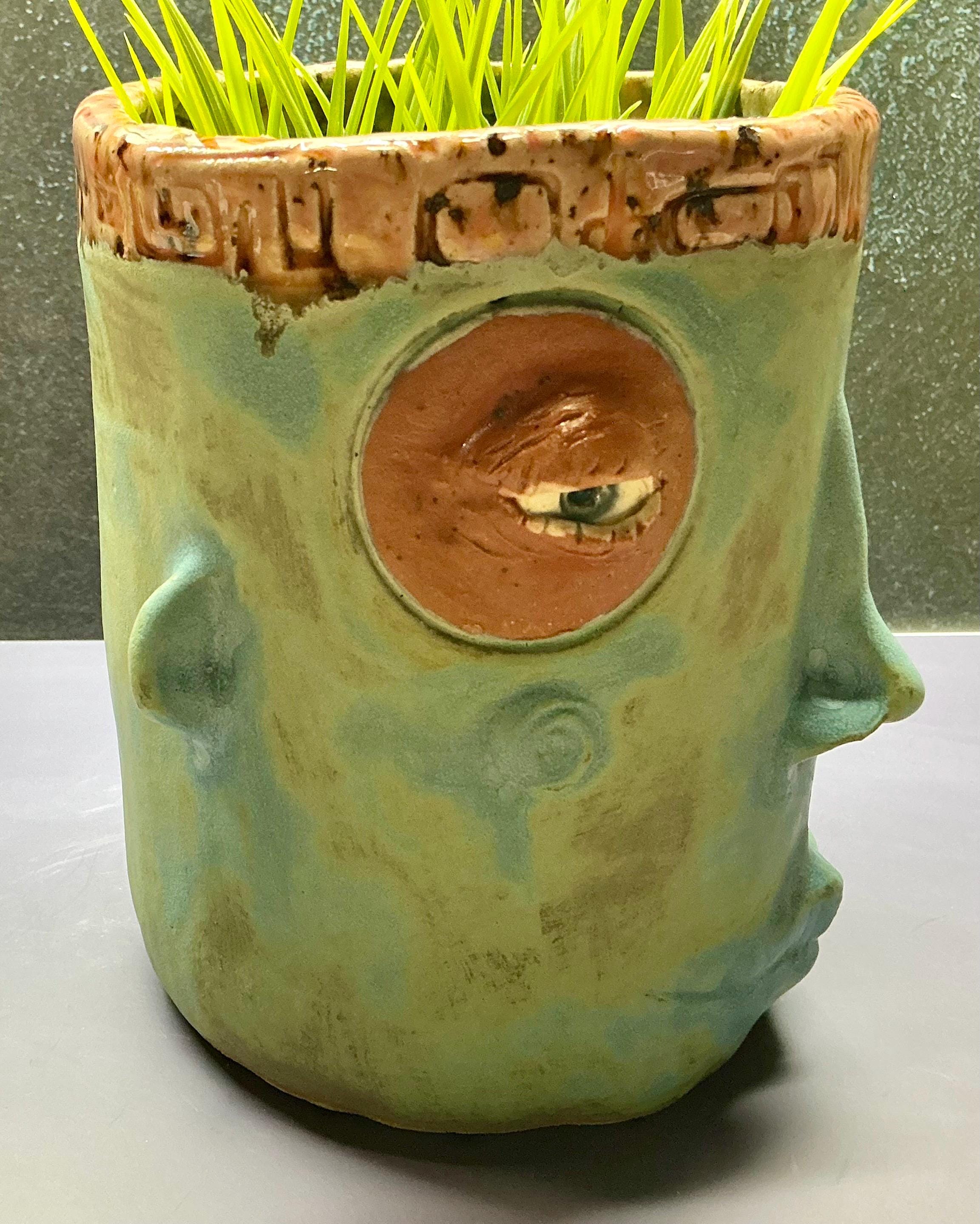 This listing is for one handmade ceramic face planter. Each piece has a whimsical face and is high fired to over 2200 degrees so you can place them indoors or out in all but extreme temperatures. These pieces look great with succulents, cat grass or other plant that looks like hair.