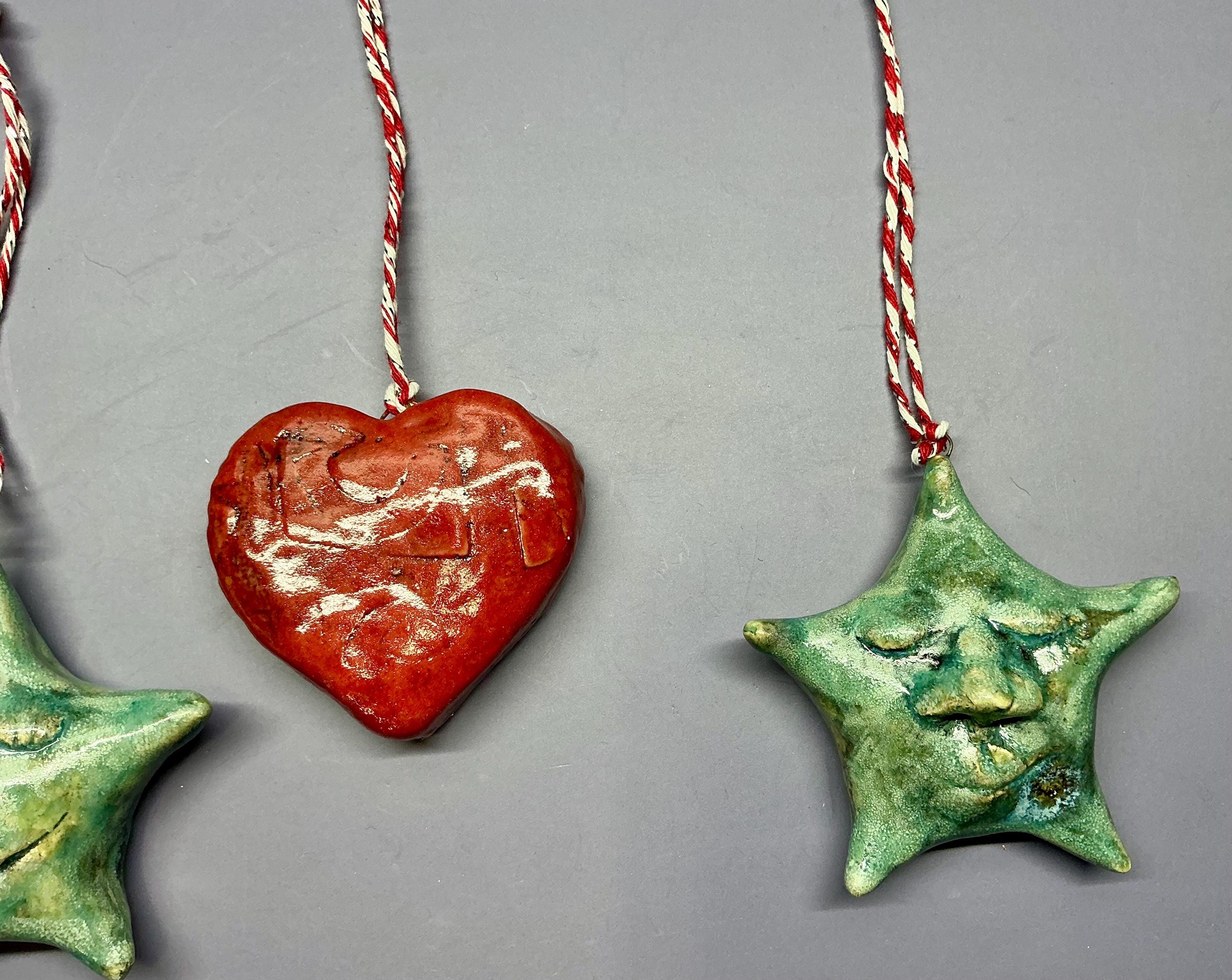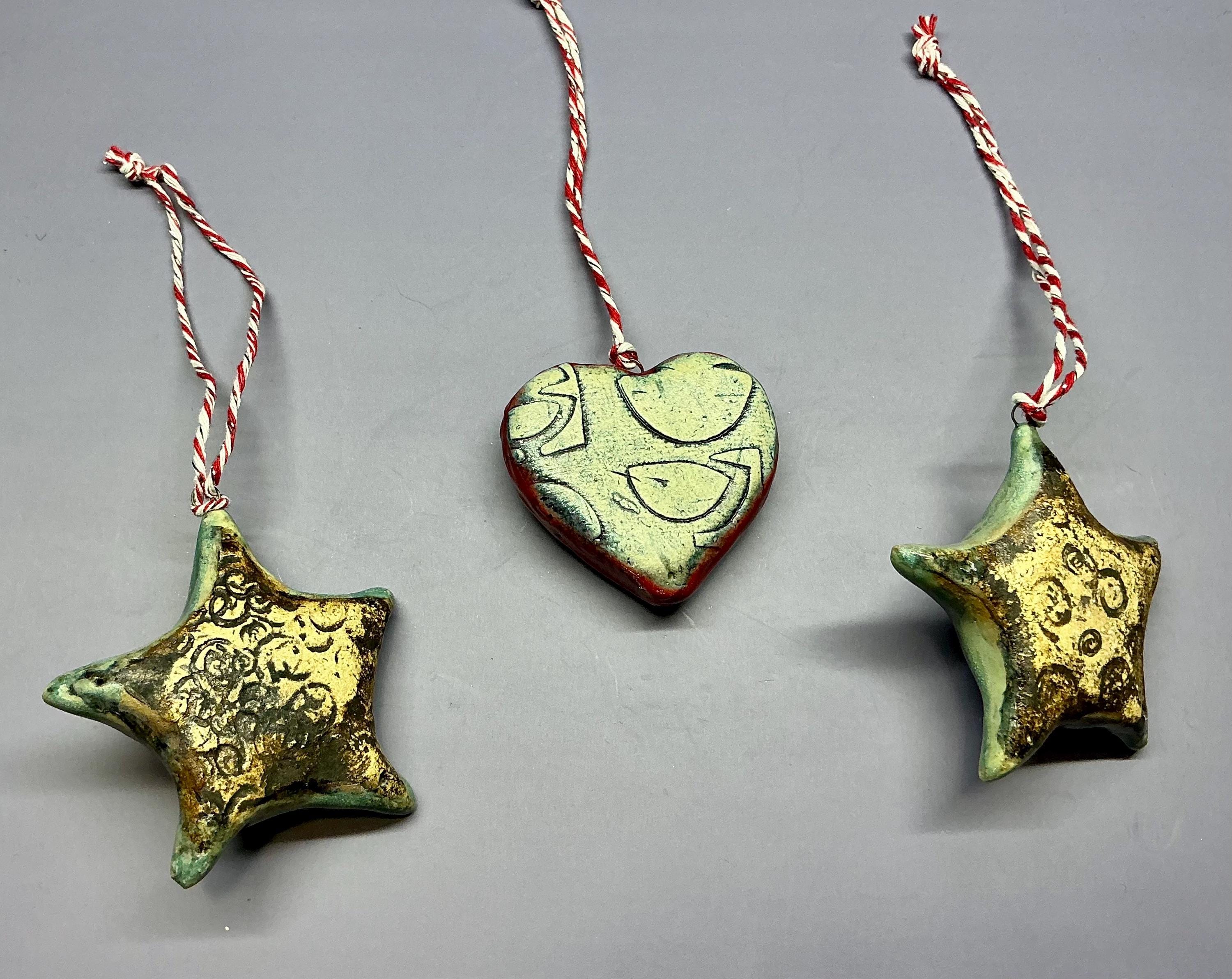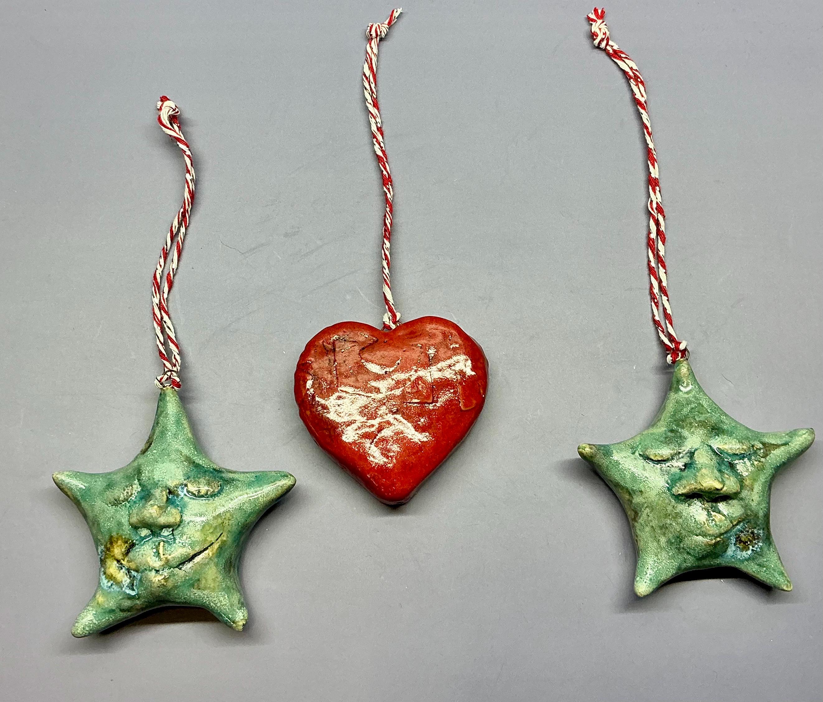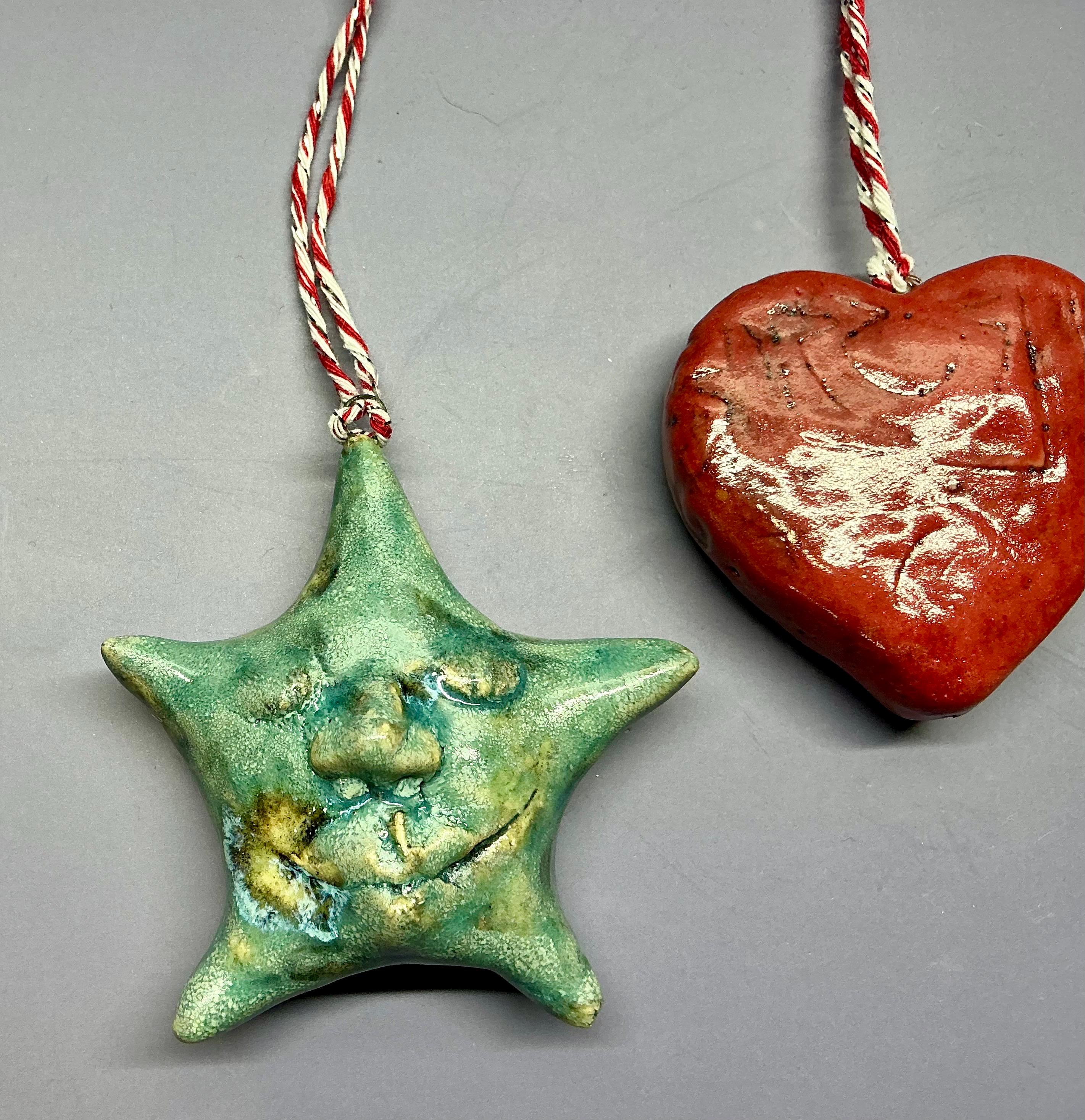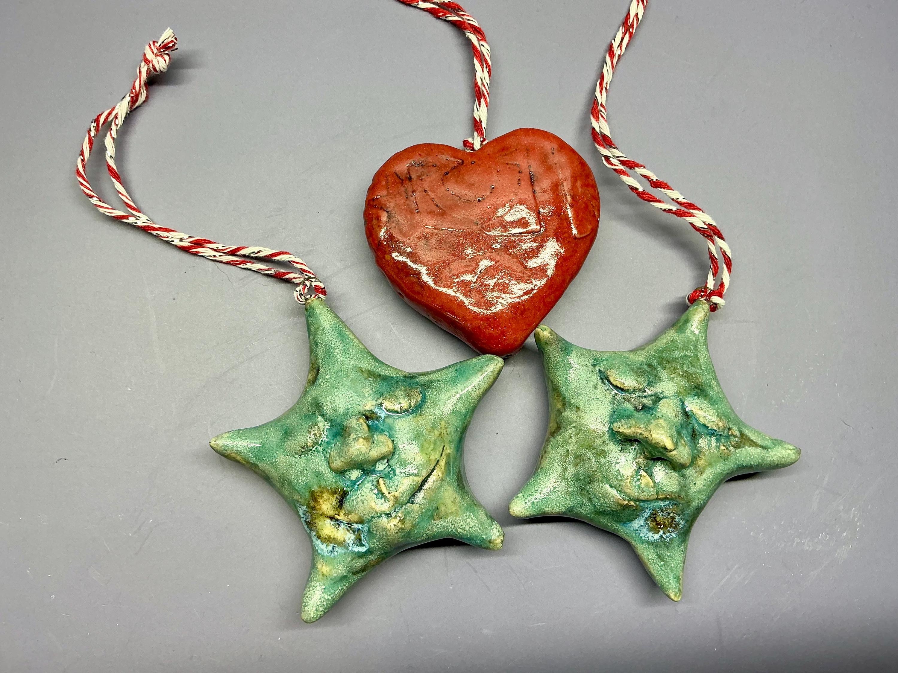 This listing is for 3 handmade ceramic ornaments. Each ornament is approx 2 1/2” around and hung by red/white twine. This listing includes 2 stars with faces and one heart ornament.