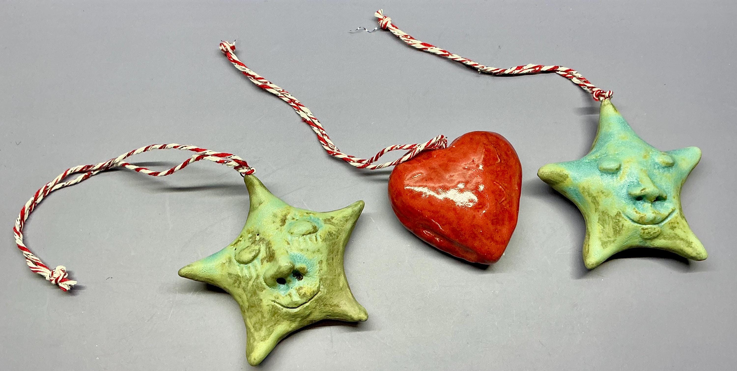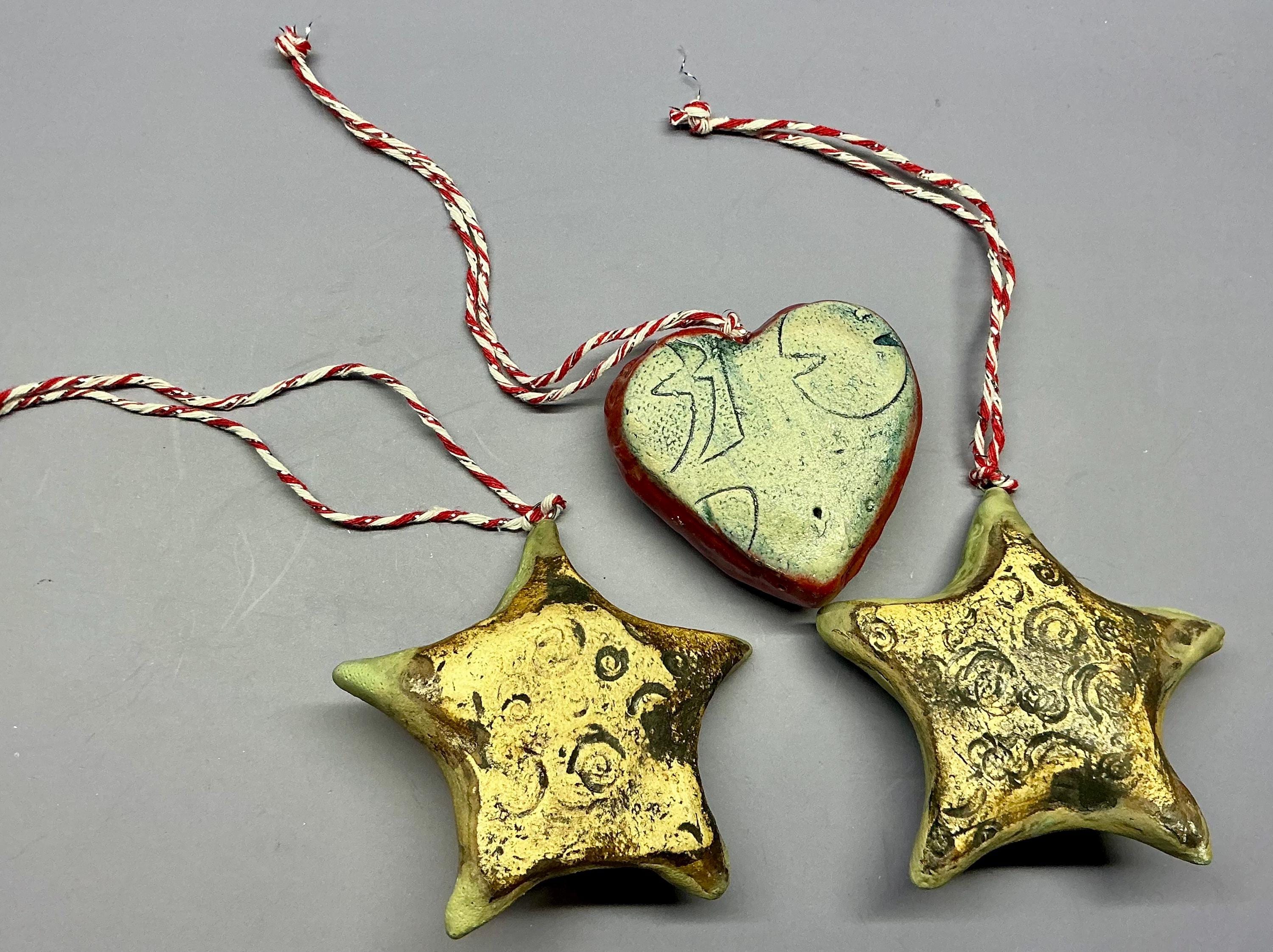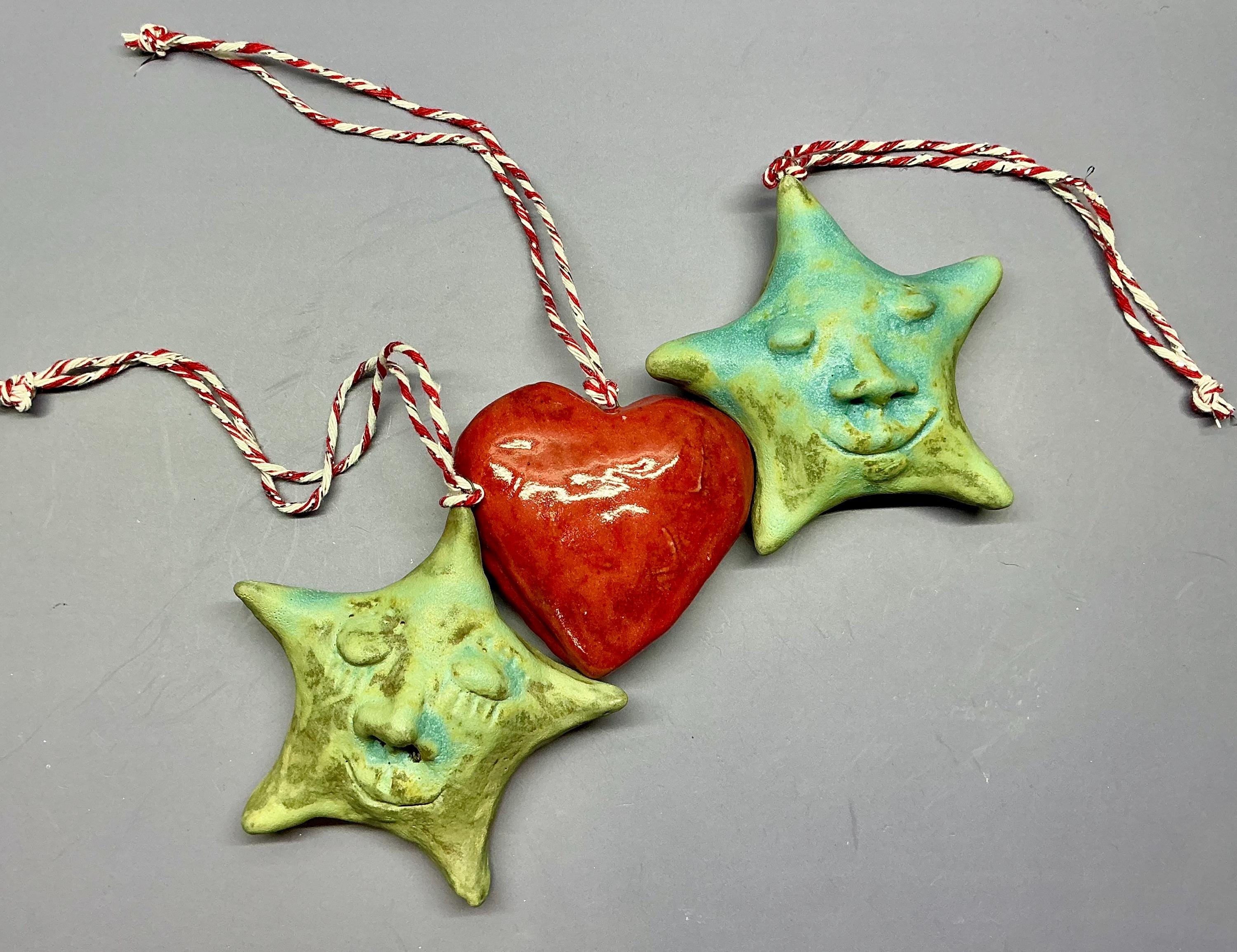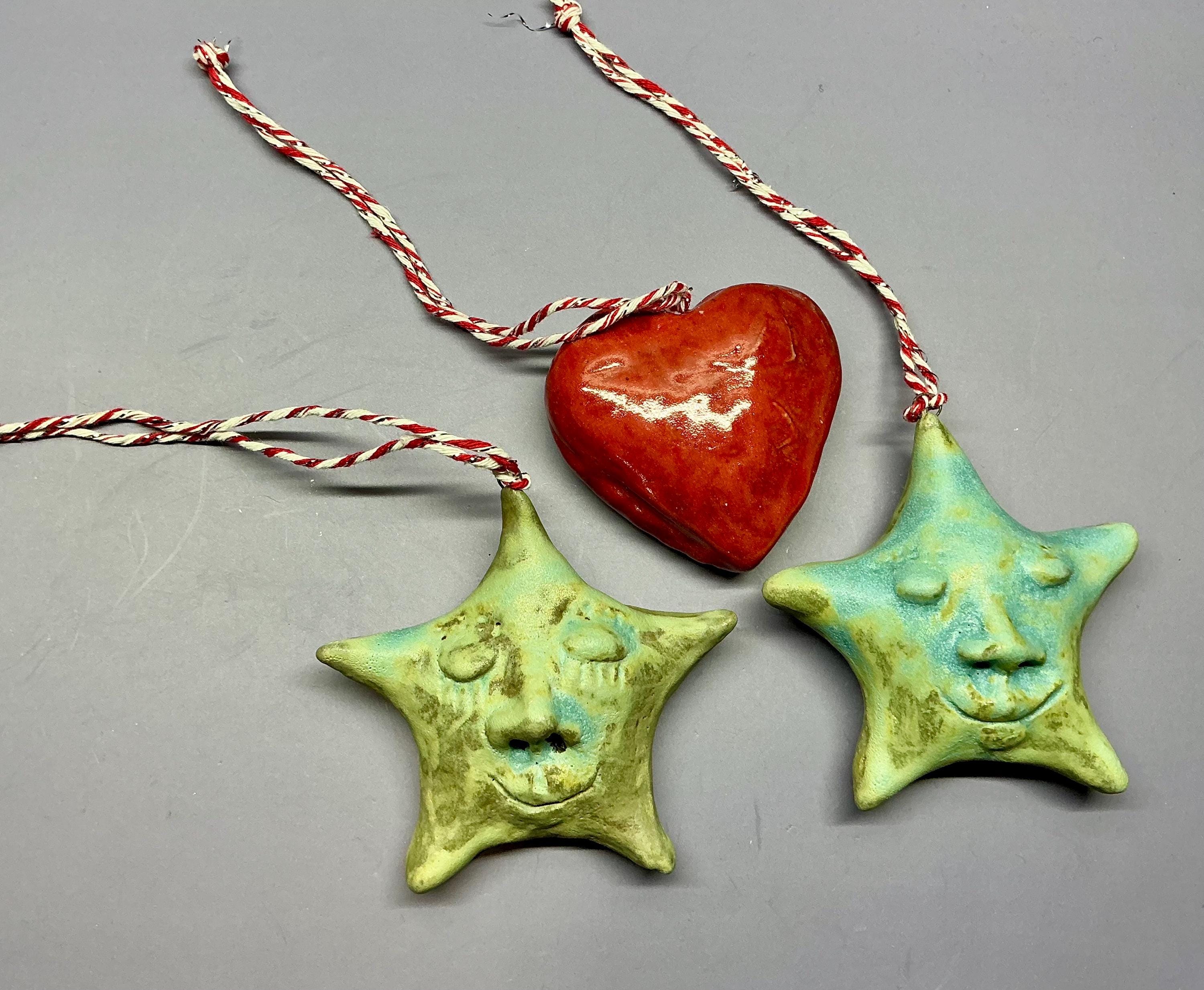 This listing is for 3 handmade ceramic ornaments. Each ornament is approx 2 1/2” around and hung by red/white twine. This listing includes 2 stars with faces and one heart ornament.