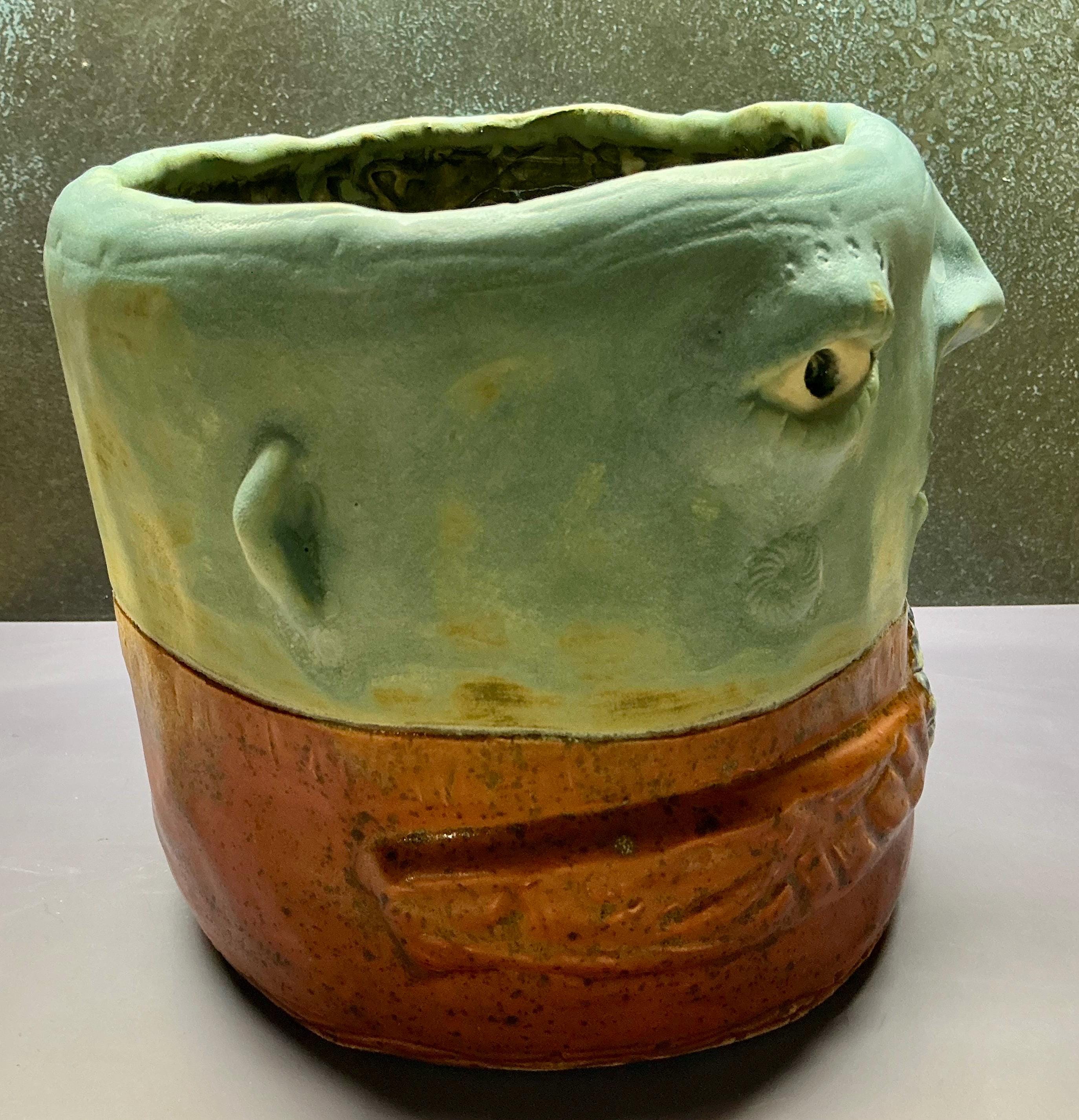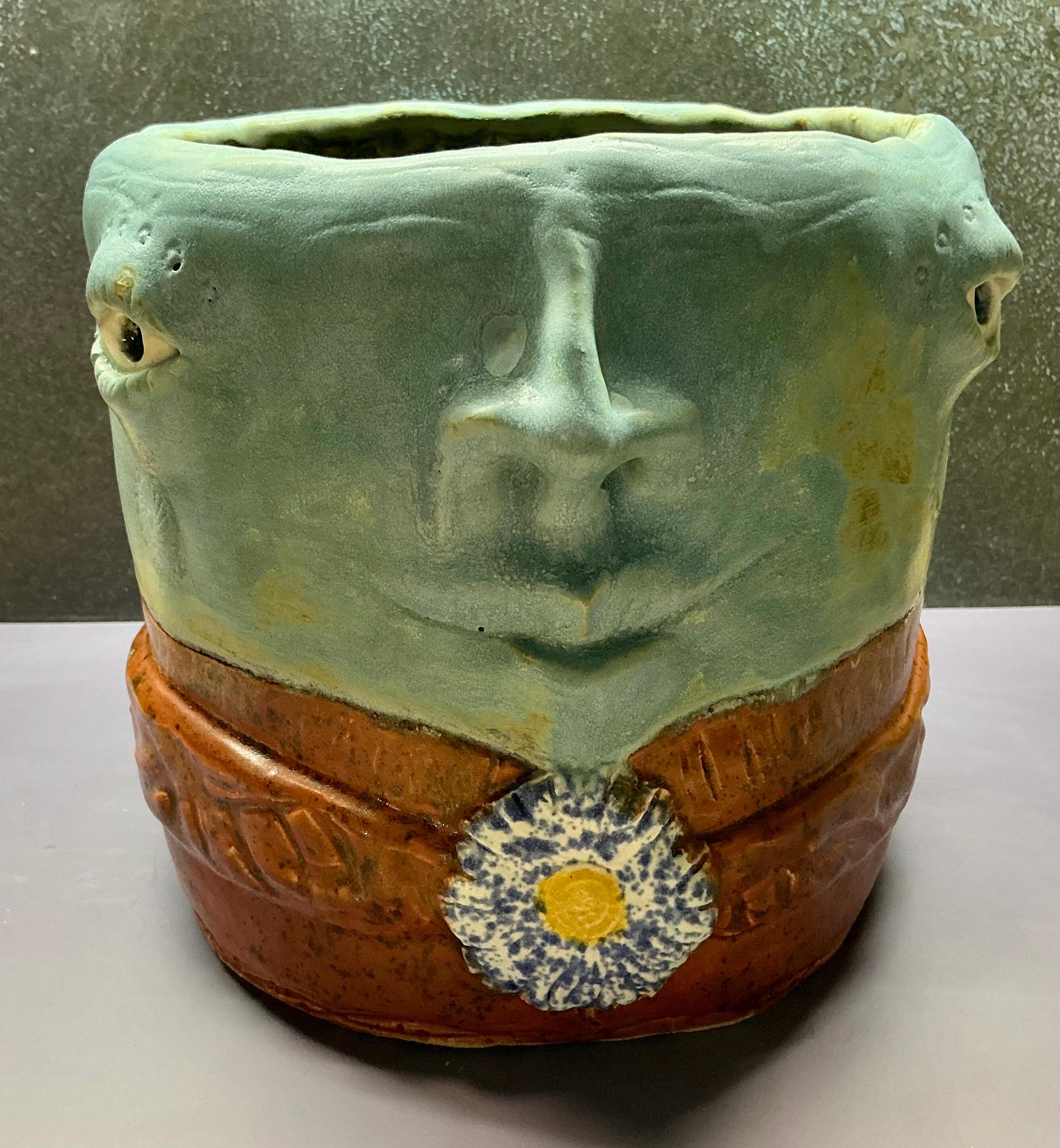 This piece measures approximately 7” tall and 9” wide. It features a large face planter holding a flower and glazed in a speckled red glaze.