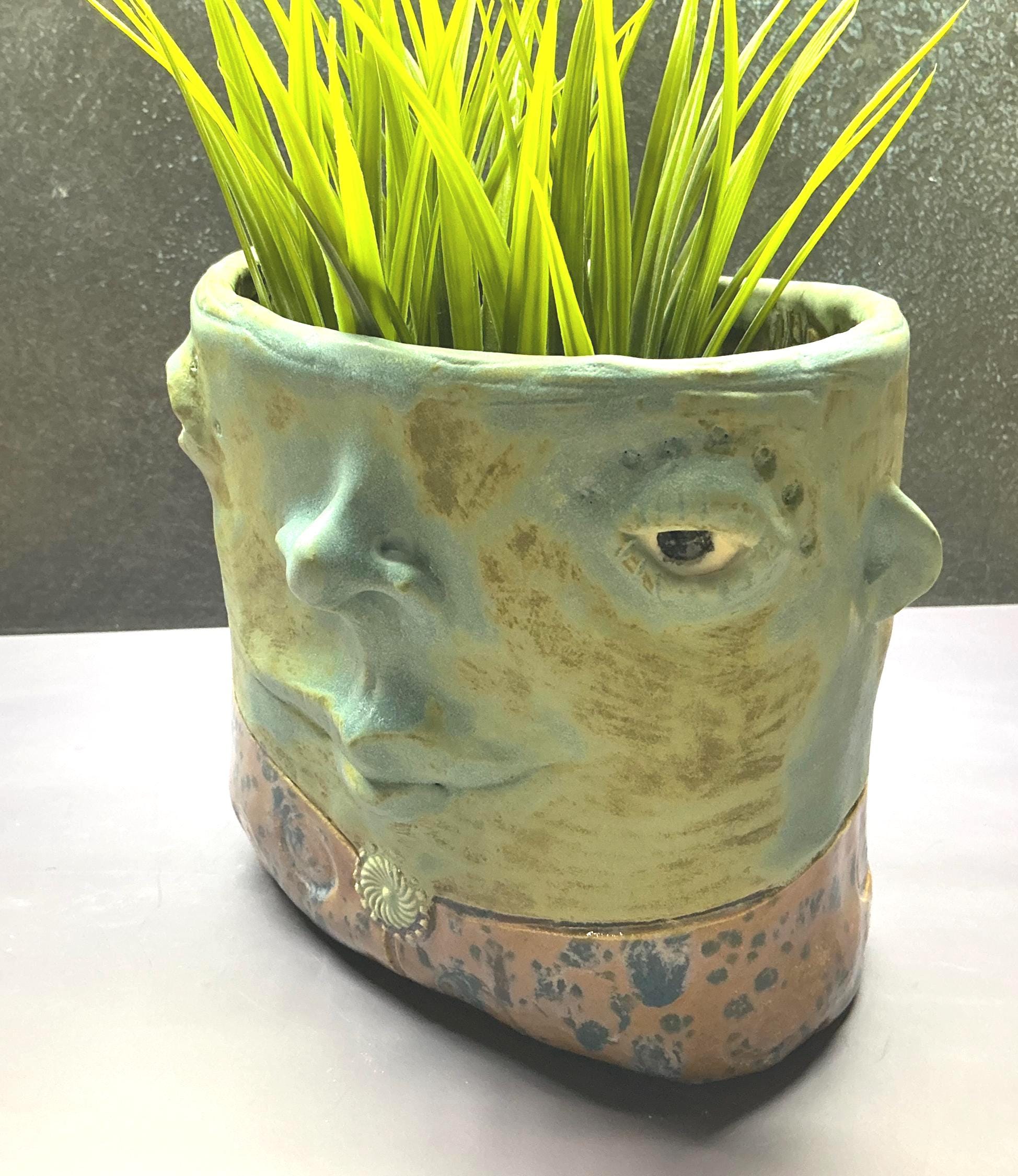 This listing is for one handmade ceramic face planter. Each piece has a whimsical face and is high fired to over 2200 degrees so you can place them indoors or out in all but extreme temperatures. These pieces look great with succulents, cat grass or other plant that looks like hair.