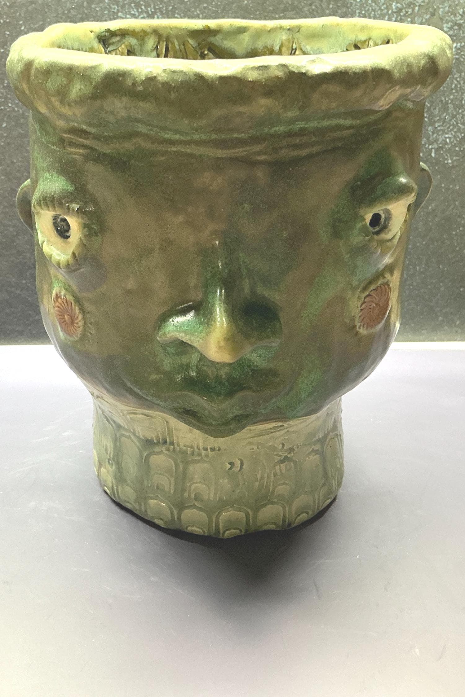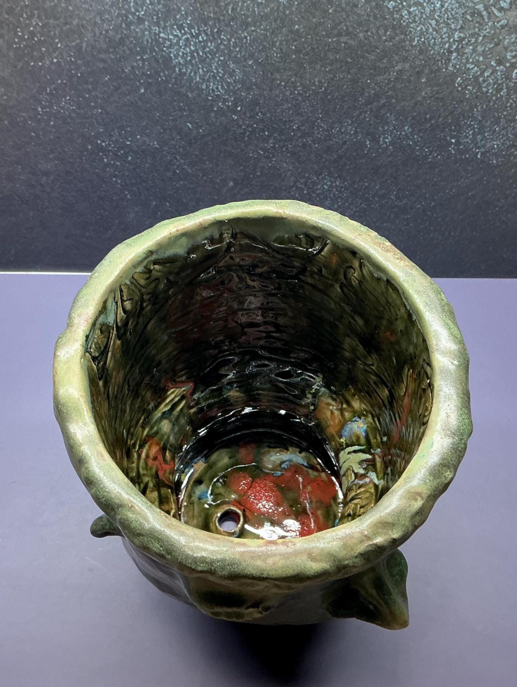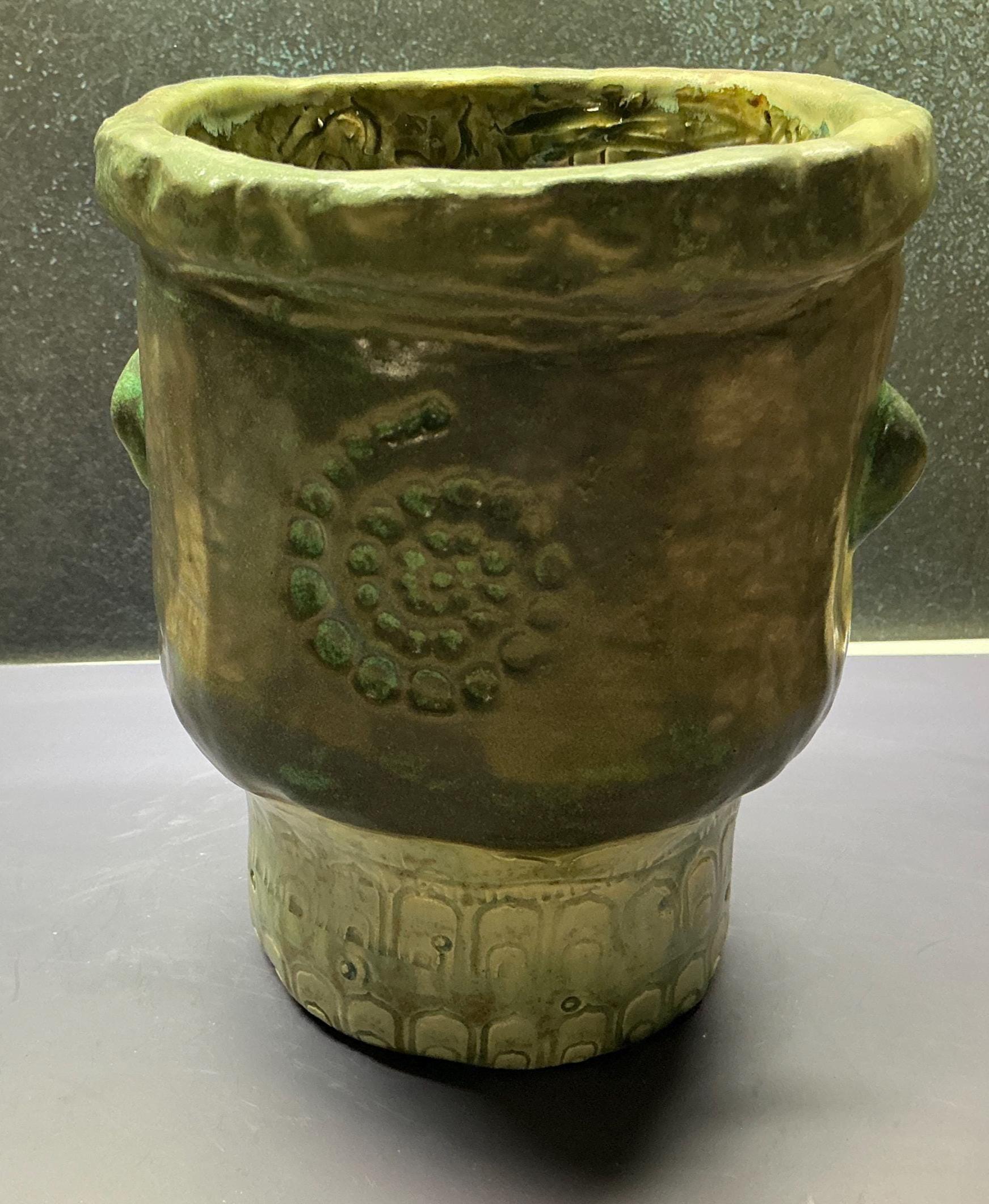 This piece measures approximately 7” tall and 6” wide. It is glazed in a mix of green glazes.