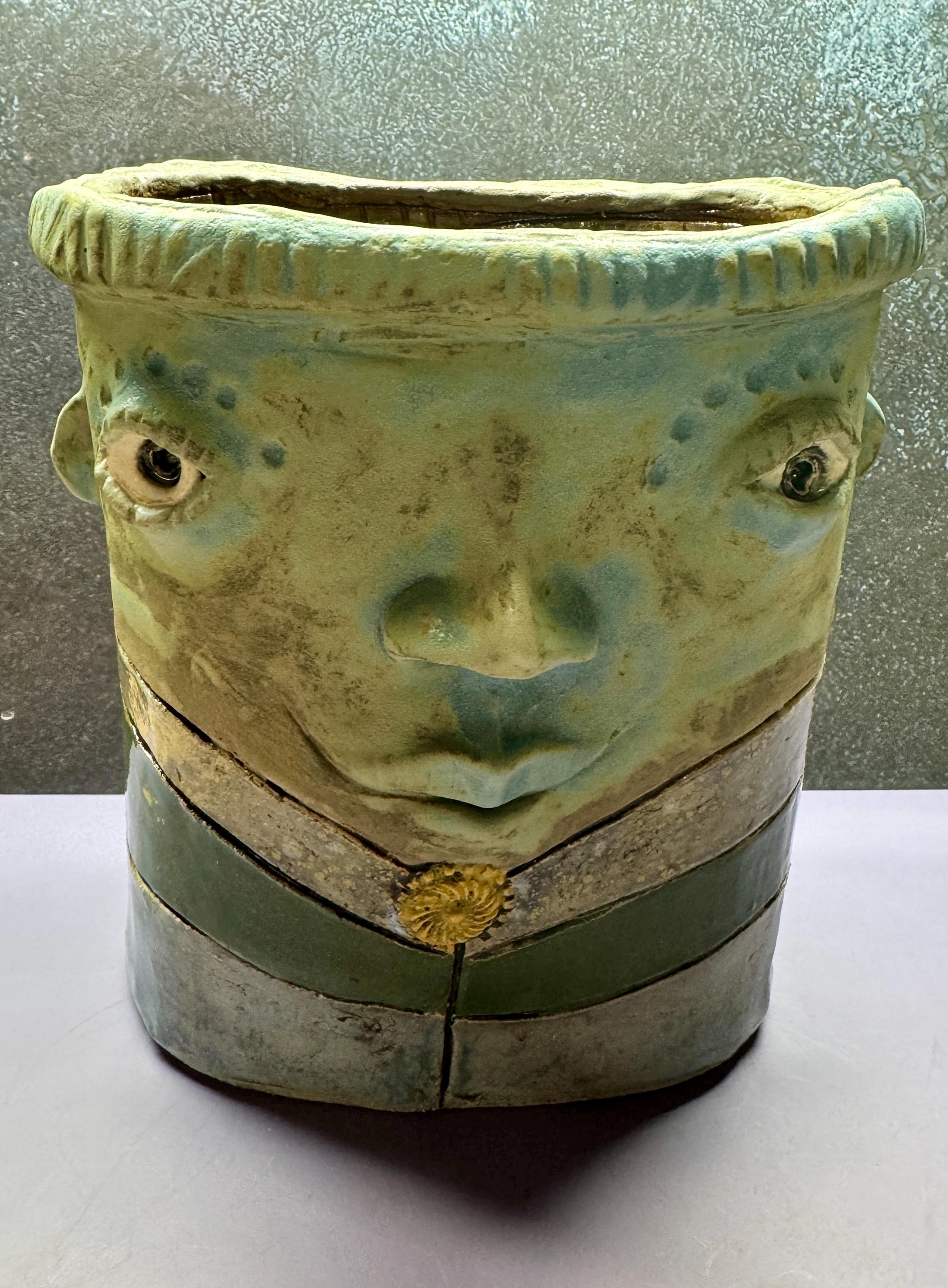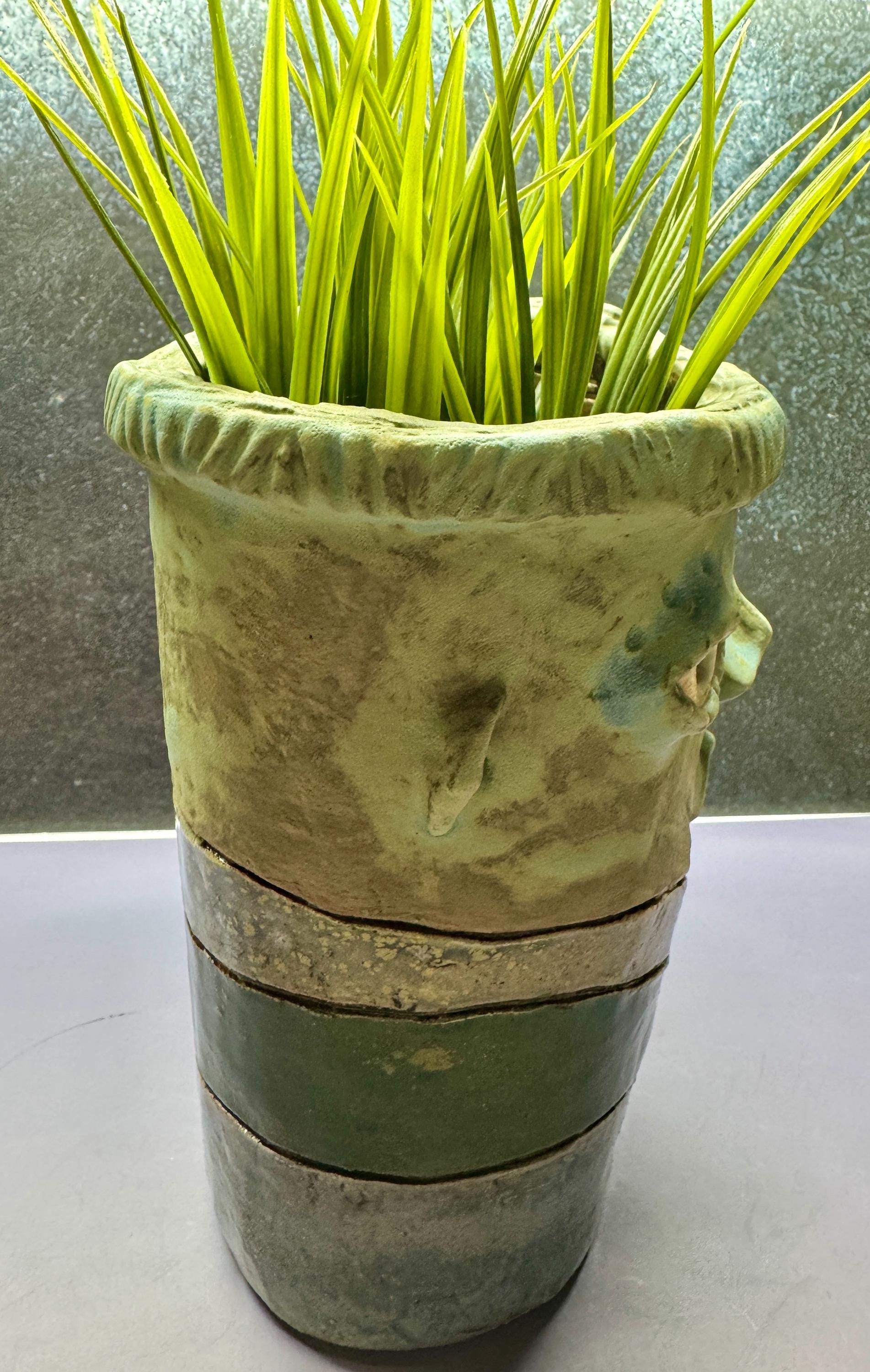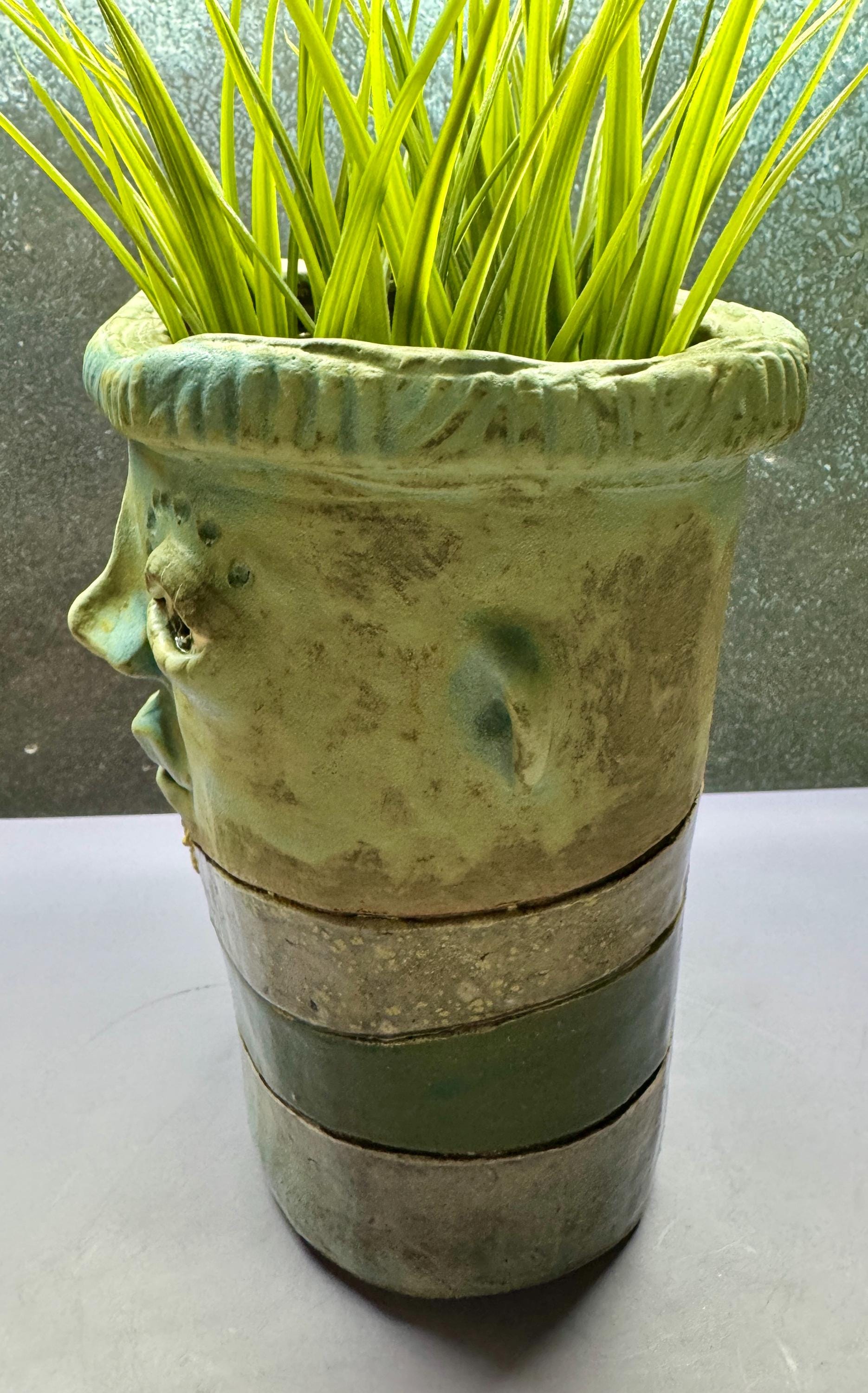 This listing is for one handmade ceramic face planter. Each piece has a whimsical face and is high fired to over 2200 degrees so you can place them indoors or out in all but extreme temperatures. These pieces look great with succulents, cat grass or other plant that looks like hair.