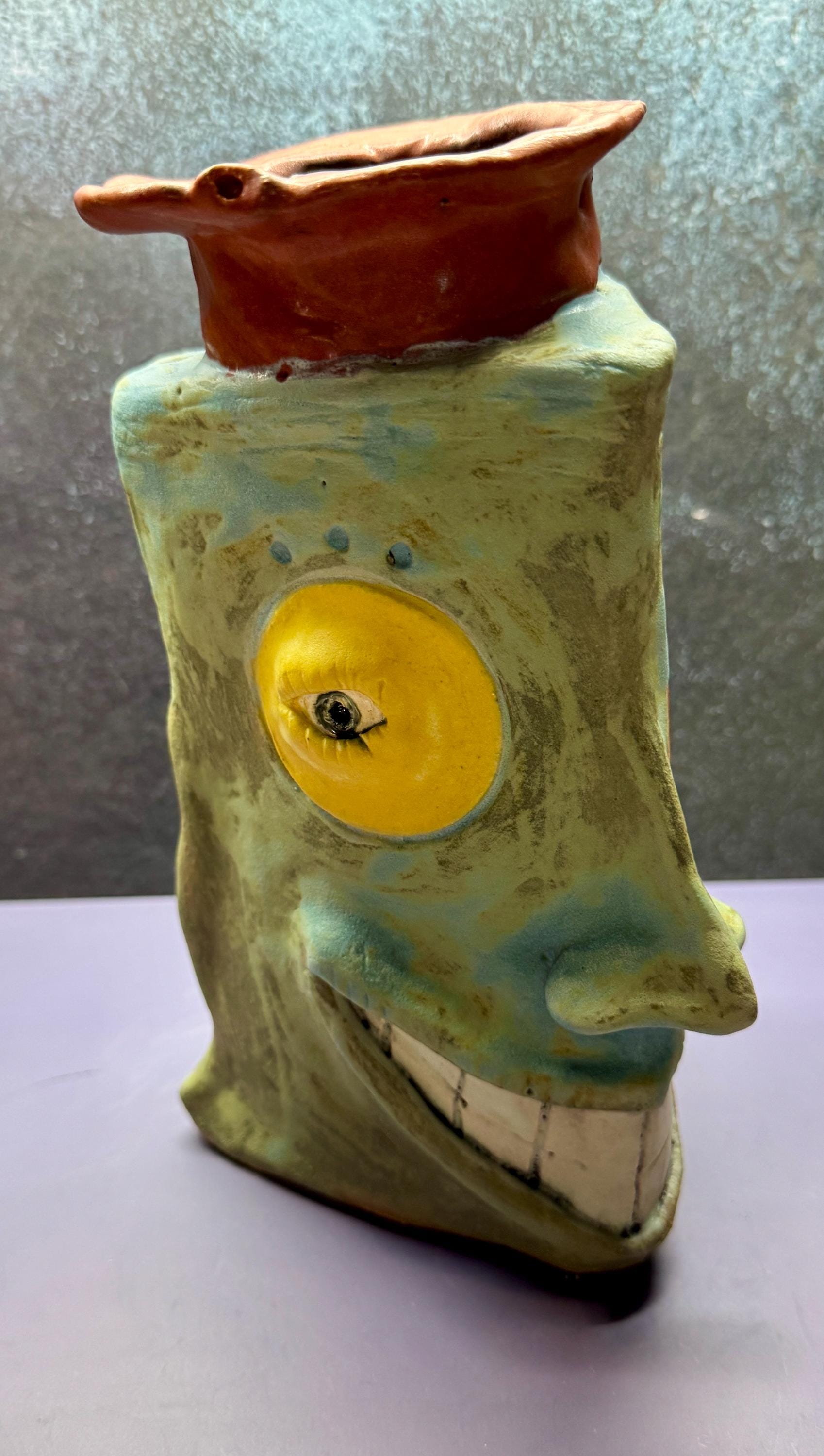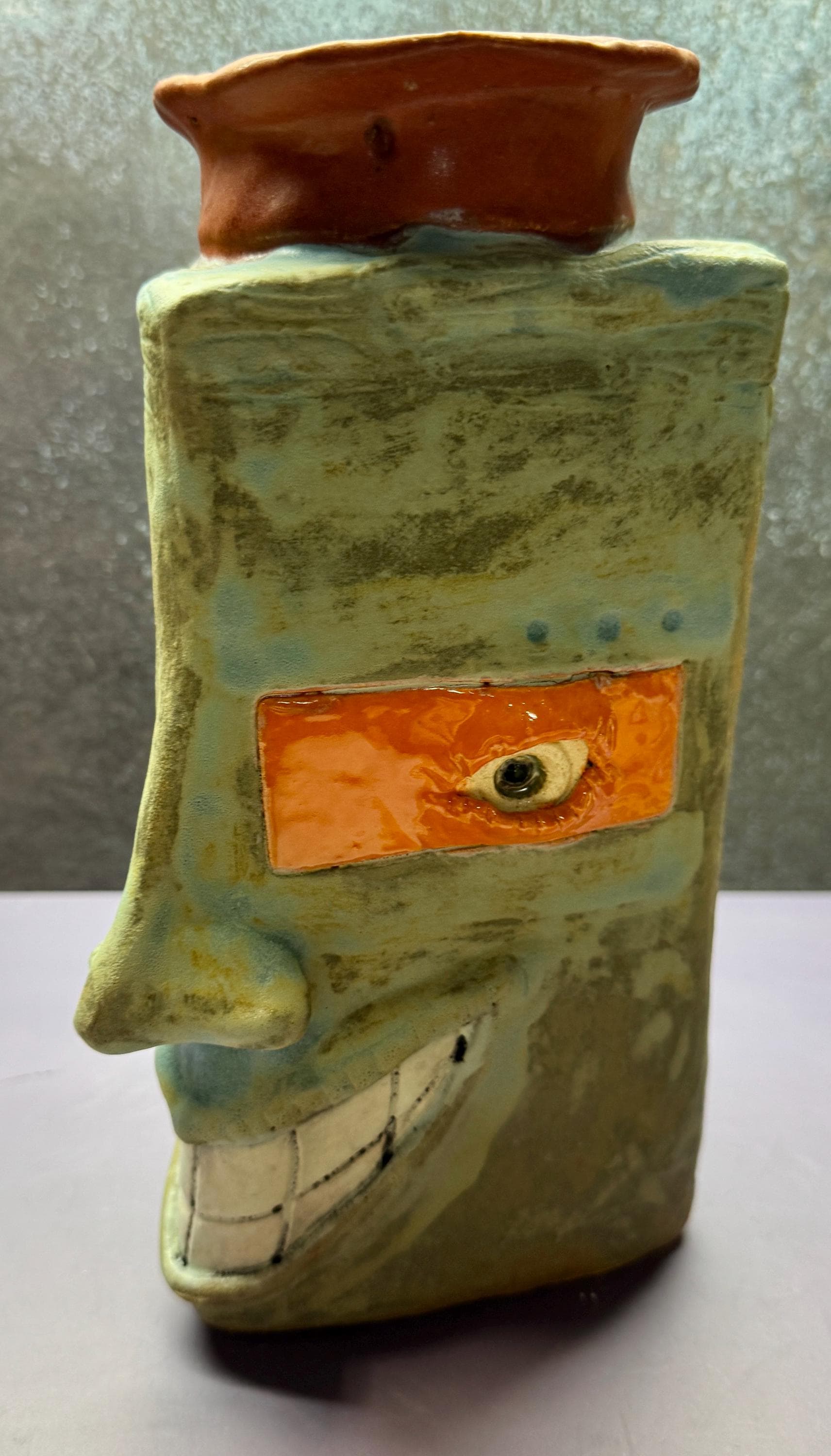 This piece measures approximately 9” tall and 5” wide. It is glazed in a matte antique blue glaze. This piece has yellow and orange glaze around the eyes. This piece has a whimsical Triangle shape and a big ole smile.