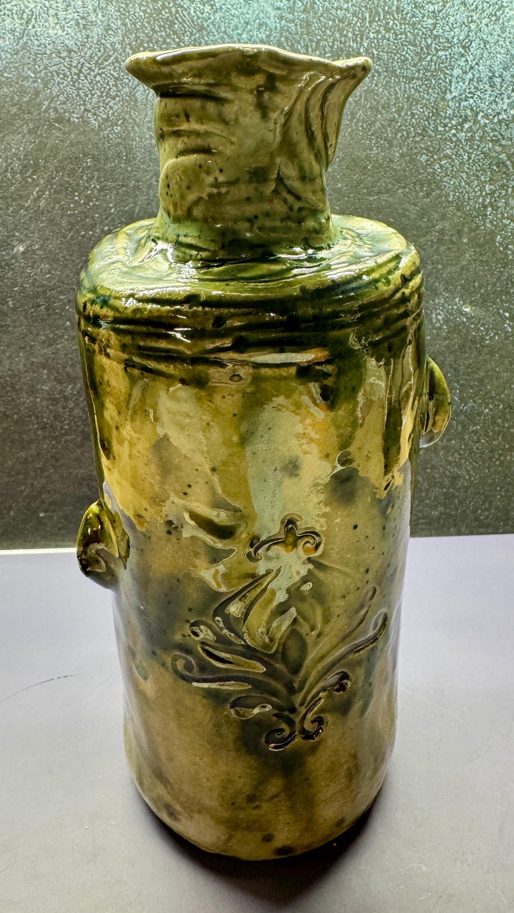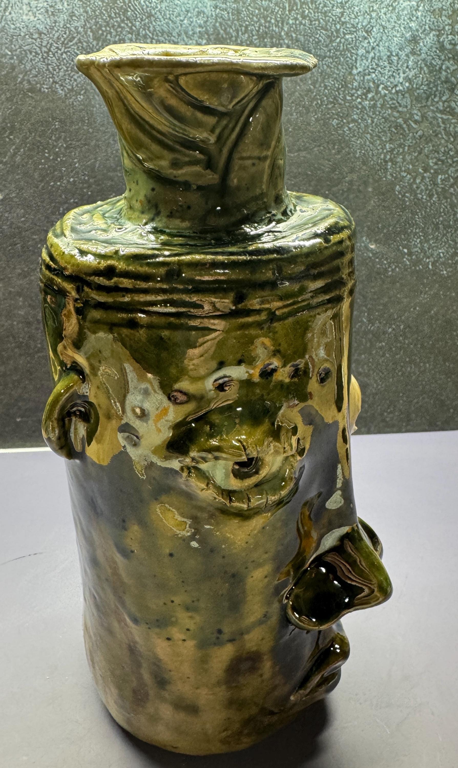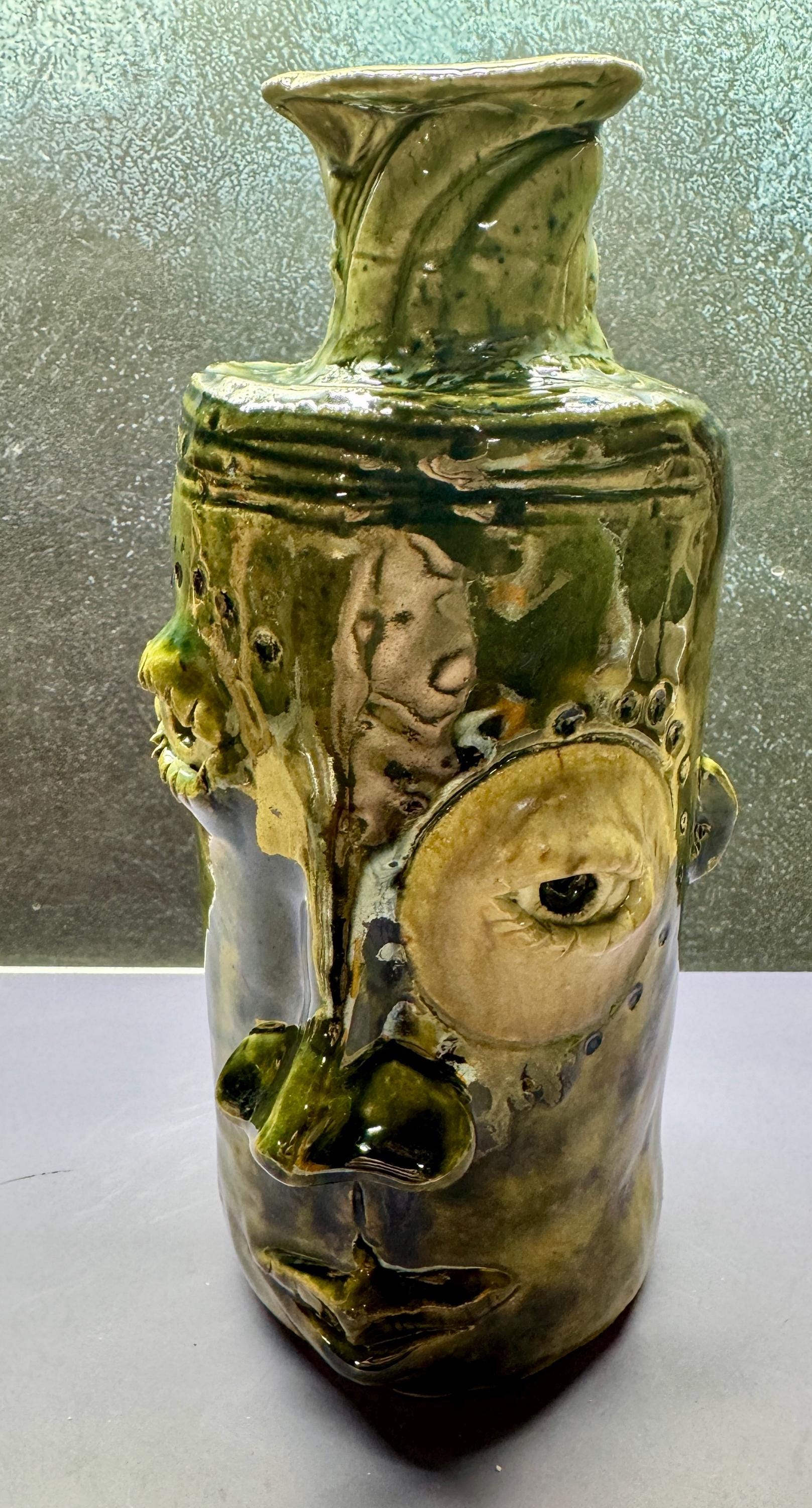 This piece measures approximately 9” tall and 5” wide. It is glazed in various gloss Green glazes. This piece has a matte glaze around the eye.