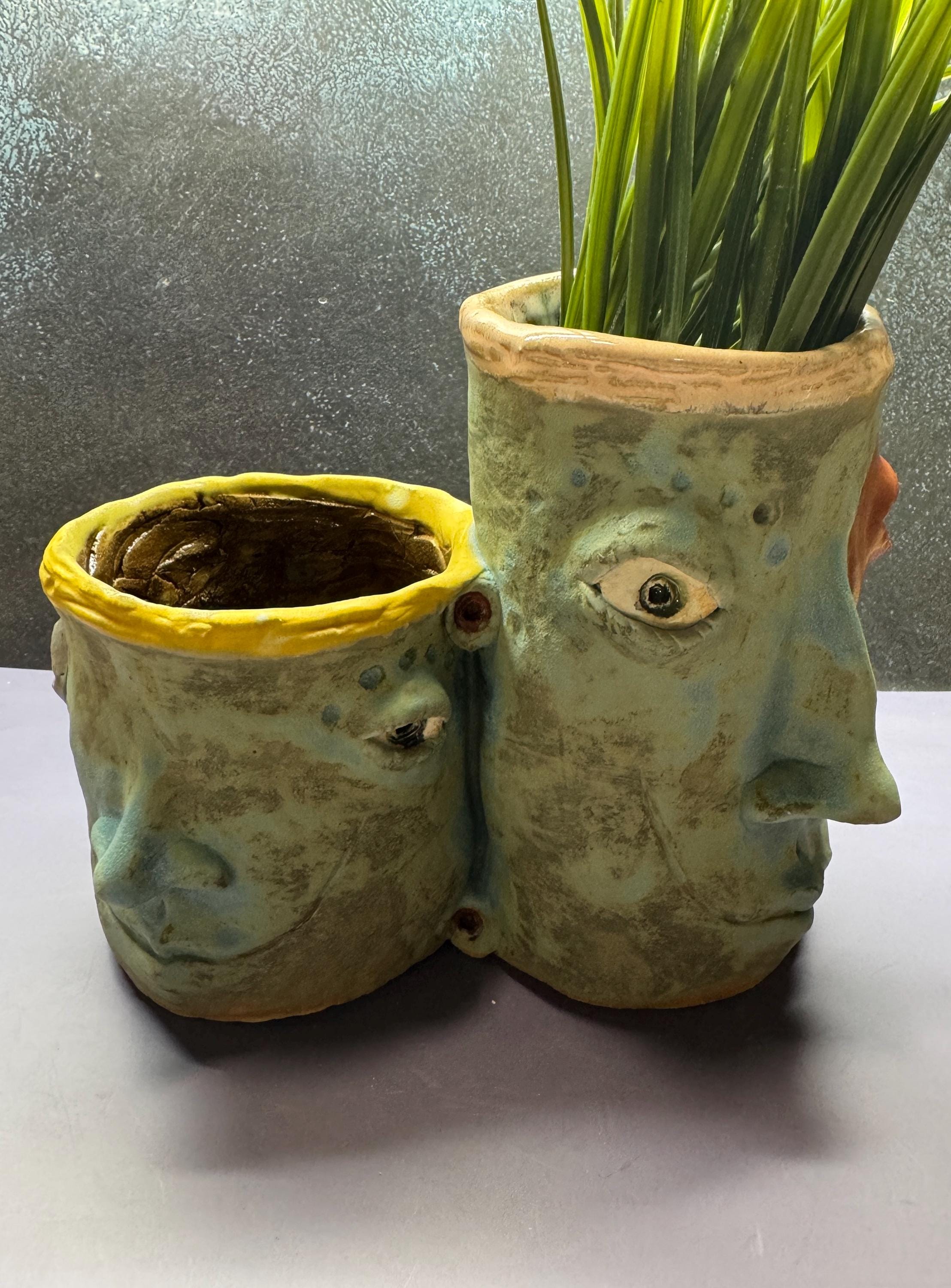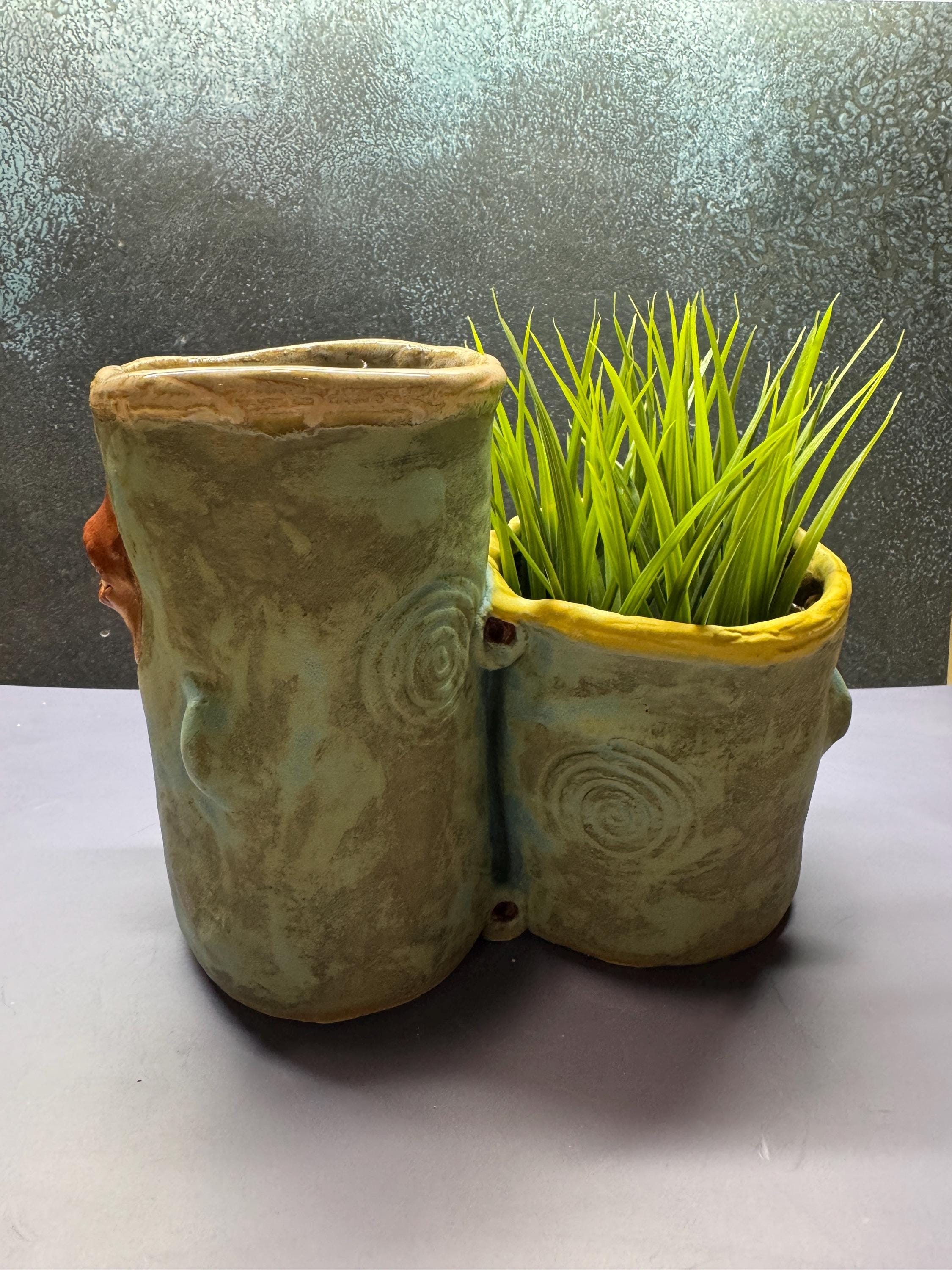 This listing is for one handmade ceramic face planter. Each piece has a whimsical face and is high fired to over 2200 degrees so you can place them indoors or out in all but extreme temperatures. These pieces look great with succulents, cat grass or other plant that looks like hair.