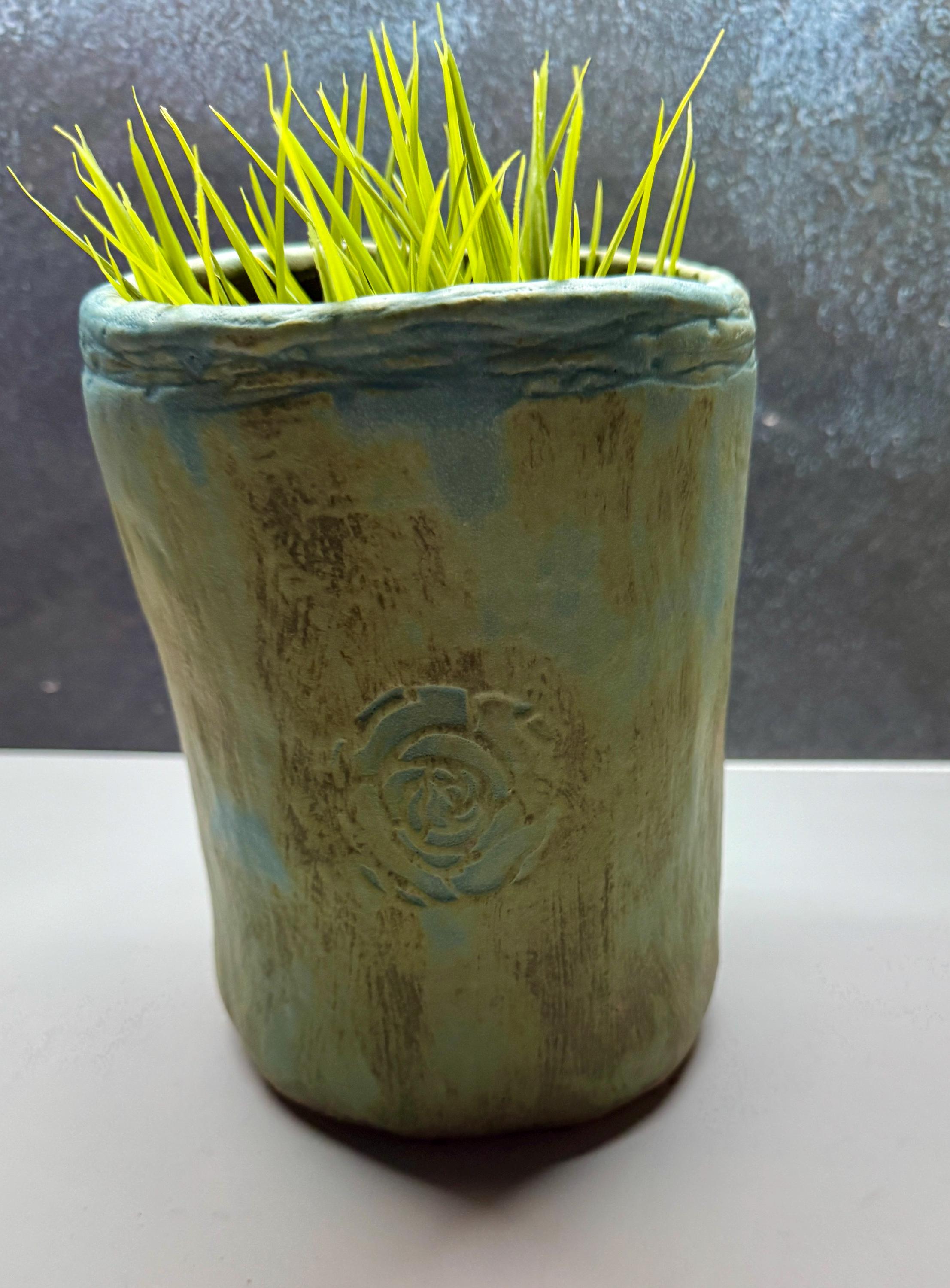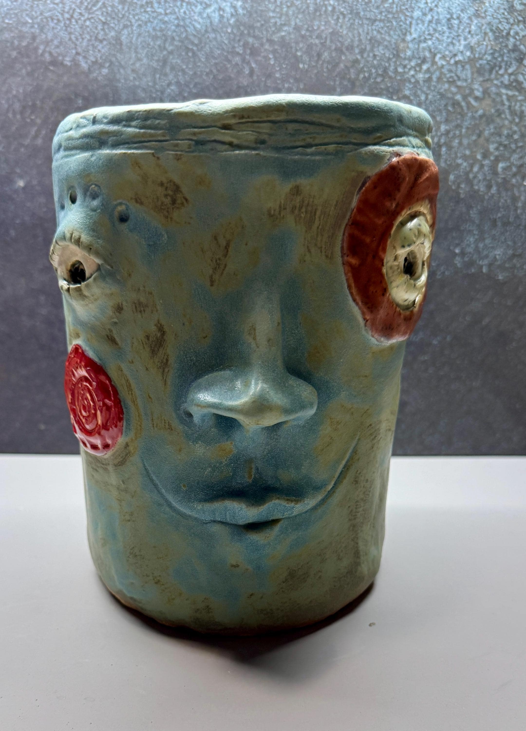 This piece measures approximately 7” tall and 6” wide. It is glazed in a matte glazed called Dusty Blue. This piece has red flower accents.