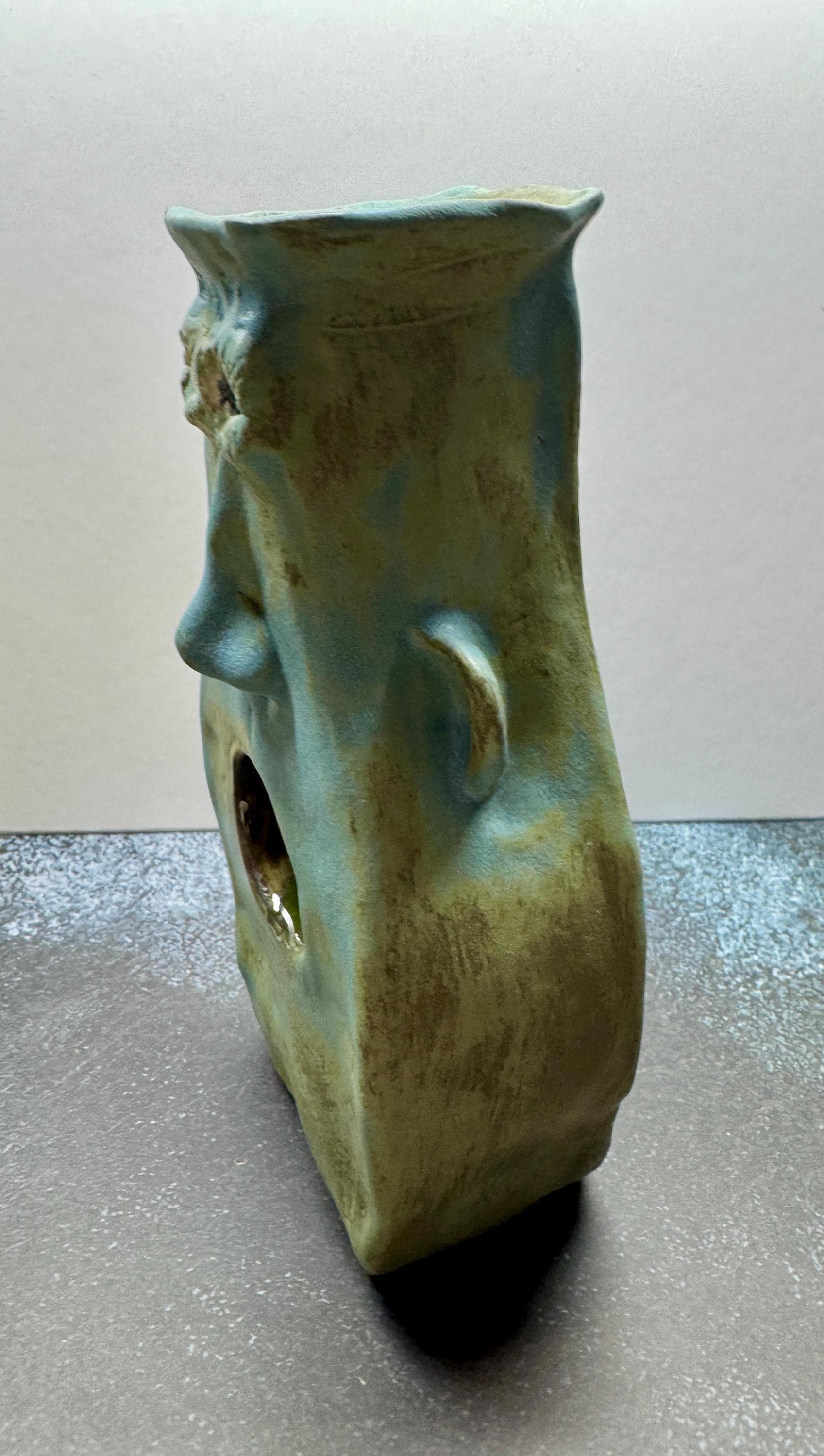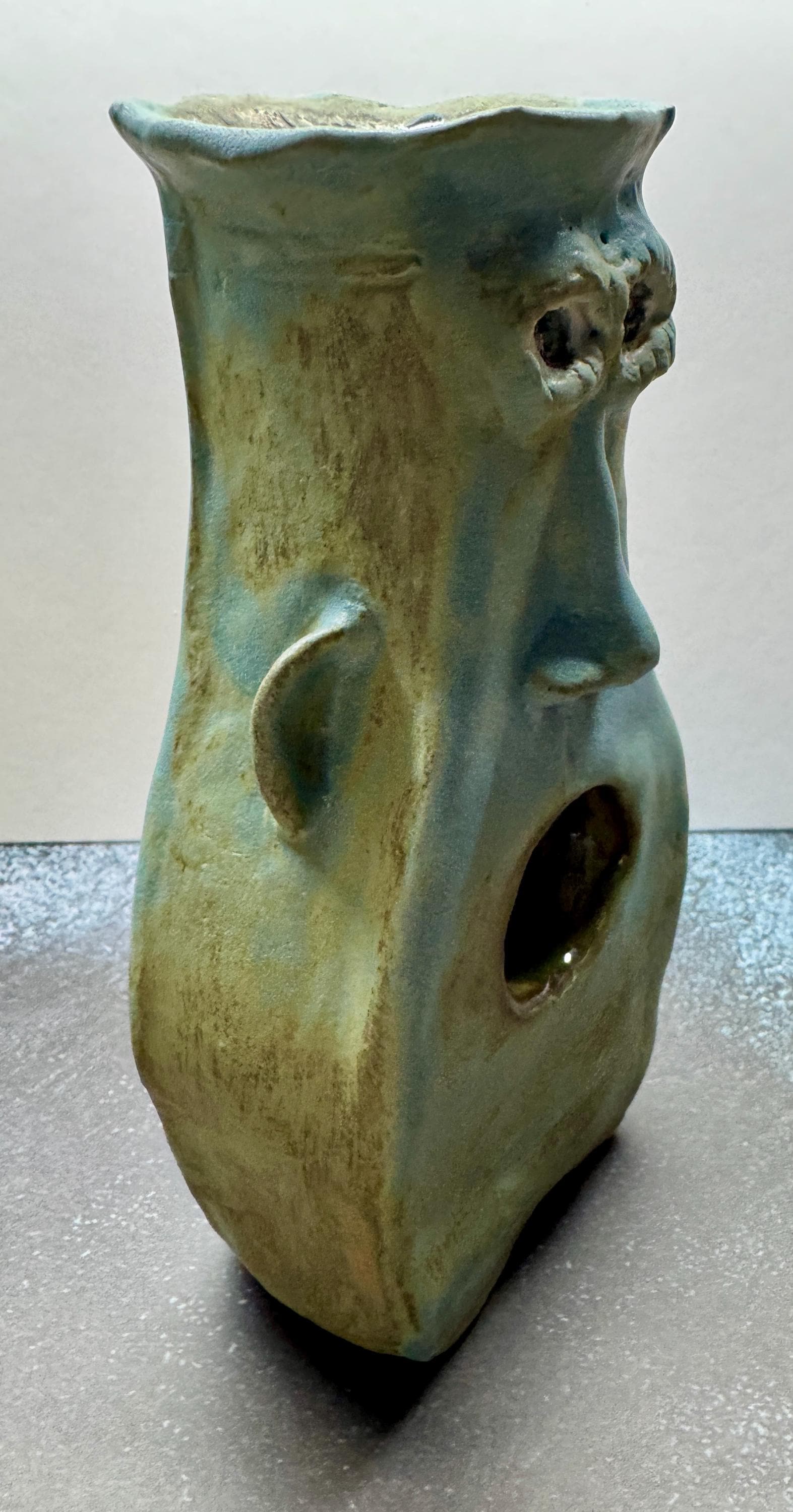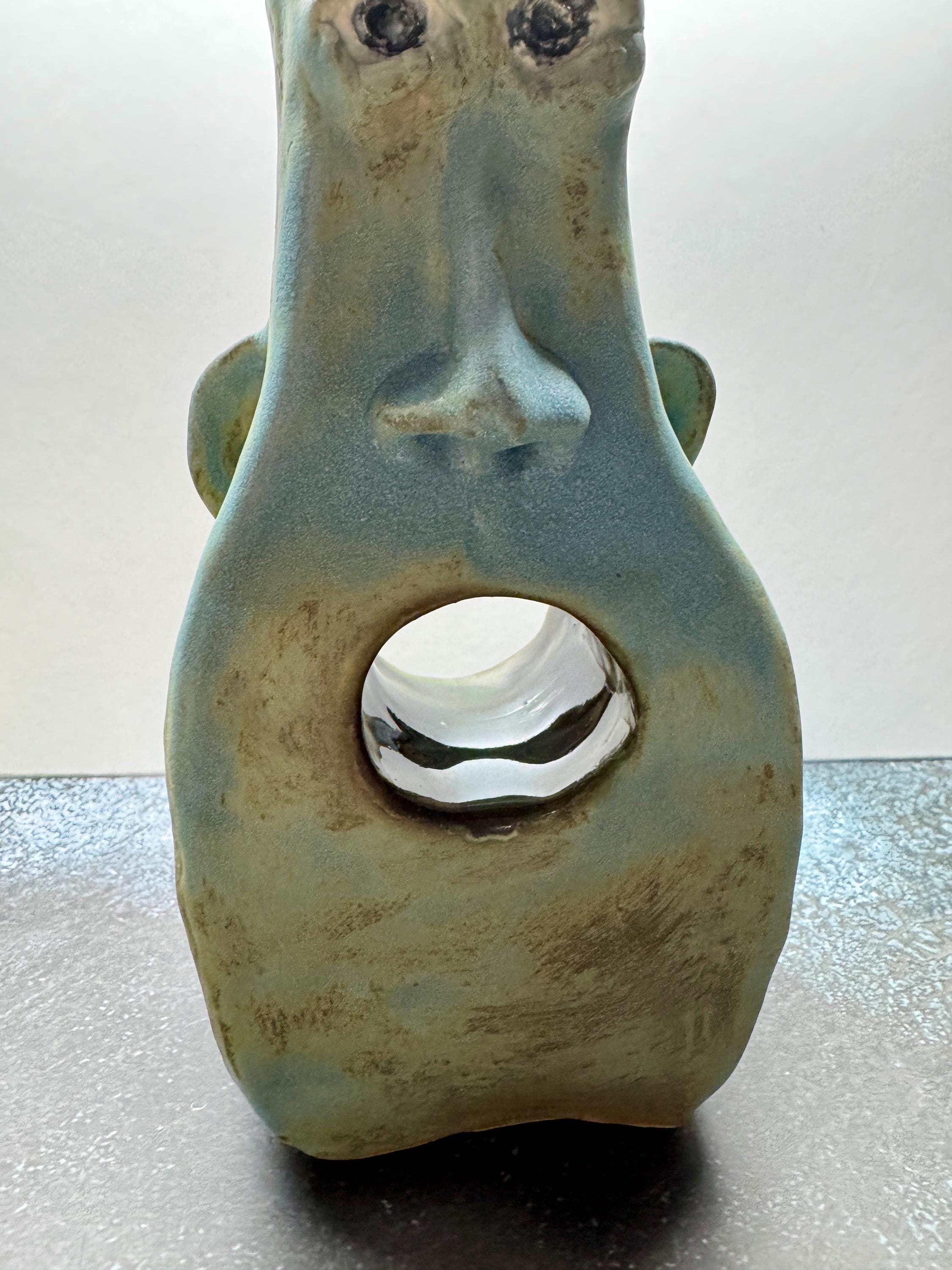 This piece measures approximately 9” tall and 5” wide and 3 “ thick. It is glazed in a various blue glazes. This piece features a hole for a mouth that goes all the way through.