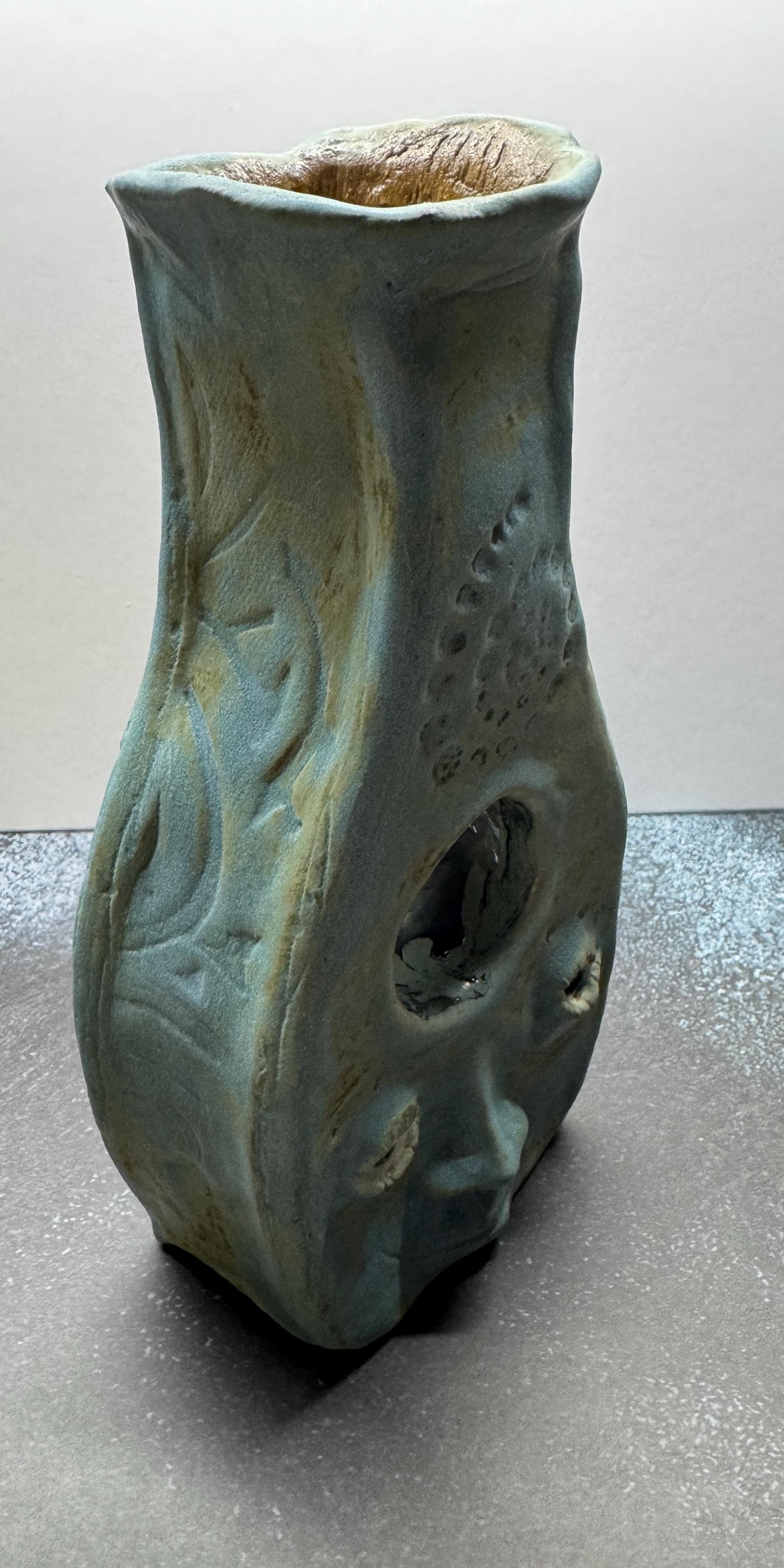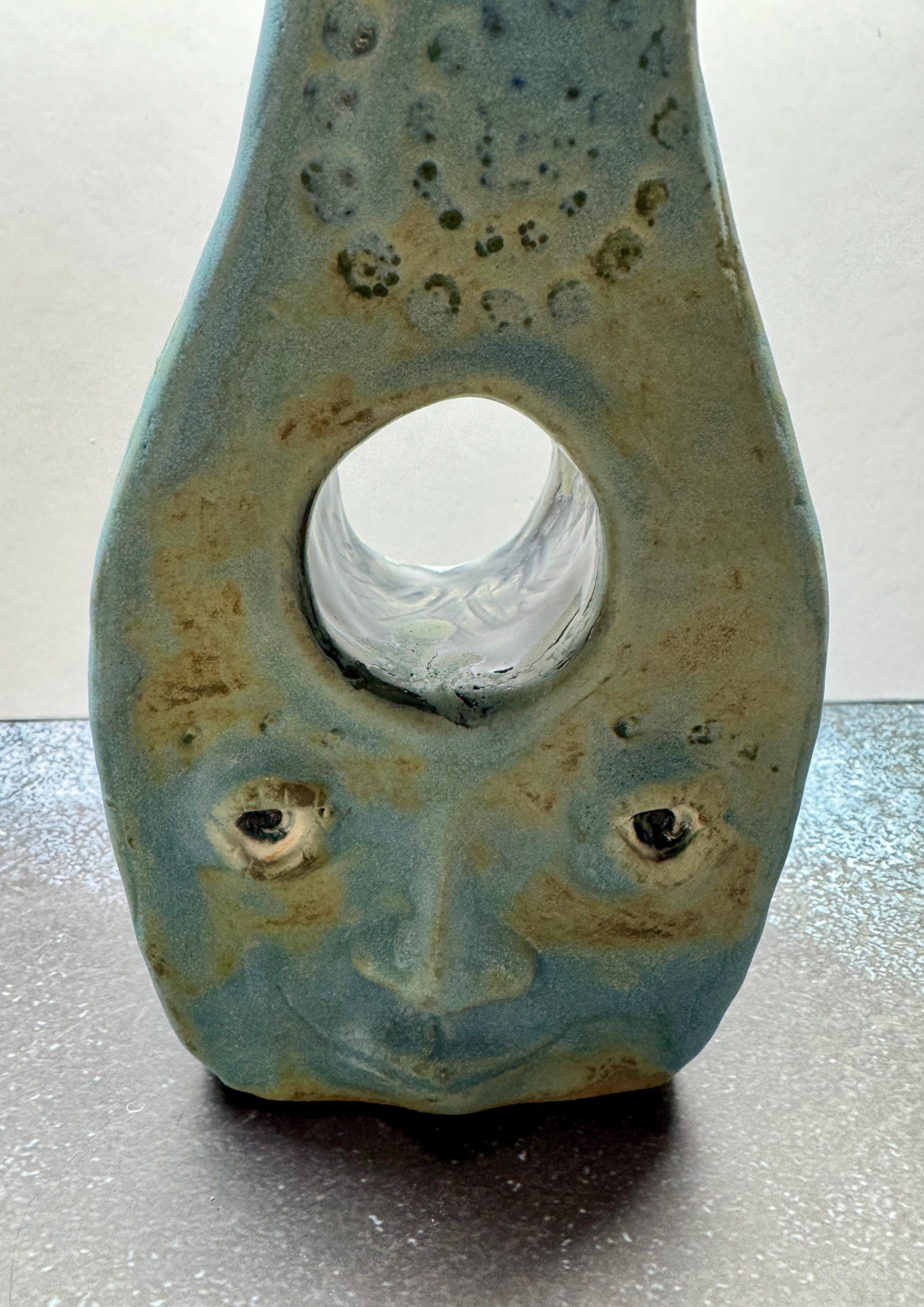 This piece measures approximately 9” tall and 5” wide and 3 “ thick. It is glazed in a various blue glazes. This piece features a hole for a mouth that goes all the way through.
