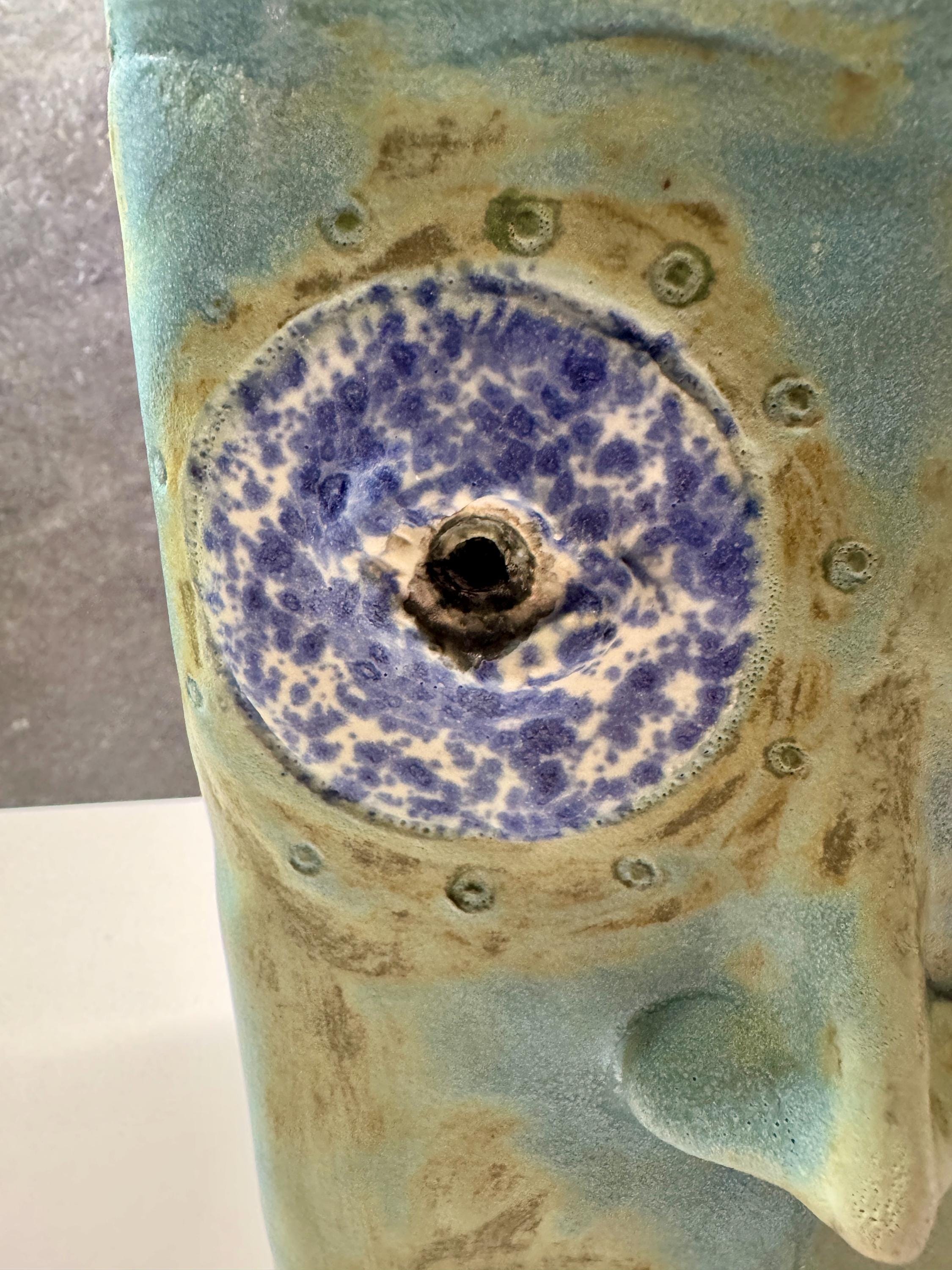 This piece measures approximately 10” tall and 7” wide. It is glazed in a matte antique blue glaze. This piece various accents around the eyes.