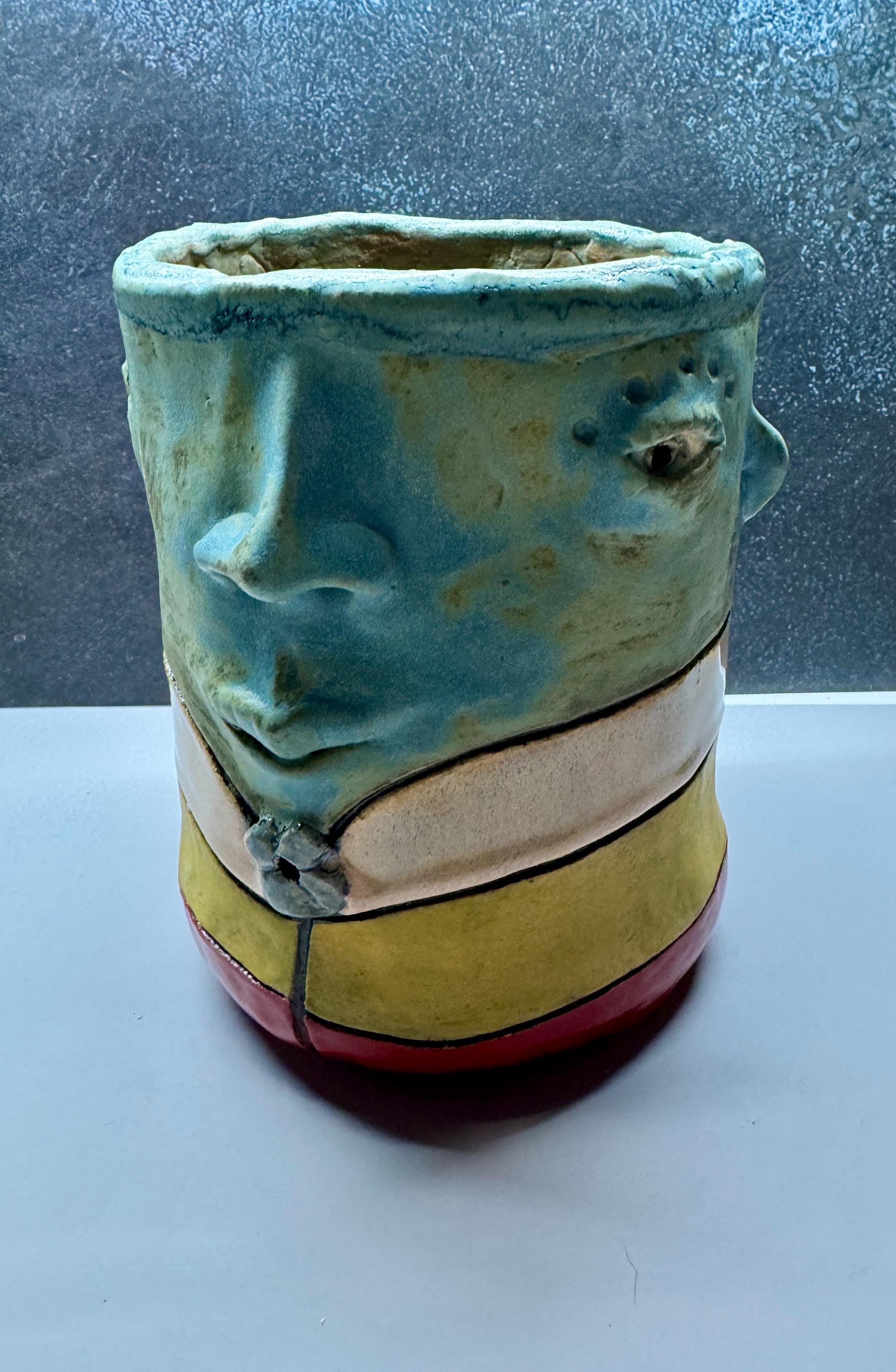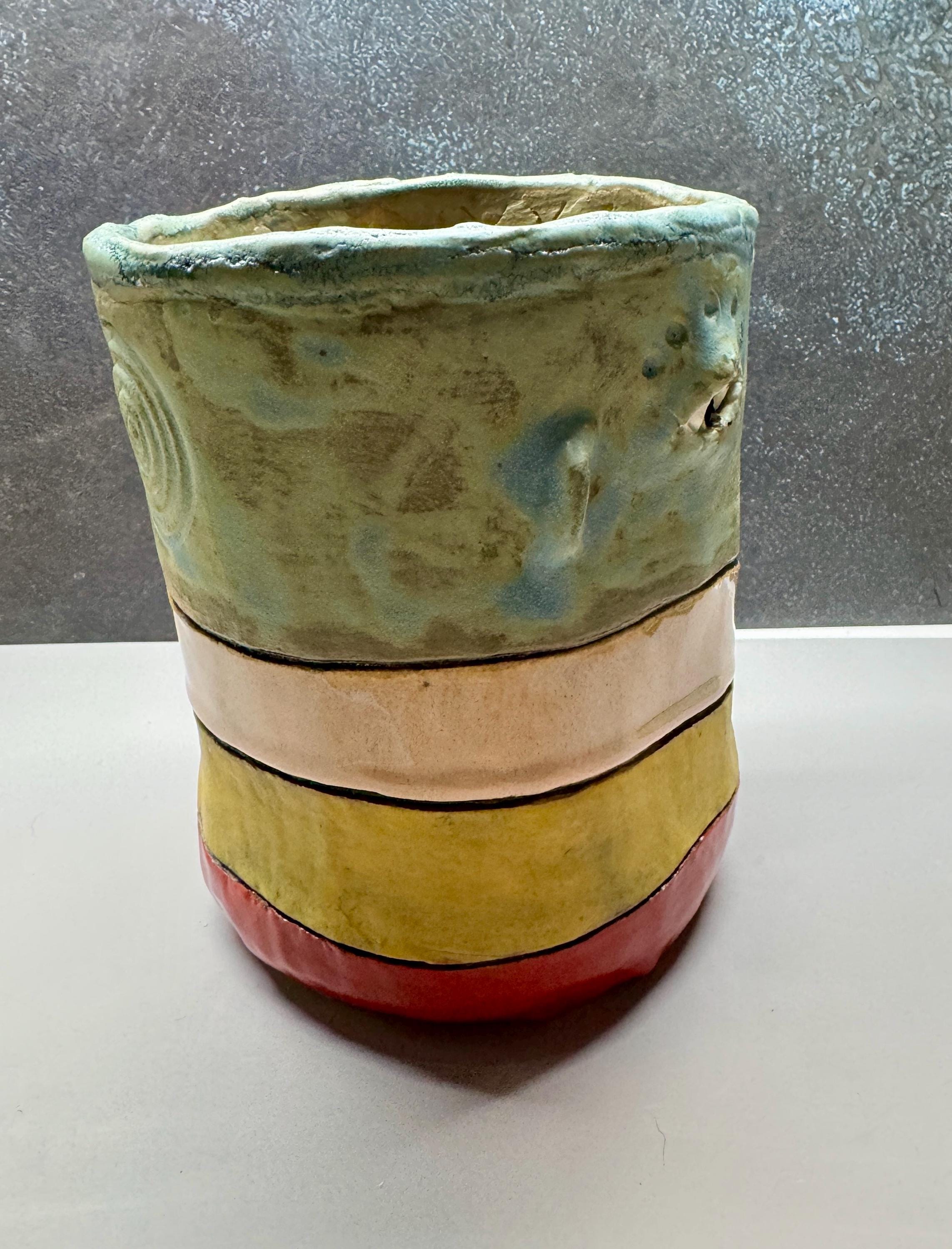 This piece measures approximately 7” tall and 6” wide. It is glazed in a matte glazed called Dusty Blue. This piece has stripes in various colors.