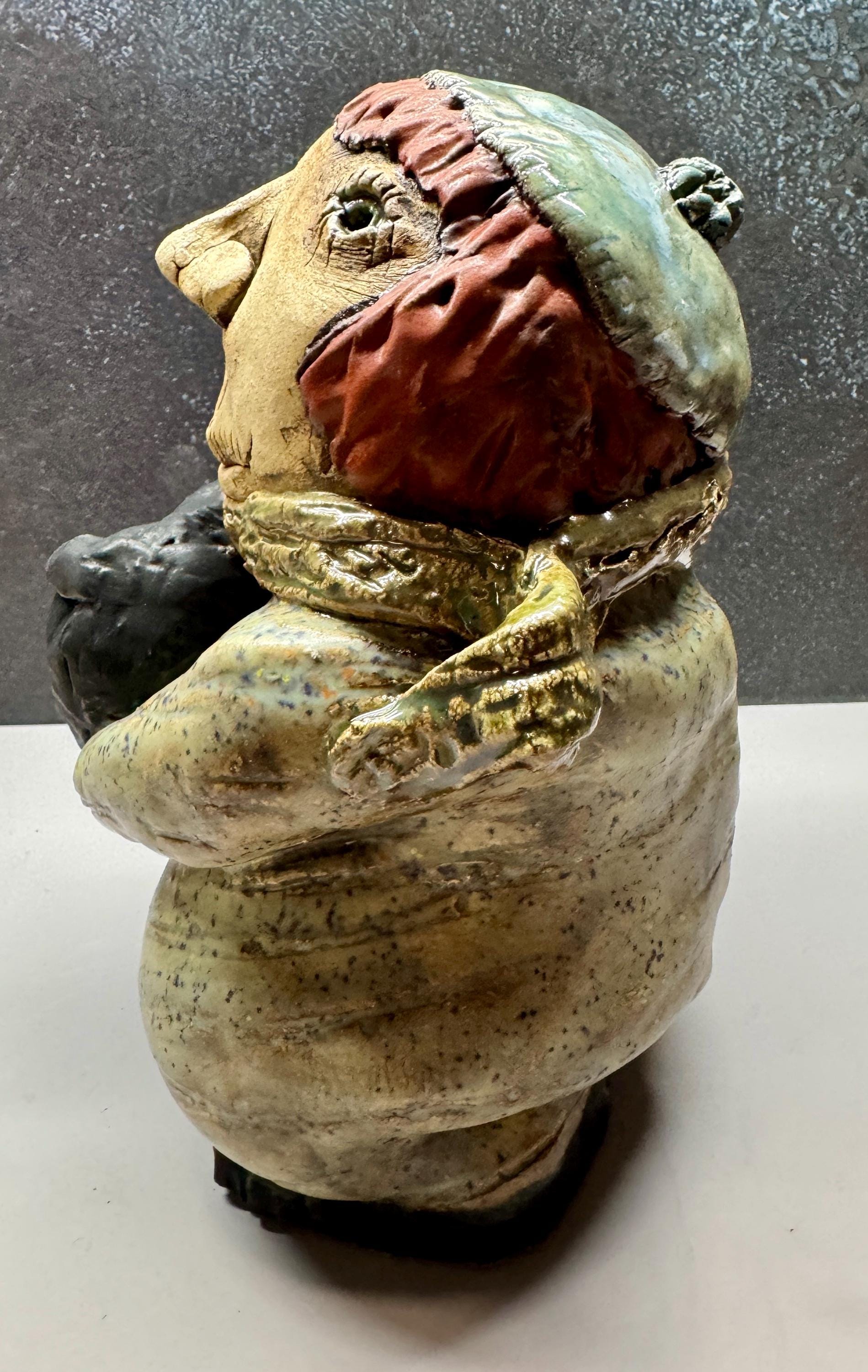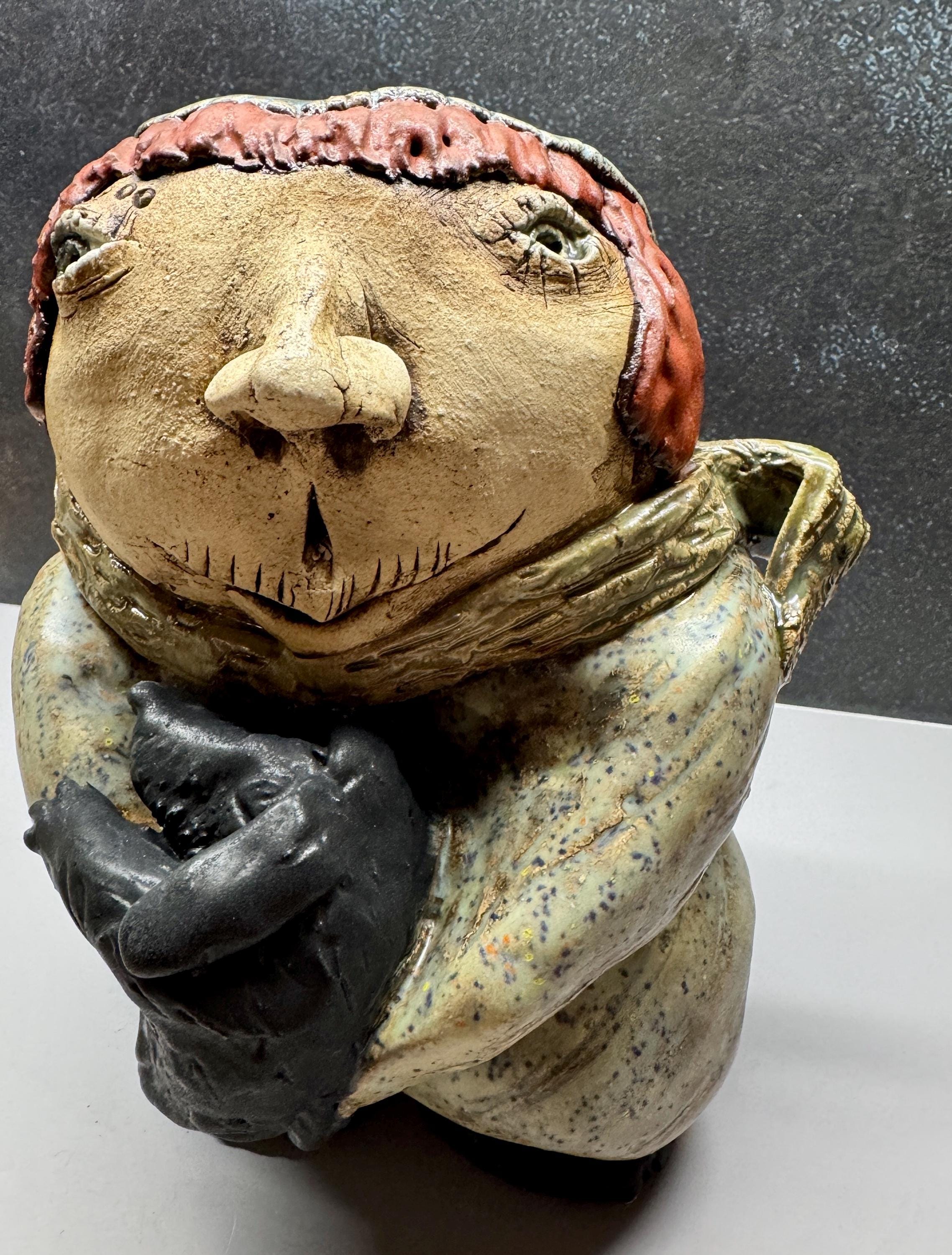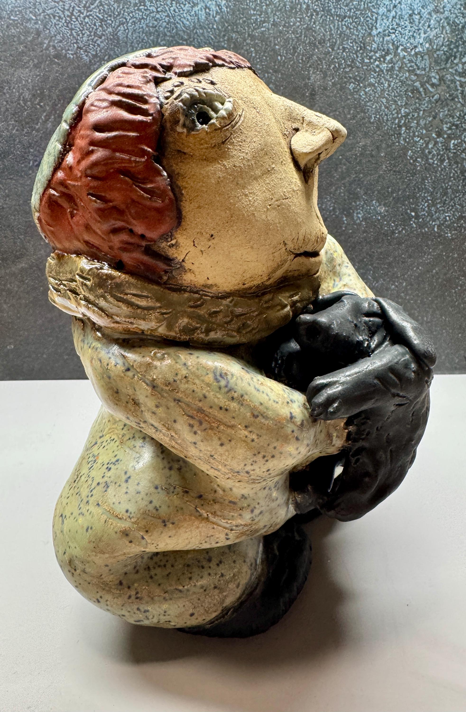 This listing is for a handmade ceramic face sculpture. This piece measures approximately 8” tall and 6” wide. It is glazed in a mix of glazes and features a child holding their puppy dog.