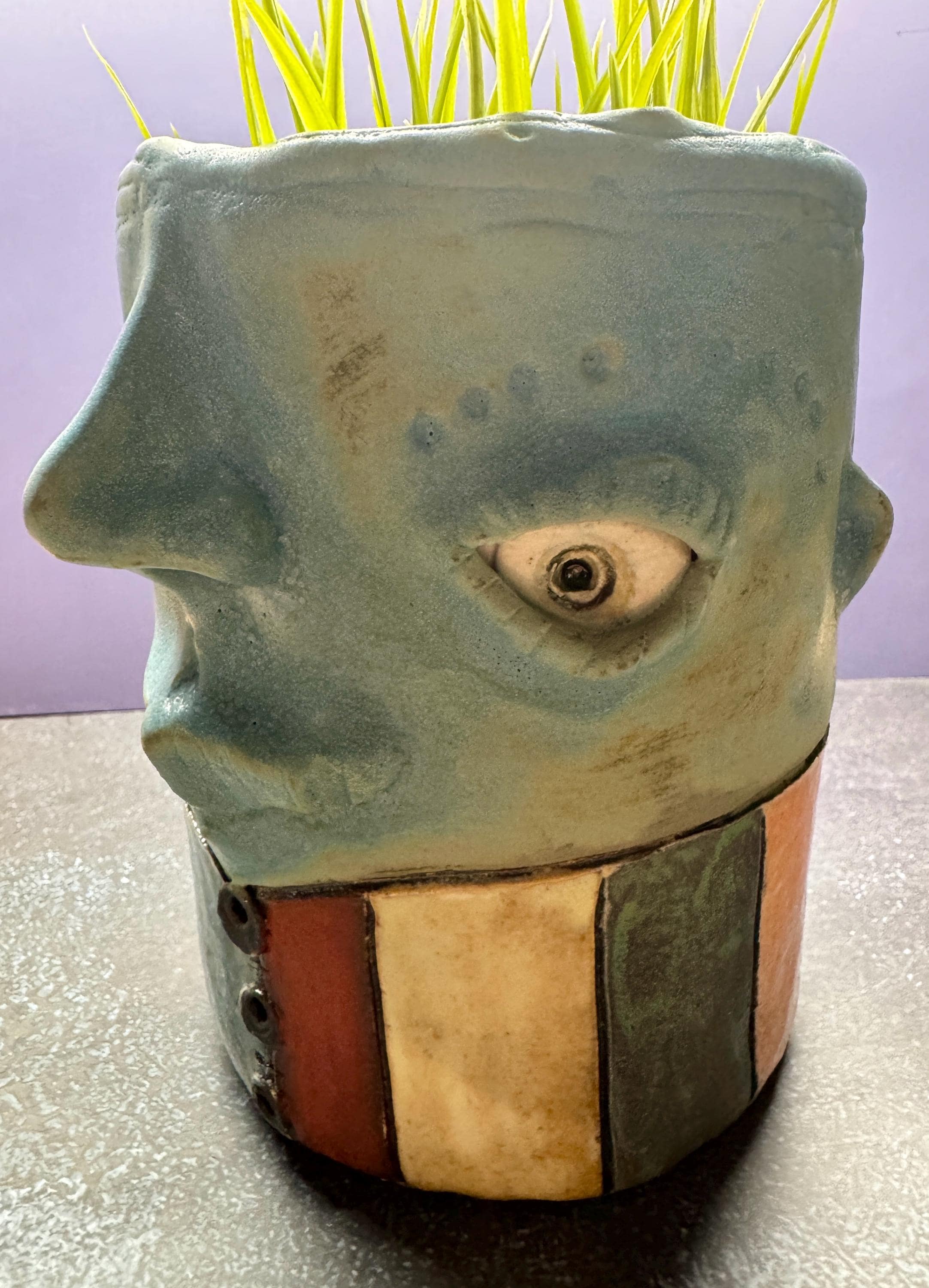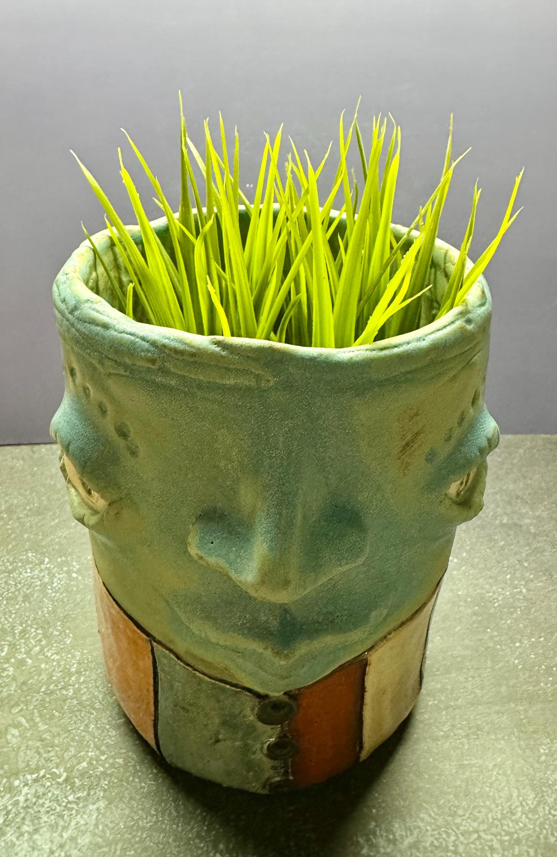 This listing is for one handmade ceramic face planter. Each piece has a whimsical face and is high fired to over 2200 degrees so you can place them indoors or out in all but extreme temperatures. These pieces look great with succulents, cat grass or other plant that looks like hair.