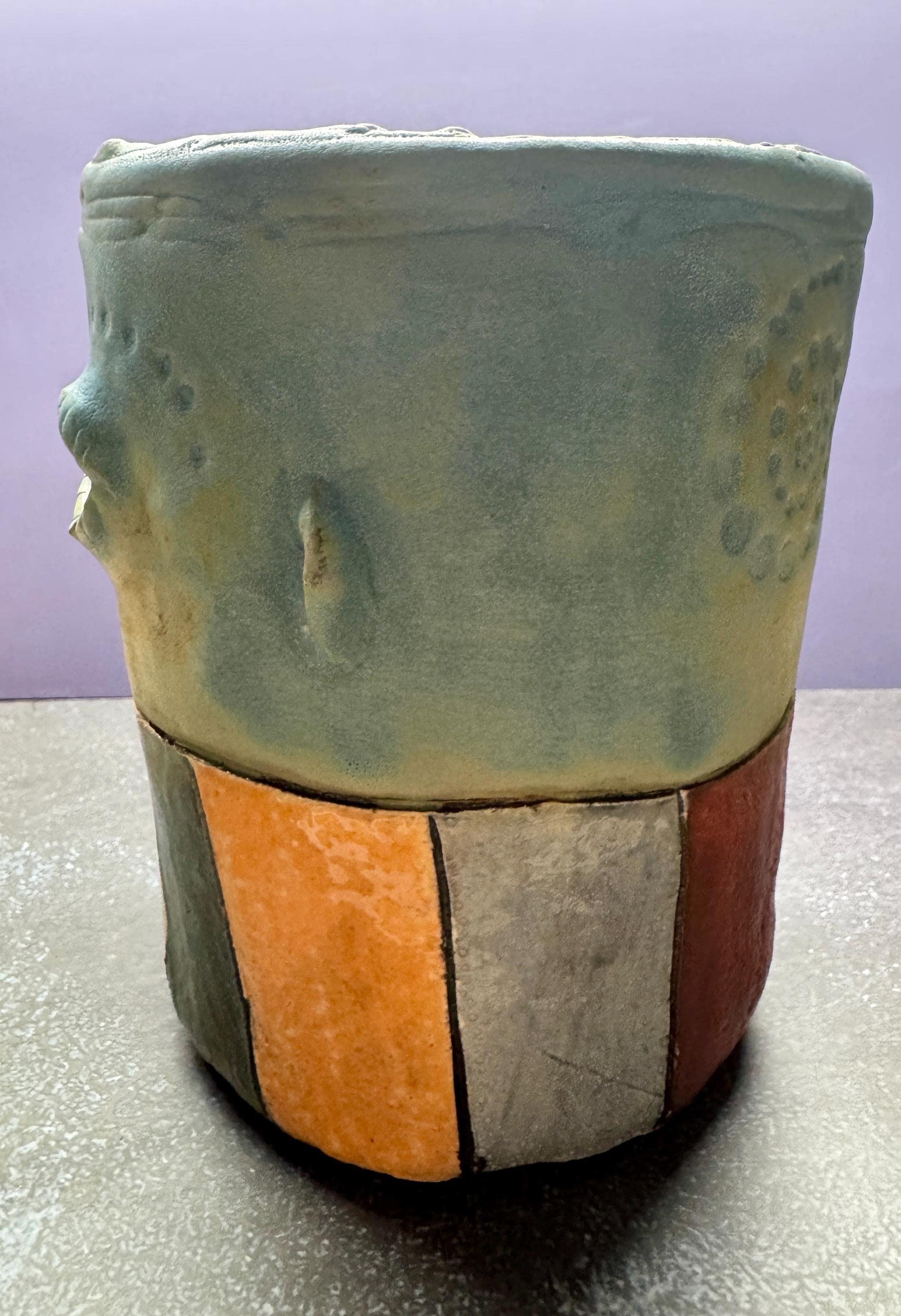 This piece measures approximately 7” tall and 6” wide. It is glazed in a matte glazed called Dusty Blue. This piece has stripes in various colors.