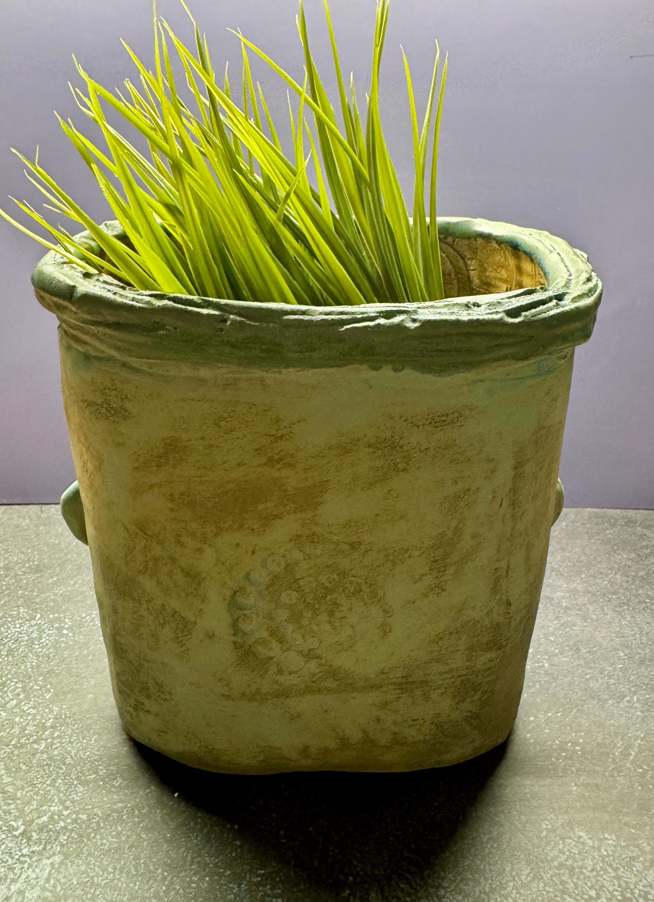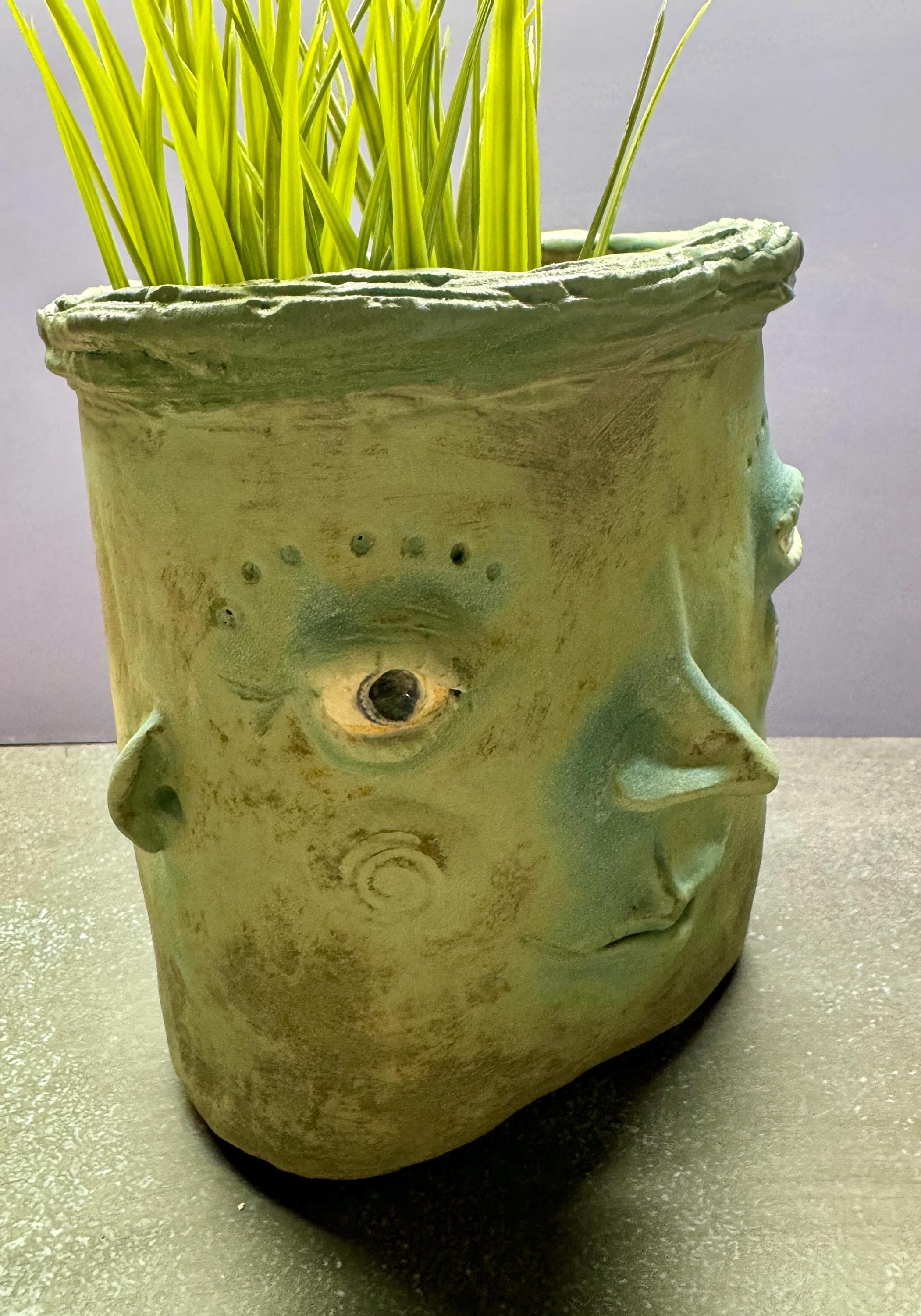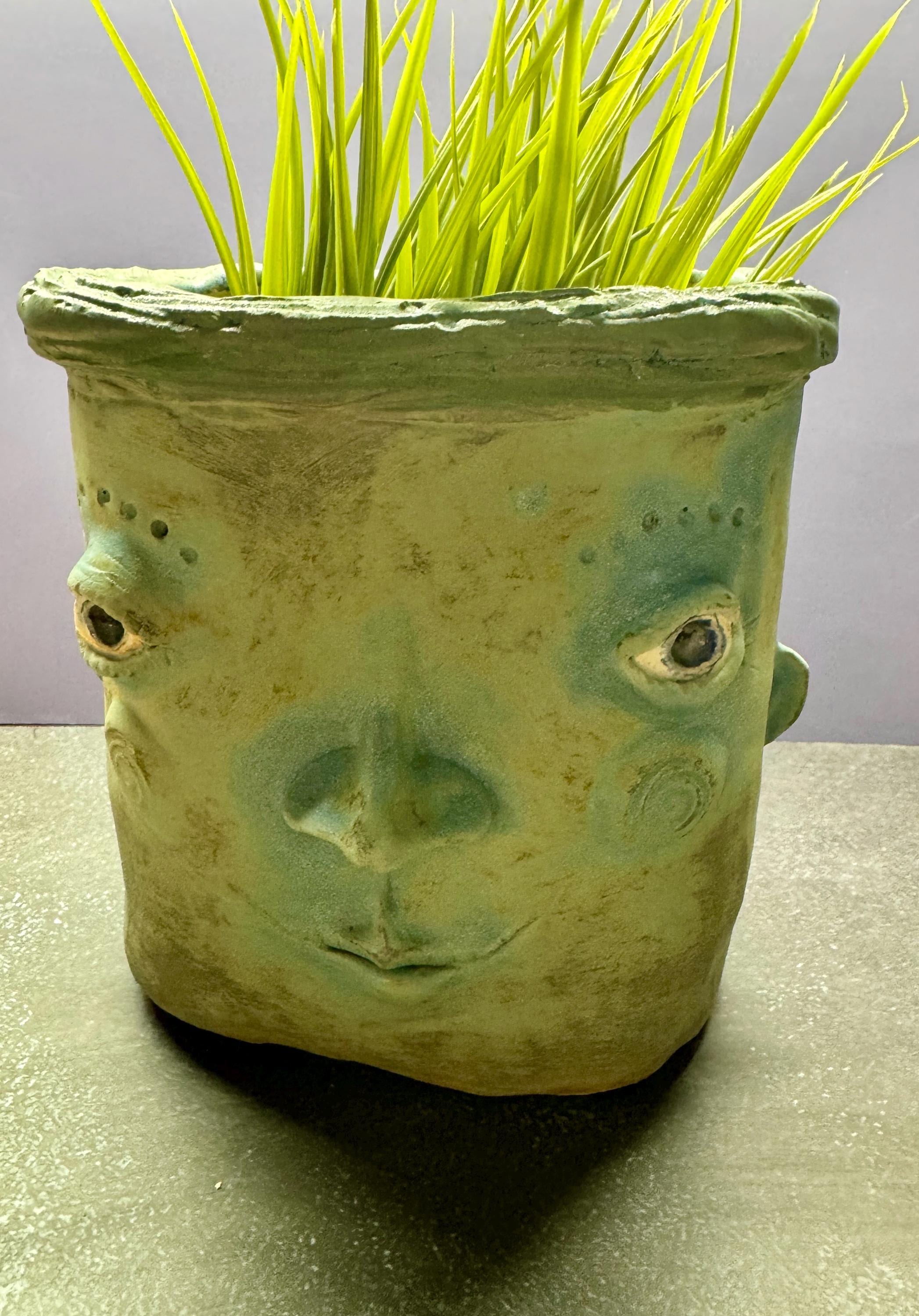 This listing is for one handmade ceramic face planter. Each piece has a whimsical face and is high fired to over 2200 degrees so you can place them indoors or out in all but extreme temperatures. These pieces look great with succulents, cat grass or other plant that looks like hair.