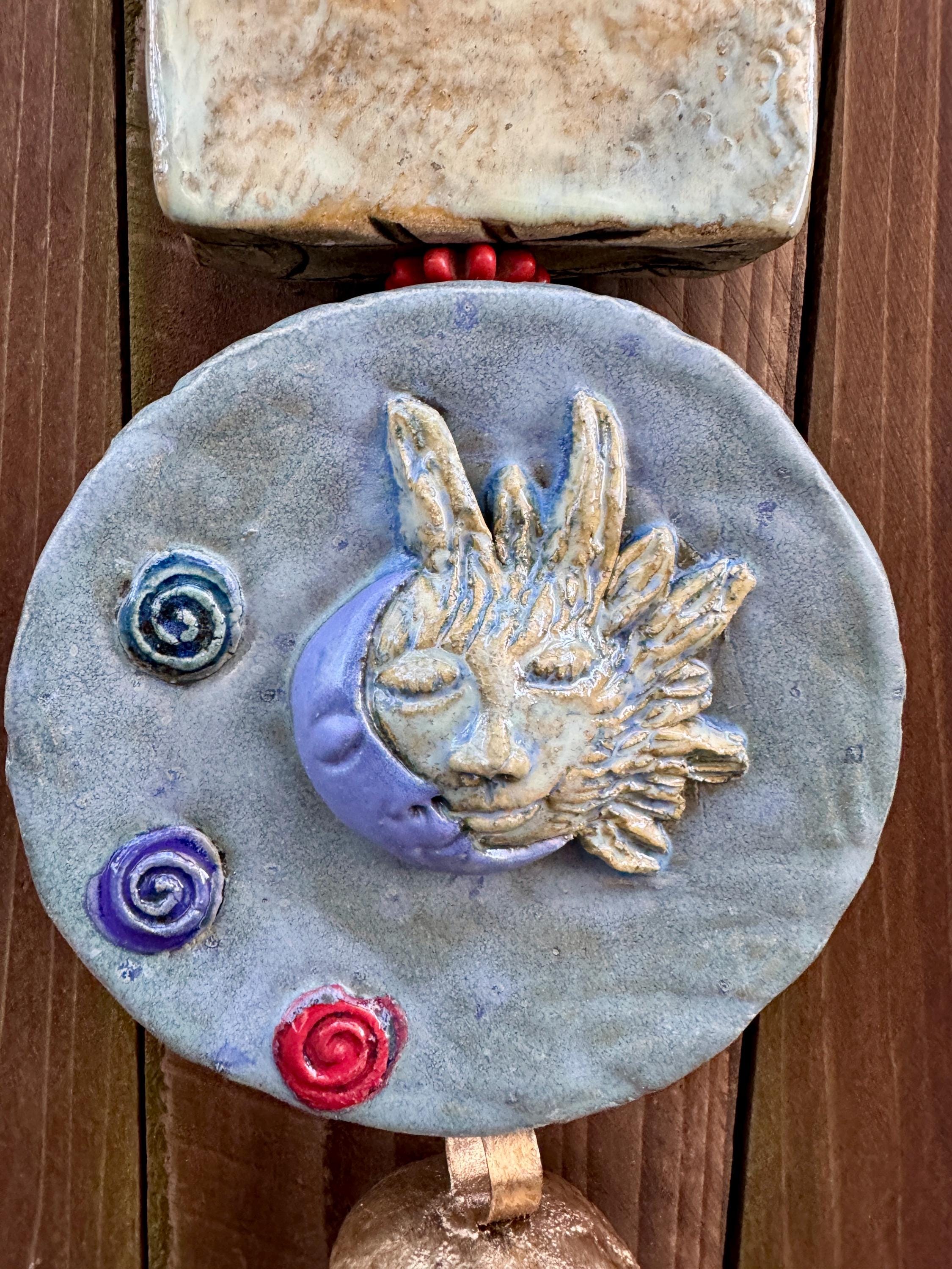 This piece features several clay pieces joined together. These pieces measure approximately 24” long and approx. 6” wide. It is glazed in various colors and has a beautiful bell at the bottom.