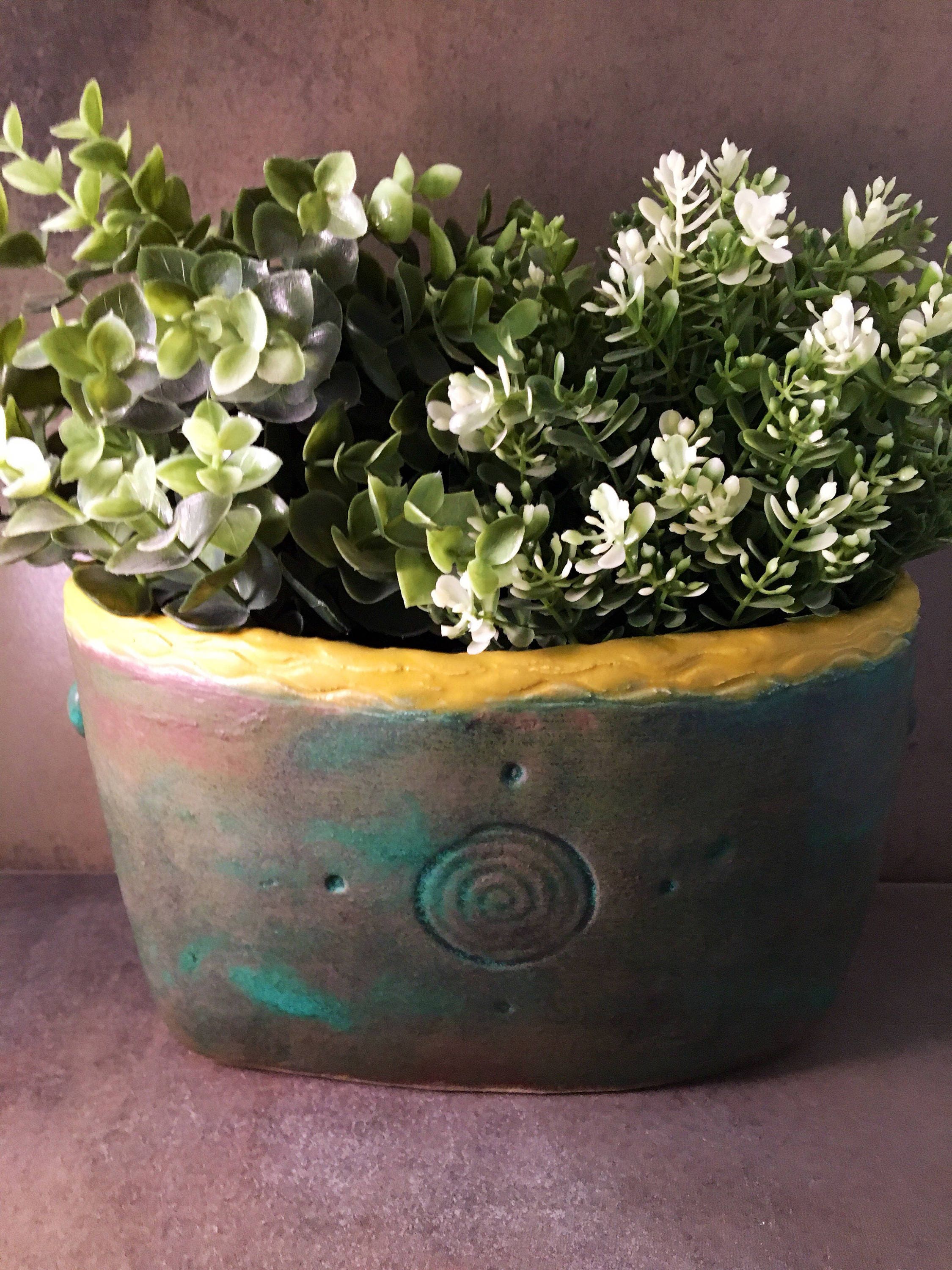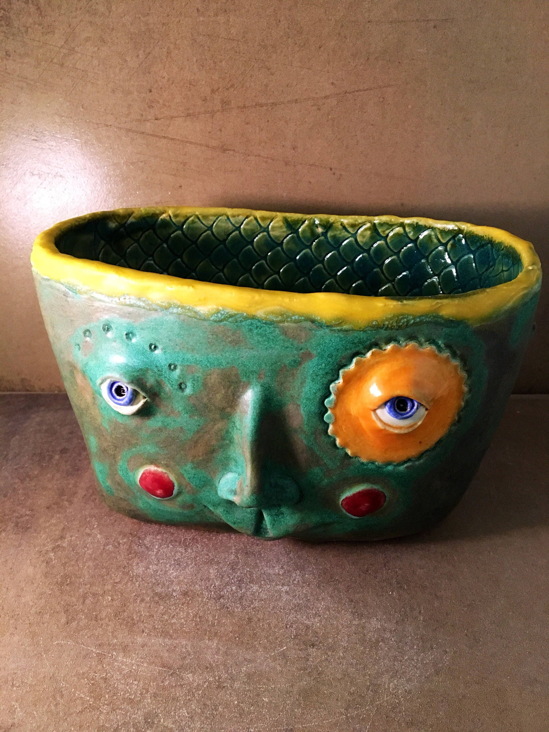 This listing is for one medium handmade ceramic face planter. Each piece has a whimsical face and is high fired to over 2200 degrees so you can place them indoors or out in all but extreme temperatures. These pieces look great with succulents, cat grass or other plant that looks like hair.