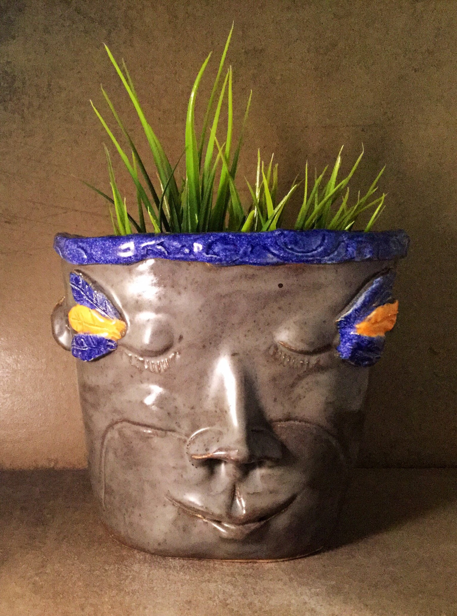 This listing is for one handmade ceramic face planter. Each piece has a whimsical face and is high fired to over 2200 degrees so you can place them indoors or out in all but extreme temperatures. These pieces look great with succulents, cat grass or other plant that looks like hair.
